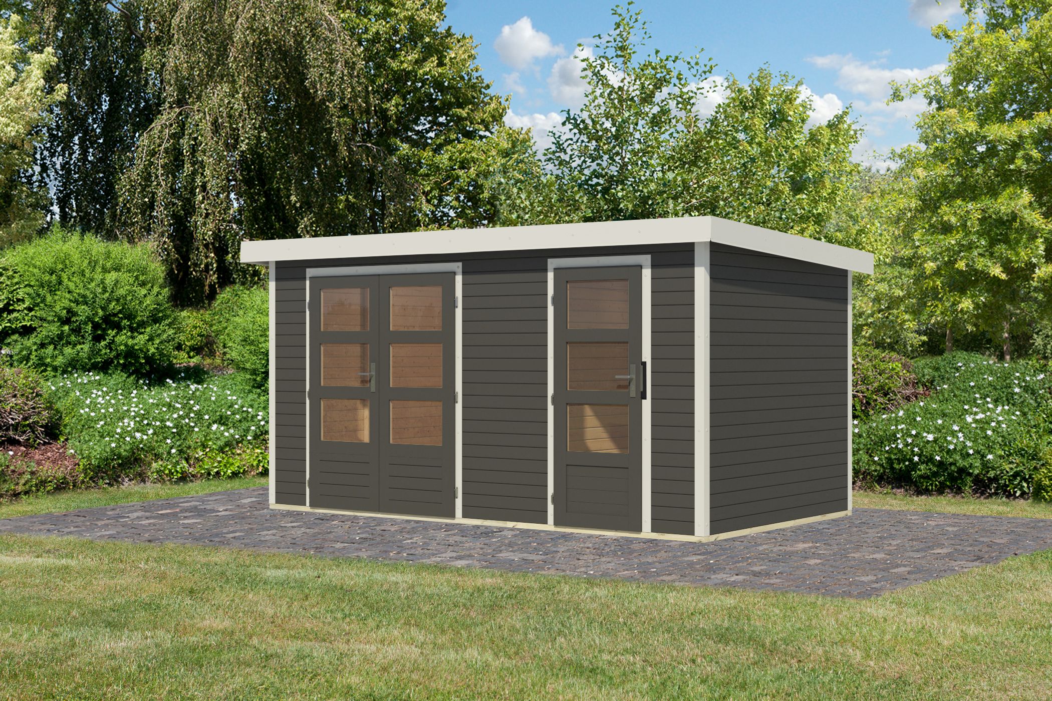 Das Gartenhaus wird in terragrau lackiert geliefert.