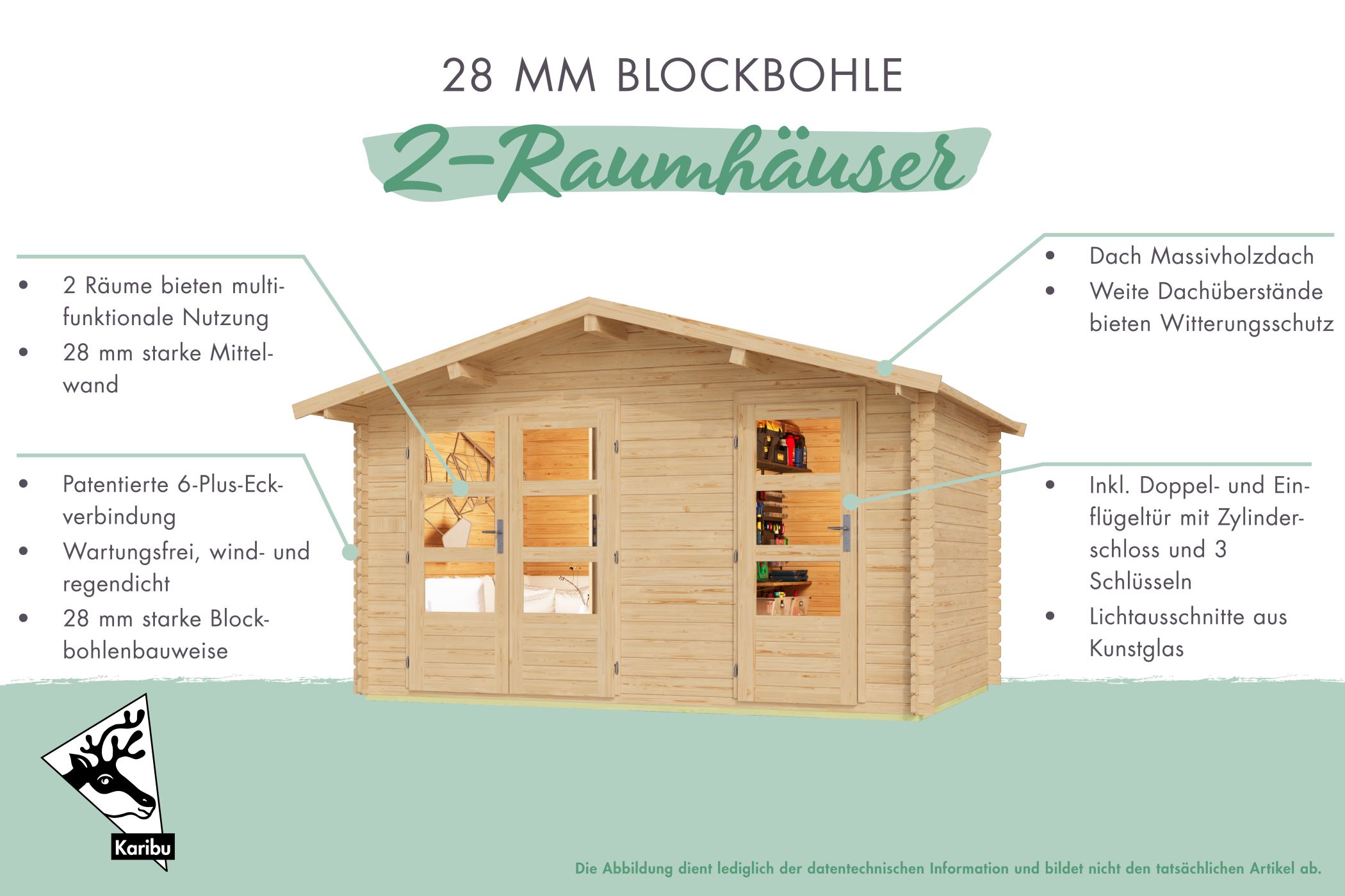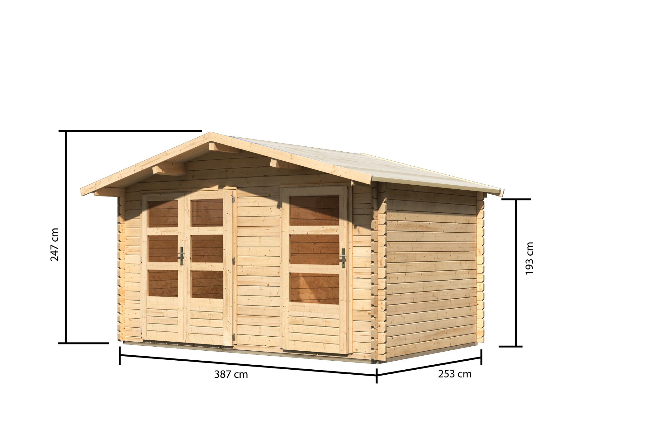 Ein Haus - zwei Räume. Unter diesem Motto steht das Gartenhaus Radur 0. Die 28 mm starken Wandbohlen und die klassische Blockbohlenbauweise mit unserer patentierten 6-Plus-Eckverbindung sorgen für eine stabile Konstruktion. Die 28 mm starke Mittelwand teilt einen großen Raum in zwei einzelne Räume. So haben Sie noch mehr Möglichkeiten zum Einrichten Ihres Gartenhauses. Ob als Hobbywerkstatt mit angrenzendem Lagerraum, als kleines Gärtnerhäuschen mit Unterstellmöglichkeit für Ihre Gartengeräte, das Gartenhaus Radur passt sich Ihren Vorstellungen an. Die zwei Räume erreichen Sie durch eine Doppelflügel- und eine Einflügeltür. Diese besitzen jeweils drei Lichtausschnitte pro Türflügel und werden mit einem Zylinderschloss mit drei Schlüsseln vor unbefugtem Eindringen gesichert. Durch das tauschen der Türen in der Front können Sie die Optik des Gartenhauses verändern und es somit noch mehr auf Ihre Bedürfnisse abstimmen. Ein optional erhältlicher Fußboden oder das Verlegen von Dachschindeln auf dem Dach runden das Gesamtbild ab. Das Gartenhaus Radur 0 mit einem Außenmaß von (BxT) 387 x 253 cm hat die ideale Größe und passt bestimmt auch in Ihren Garten. Das klassische Satteldach und die Blockbohlenbauweise wirken nach außen klassisch und schlicht, sodass sich das Gartenhaus Radur perfekt in seine Umgebung einfügt. Das naturbelassene Holz können Sie ganz nach den eigenen Vorstellungen streichen. Setzten Sie Ihr ganz persönliches Highlight in Ihren Garten mit dem Mittelwandhaus Radur 0.