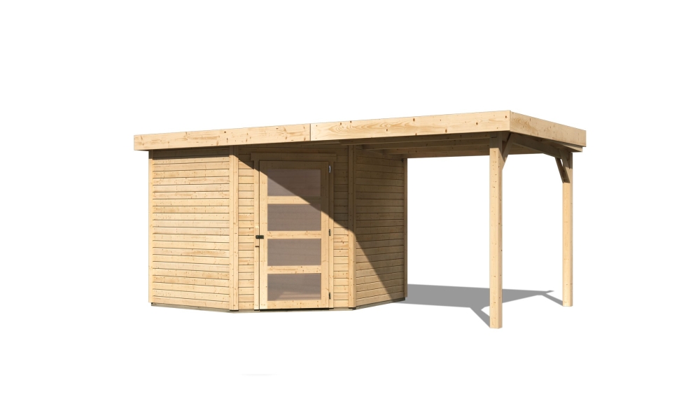 Karibu Gerätehaus “Schwandorf 5” 5-Eck mit Anbau/Terrasse modern aus Holz in Natur