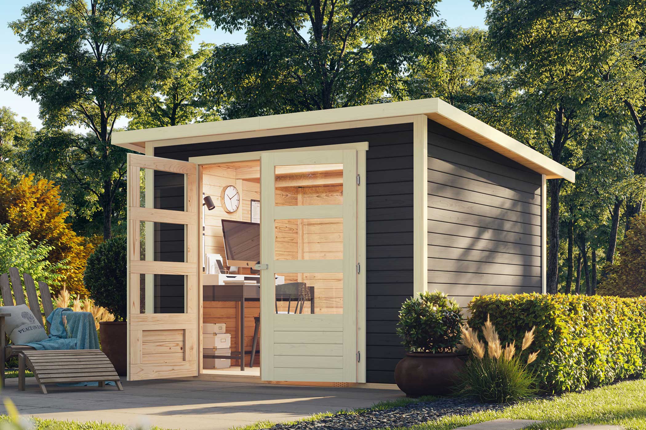 Das Gartenhaus Stockach 4 ist der Hingucker in Ihrem Garten. Das 19mm Haus überzeugt durch sein modernes Pultdach mit einer Dachfläche von 7,8 m² und den unkomplizierten Look. Dadurch hat es kein Problem sich in seine Umgebung einzufügen und passt bestimmt auch in Ihr Gartenambiente. Das Gartenhaus besteht aus nordischem Fichtenholz und wird mithilfe eines Steck- und Schraubsystems aufgebaut. Dies ermöglicht eine einfache und schnelle Montage ohne großes handwerkliches Geschick. Das Haus ist in modernem Terragrau, Schwarz und in Naturbelassen zur eigenen Gestaltung erhältlich. So bleibt es bei Ihnen wie Sie Ihr Gartenhaus Stockach gestalten und einrichten. In das Innere des Gartenhauses gelangen Sie durch eine Doppelflügeltür mit drei Lichtausschnitten pro Türflügel. Gesichert wird das Haus mit eine Sicherheitsüberfalle. Durch die Lichtausschnitte gelangt viel Tageslicht ins Innere und lässt das Haus somit nicht nur von außen strahlen. Mit einem Außenmaß von (BxT) 246 x 246 cm bietet es viel Platz für Ihre Gartenmöbel oder Gartengeräte. Das Gartenhaus wird durch kesseldruckimprägnierte Bodenbalken vor aufsteigender Feuchtigkeit geschützt. Ob als Rückzugsort im eigenen Garten oder als Unterstellmöglichkeit für Gartengerät, dass Gartenhaus Stockach 4 bietet Ihnen viele Möglichkeiten.