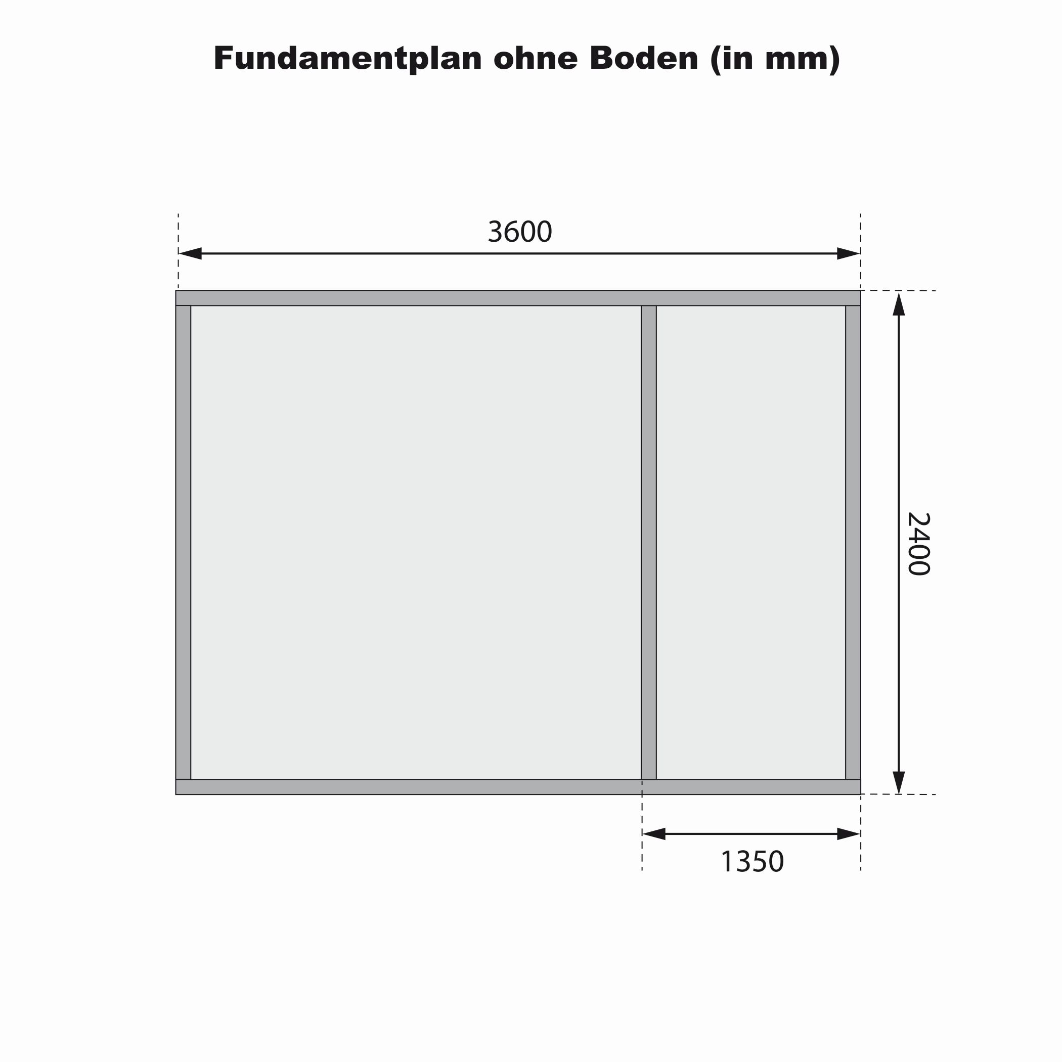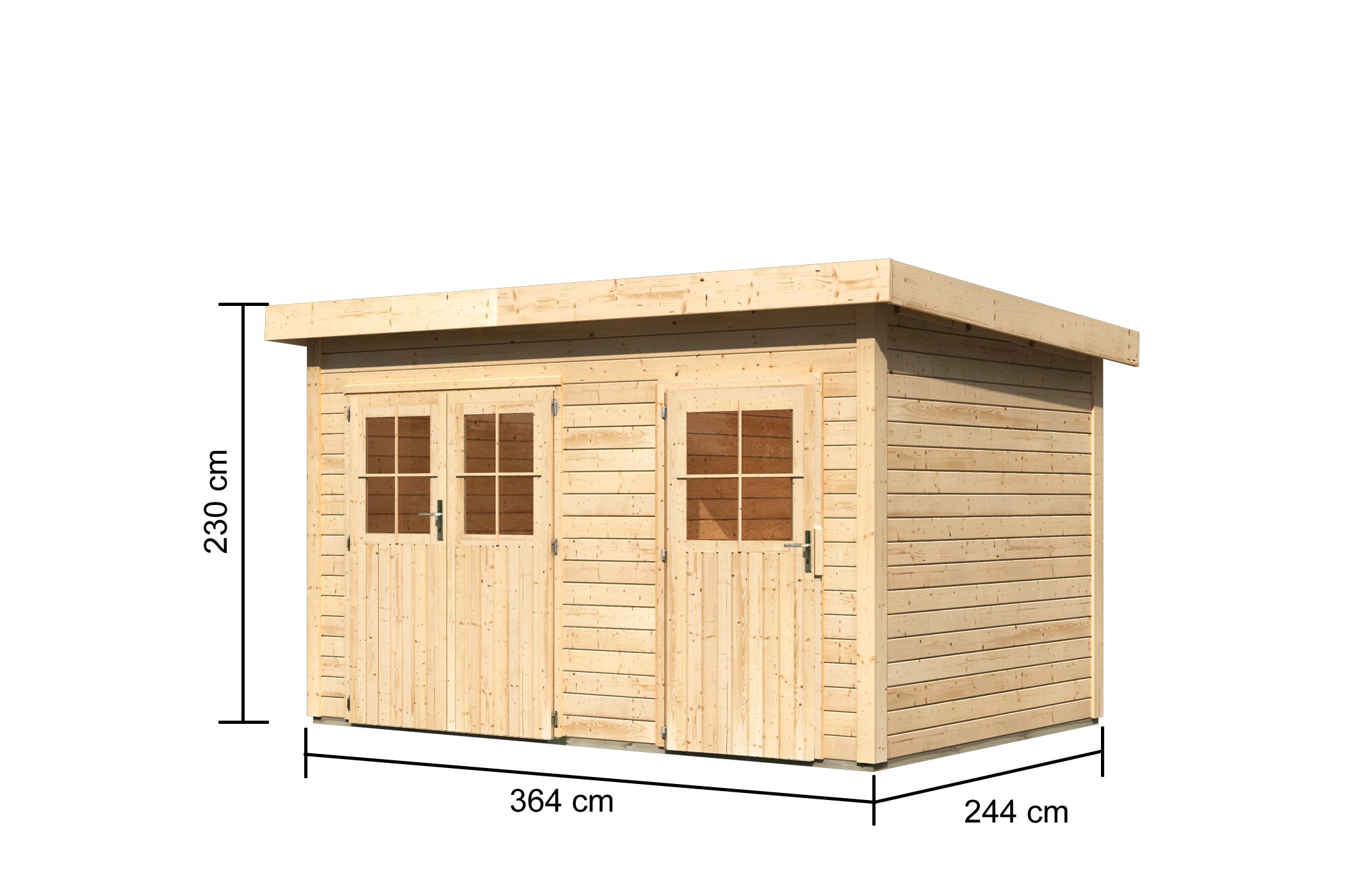 Flachdach, 28 mm Steck-/Schraubsystem, Mittelwand - diese Merkmale beschreiben das Gartenhaus Tintrup. Das Gartenhaus besteht aus 28 mm starken Bohlen und wird mithilfe des Steck-/Schraubsystems montiert. Das Flachdach besteht aus Massivholzbrettern, welches durch eine optional erhältliche selbstklebende Dachfolie geschützt werden kann. Das Gartenhaus ist in der modernen Farbe Terragrau oder in dem klassischen naturbelassenen Holz erhältlich. Das Innere des Gartenhauses können Sie durch eine Doppelflügeltür und eine Einflügeltür mit je einem Lichtausschnitt pro Türflügel und Zylinderschloss betreten. Der Innenraum wird durch eine Mittelwand geteilt und ermöglicht so eine Aufteilung in zwei Räume. So haben sie noch mehr Gestaltungsmöglichkeiten und können Ihre Gegenstände gezielter Ordnen. Der große Raum kann so zum Beispiel als kleines Gärtnerhäuschen dienen, während der kleinere Raum sich perfekt als Lager für Gartengeräte und Pflänzchen eignet. Mit einem optional erhältlichen Fußboden und denen im Lieferumfang enthaltenen kesseldruckimprägnierten Bodenbalken können Sie Ihre Gegenstände und das Haus vor aufsteigender Nässe schützen. Das Gartenhaus mit einem Außenmaß von (BxT) 364 x 244 cm besitzt die perfekte Größe für nahezu jeden Garten. Ordnen Sie Ihre Gartengegenstände noch gezielter mit dem Gartenhaus Tintrup.