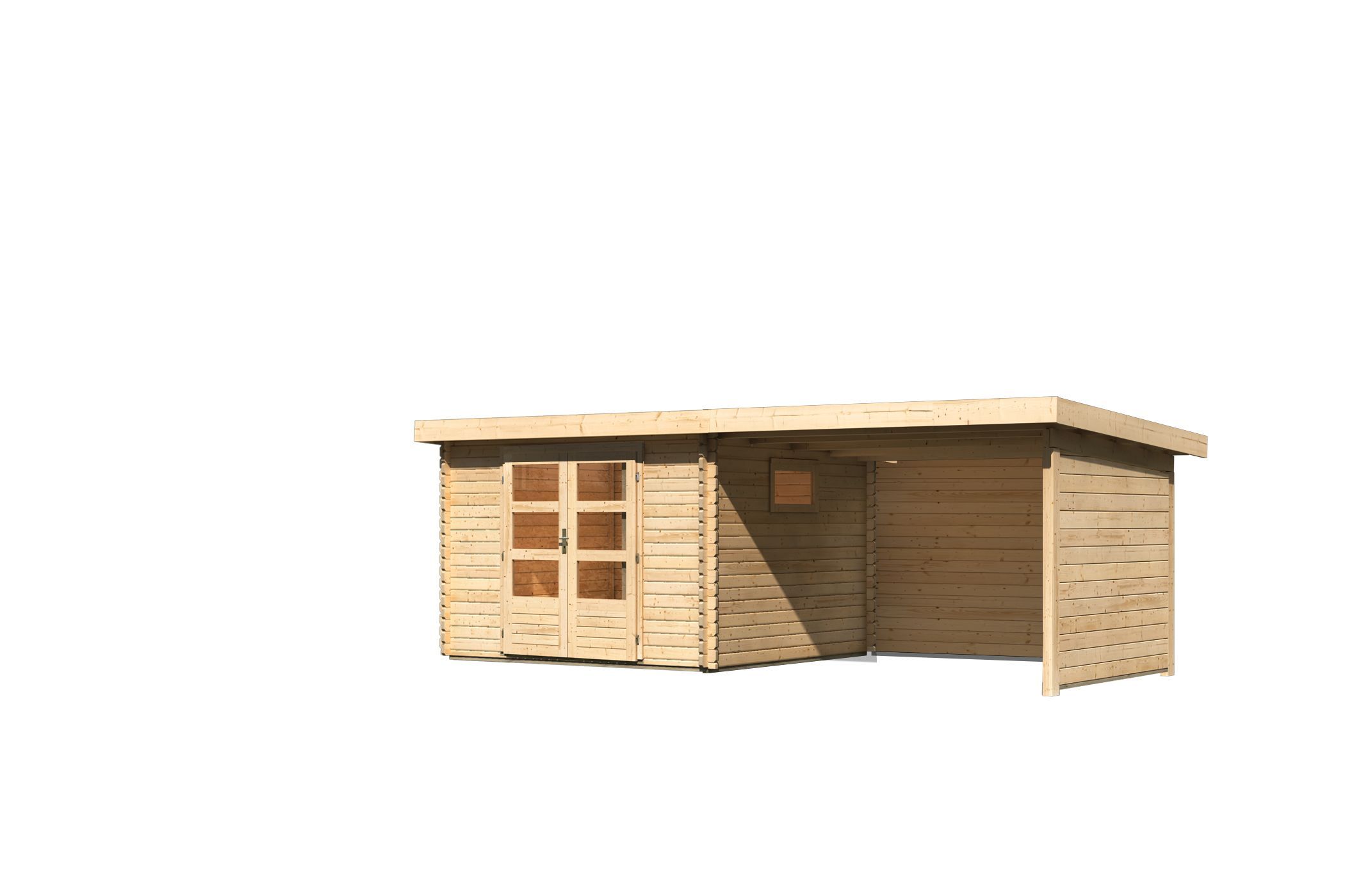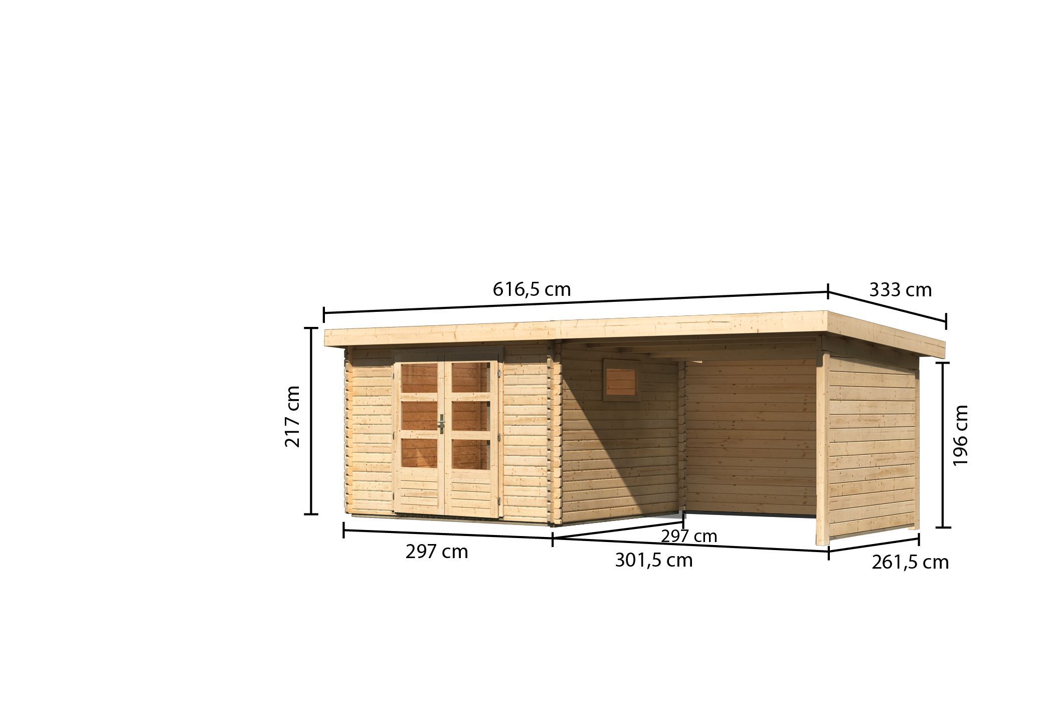 Für jeden Garten das Richtige mit dem Gartenhaus Trittau 3. Das Gartenhaus mit einer Wandstärke von 38 mm aus nordischem Fichtenholz wird in klassischer Blockbohlenbauweise montiert. Durch die patentierte 6-Plus-Eckverbindung erhält das Haus eine besondere Stabilität. Das Pultdachhaus aus Massivholz überzeugt durch seine moderne Optik. Die Doppelflügeltür mit drei Lichtausschnitten je Türflügel lässt viel Tageslicht ins Innere und sorgt so für eine natürliche Lichtquelle. Das Gartenhaus Trittau 3 ist in Naturbelassen erhältlich und lässt sich durch ein optional erhältliches Anbaudach in 3,30 m oder 4,40 m breite erweitern. Somit ist eine individuelle Gestaltung nach den eigenen Vorstellungen ohne weiteres möglich. Der Innenraum mit den Maßen (BxT) 274 x 274 cm ist großzügig geschnitten und bietet Ihnen eine große Vielfalt an Einrichtungsmöglichkeiten. So kann das Haus als Unterstellmöglichkeit für Ihre Gartengeräte, als Spielhaus für Ihre Kinder oder als gemütlichen Rückzugsort im eigenen Garten dienen. Ihrer Kreativität sind hier keine Grenzen gesetzt. Durch einen optional erhältlichen Fußboden und ein Fenster wird das Gartenhaus so richtig heimisch und ist bestimmt das Richtige für Ihren Garten.