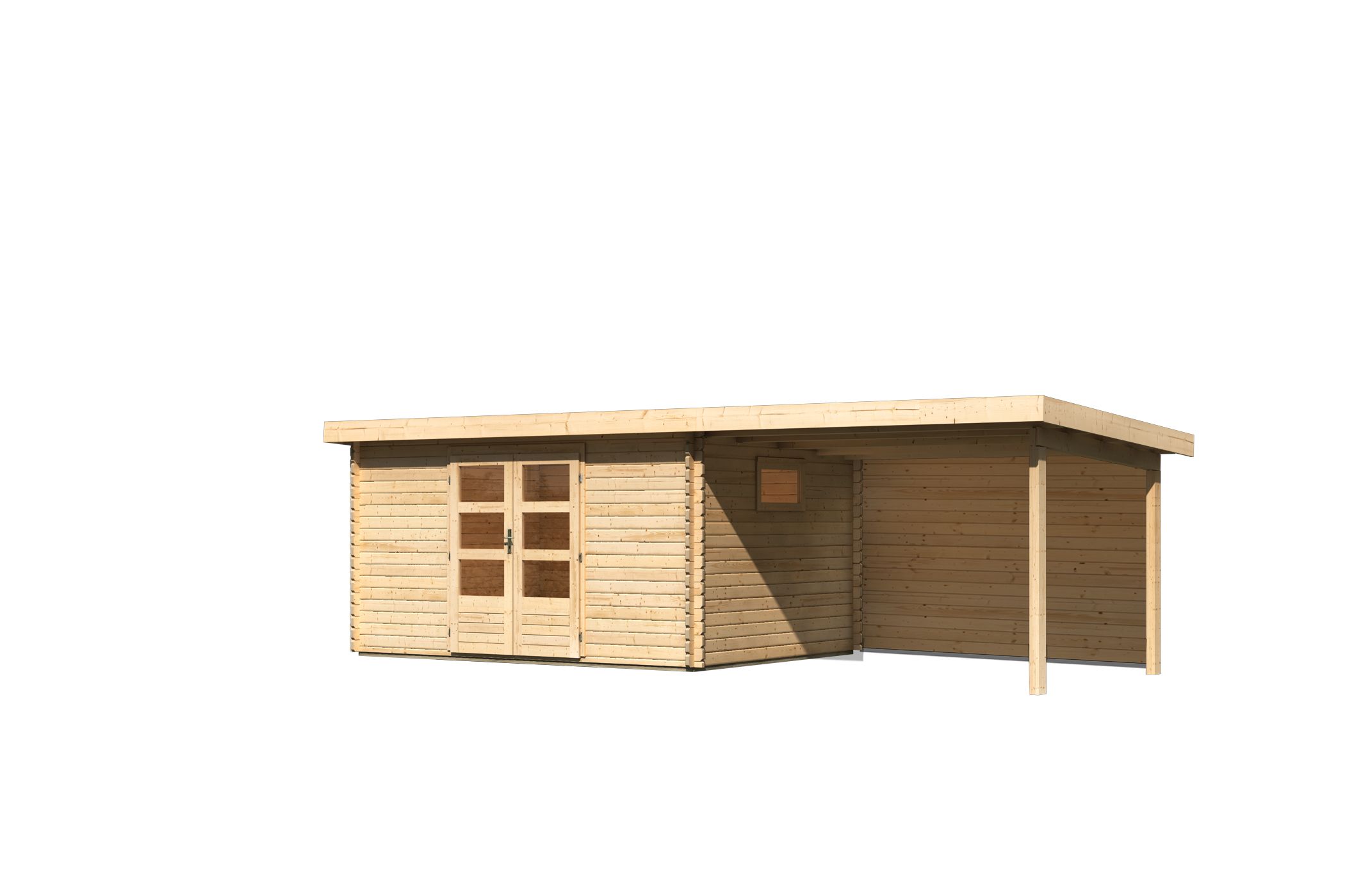 Für jeden Garten das Richtige mit dem Gartenhaus Trittau 5. Das Gartenhaus mit einer Wandstärke von 38 mm aus nordischem Fichtenholz wird in klassischer Blockbohlenbauweise montiert. Durch die patentierte 6-Plus-Eckverbindung erhält das Haus eine besondere Stabilität. Das Pultdachhaus aus Massivholz überzeugt durch seine moderne Optik. Die Doppelflügeltür mit drei Lichtausschnitten je Türflügel lässt viel Tageslicht ins Innere und sorgt so für eine natürliche Lichtquelle. Das Gartenhaus Trittau 5 ist in Naturbelassen erhältlich und lässt sich durch ein optional erhältliches Anbaudach in 3,30 m oder 4,40 m breite erweitern. Somit ist eine individuelle Gestaltung nach den eigenen Vorstellungen ohne weiteres möglich. Der Innenraum mit den Maßen (BxT) 364 x 274 cm ist großzügig geschnitten und bietet Ihnen eine große Vielfalt an Einrichtungsmöglichkeiten. So kann das Haus als Unterstellmöglichkeit für Ihre Gartengeräte, als Spielhaus für Ihre Kinder oder als gemütlichen Rückzugsort im eigenen Garten dienen. Ihrer Kreativität sind hier keine Grenzen gesetzt. Durch ein Fenster und einen optional erhältlichen Fußboden wird das Gartenhaus so richtig heimisch und ist bestimmt das Richtige für Ihren Garten.