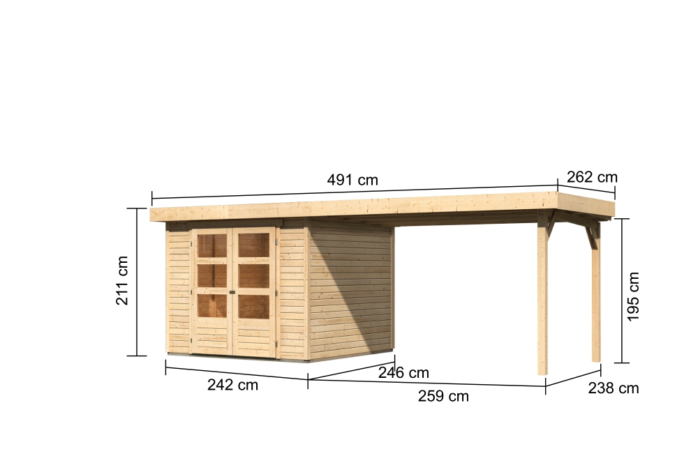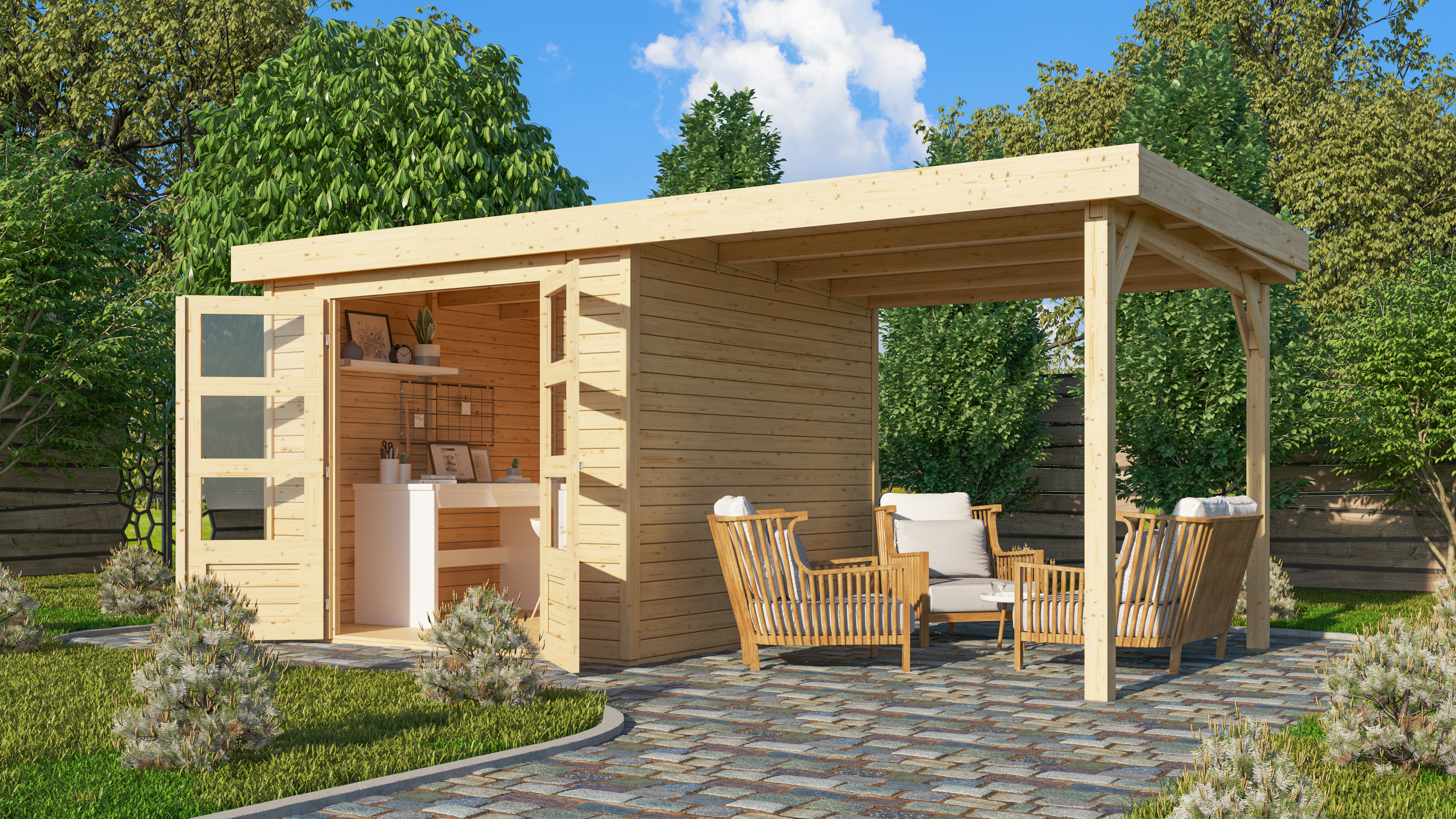 Mit einem Außenmaß von(BxT) 242 x 246 cm besitzt es die ideale Größe, um Gartengeräte zu verstauen oder einen gemütlichen Rückzugsort zu schaffen. Das Gartenhaus ist optional mit einem Anbaudach 2,80 m erhältlich, welches zusätzlichen Raum bietet. Der neu gewonnene Platz eignet sich ideal als Unterstand für große Gartengeräte oder für eine bequeme Sitzgruppe im Freien. So können Sie Ihren Garten nicht nur bei Sonnenschein in vollen Zügen genießen.