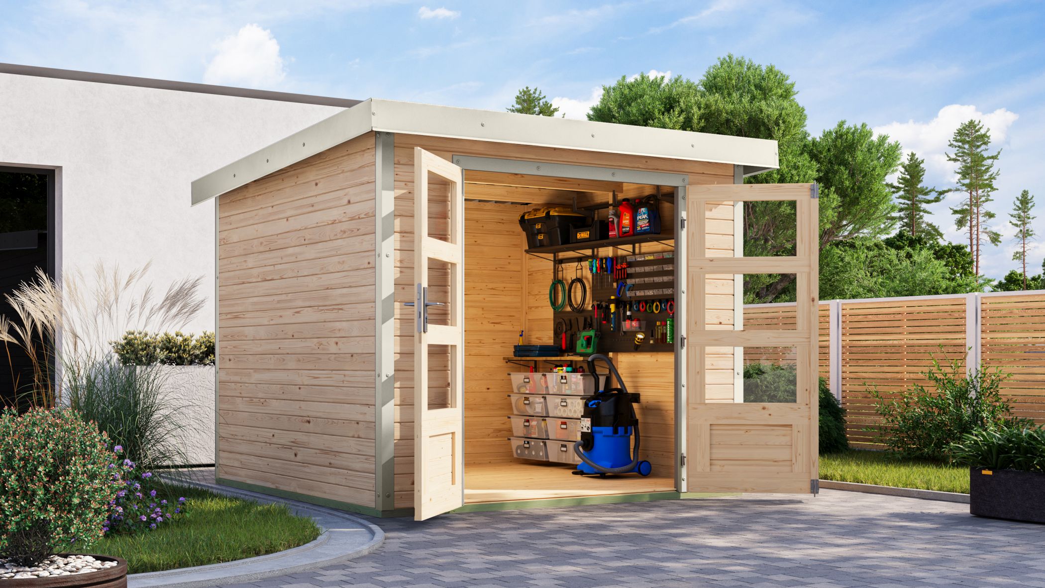 Das Gartenhaus wird aus hochwertigen Materialien gefertigt: Die Wände bestehen aus nordischer Fichte, bekannt für ihre natürliche Schönheit und Robustheit. Stahlecken und ein Trapezblechdach verleihen dem Design einen modernen Touch.