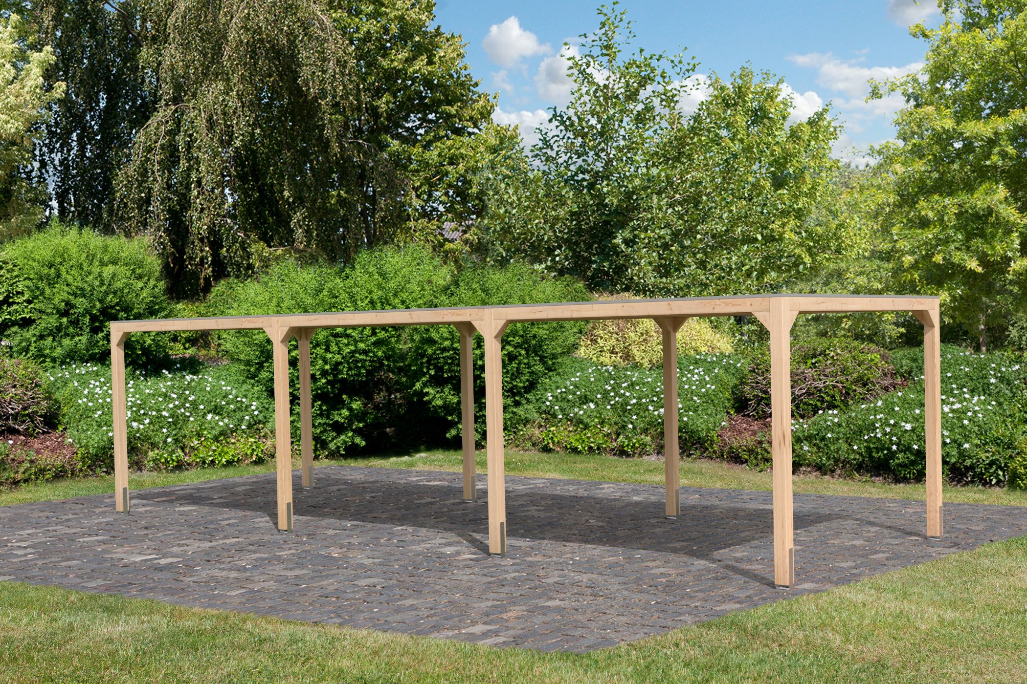 Der quadratische Pavillon hat ein Außenmaß von 320 x 934 cm und ein Dachstandmaß von 320 x 320 cm. Die Seitenhöhe beträgt 236 cm, der First misst 239 cm. Das formschöne Flachdach wird von 4 Pfosten gestützt, die jeweils 12 x 12 cm stark sind. Die Pfosten und weiteren Sparren Querverbinder sind kesseldruckimprägniert und somit gegen Witterungseinflüsse bestens geschützt. Die Pfosten und weiteren Sparren Querverbinder bestehen aus Leimholz.Unsere Empfehlung