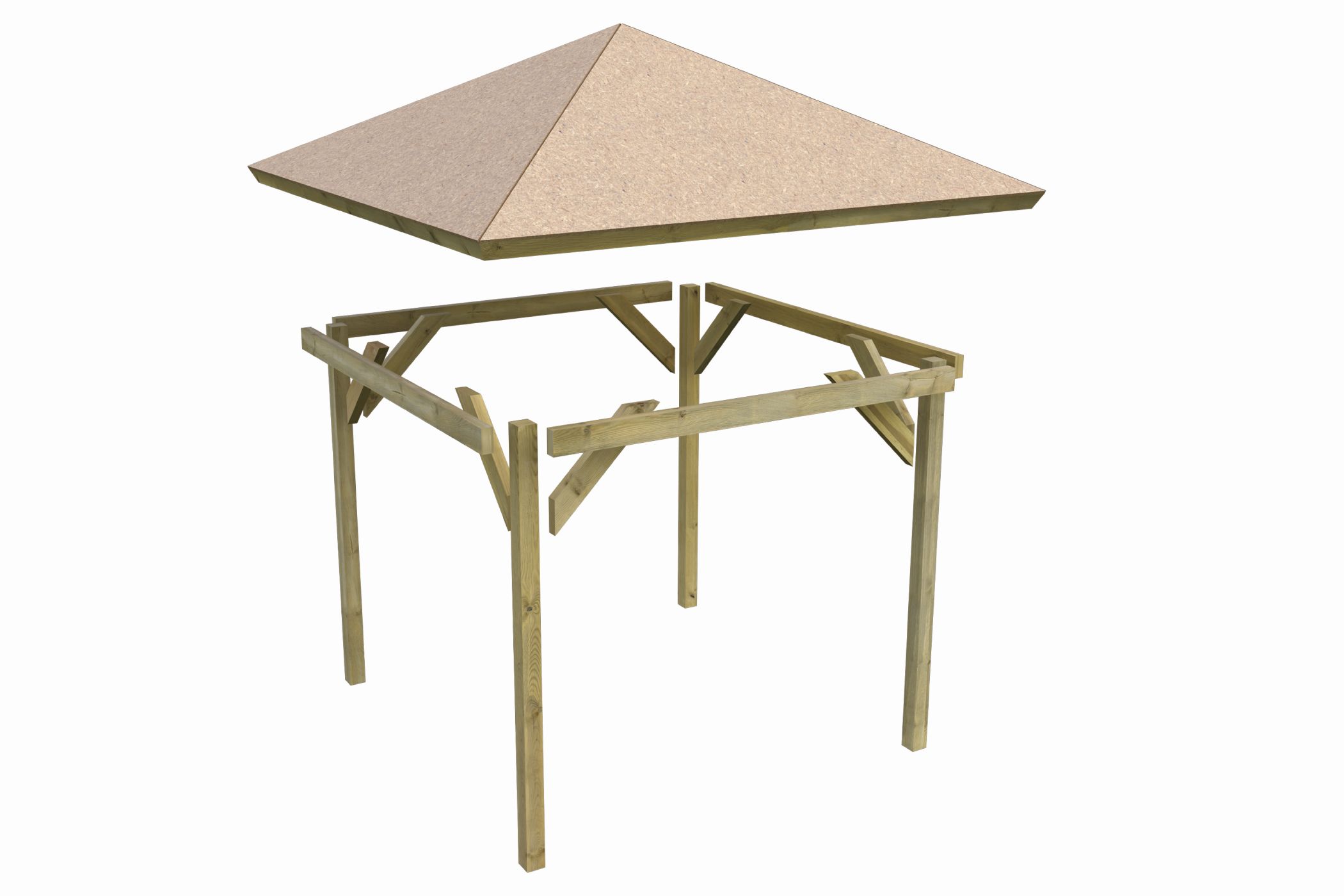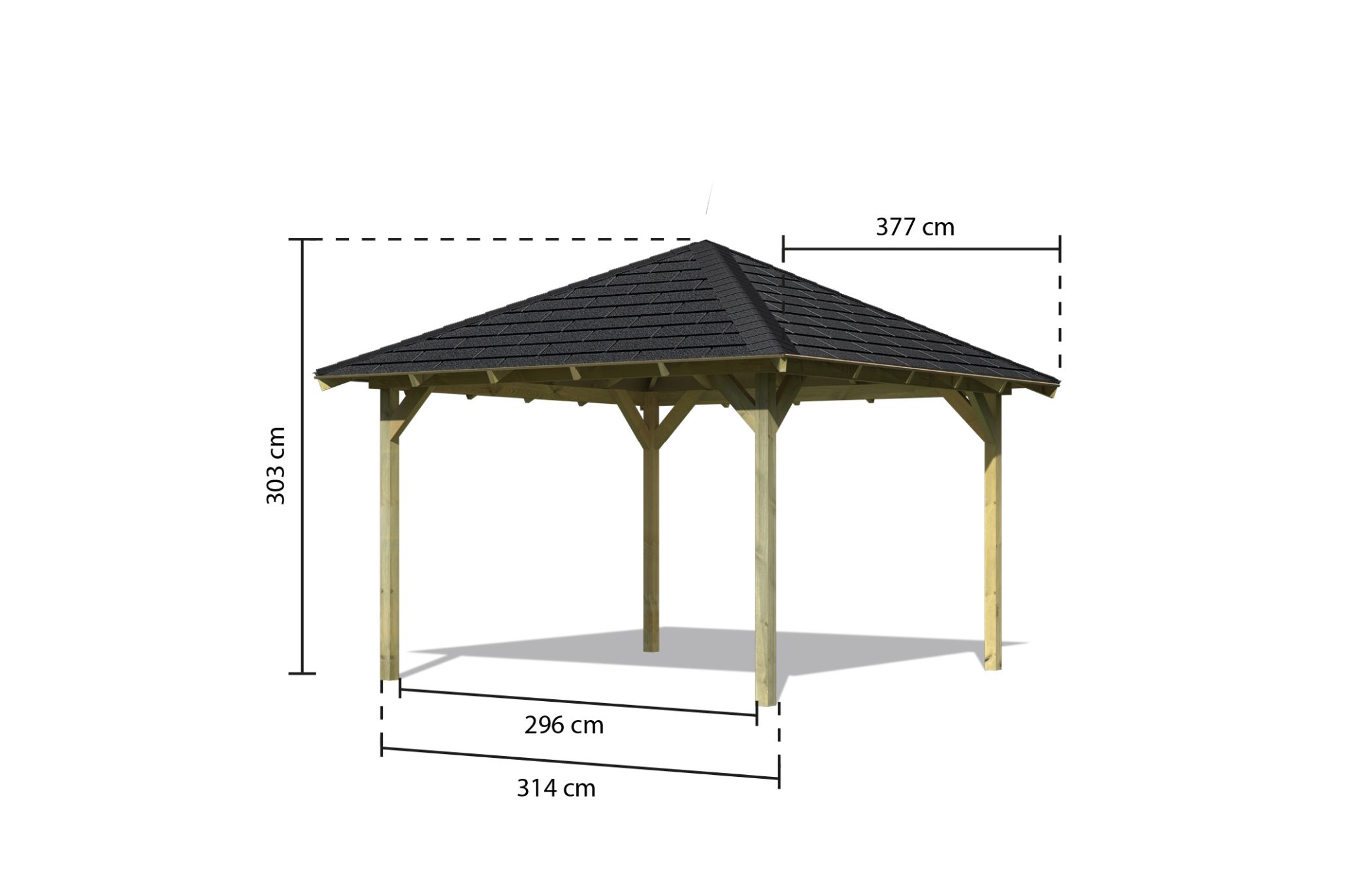 Ein Außenmaß von (BxT) 314 x 314 cm, ein spitz zulaufendes Dach, vier 9 x9 cm starke kesseldruckimprägnierte Pfosten und eine Höhe von 303 cm. Diese Eigenschaften machen den Pavillon Granada zum perfekten Begleiter in Ihrem Garten. Die 15,9 m² große Dachfläche bietet Ihnen ausreichend Schutz vor direkter Sonneneinstrahlung oder Niederschlag. Schützen Sie Ihr Dach mit den im Lieferumfang enthaltenen Dachschindeln.