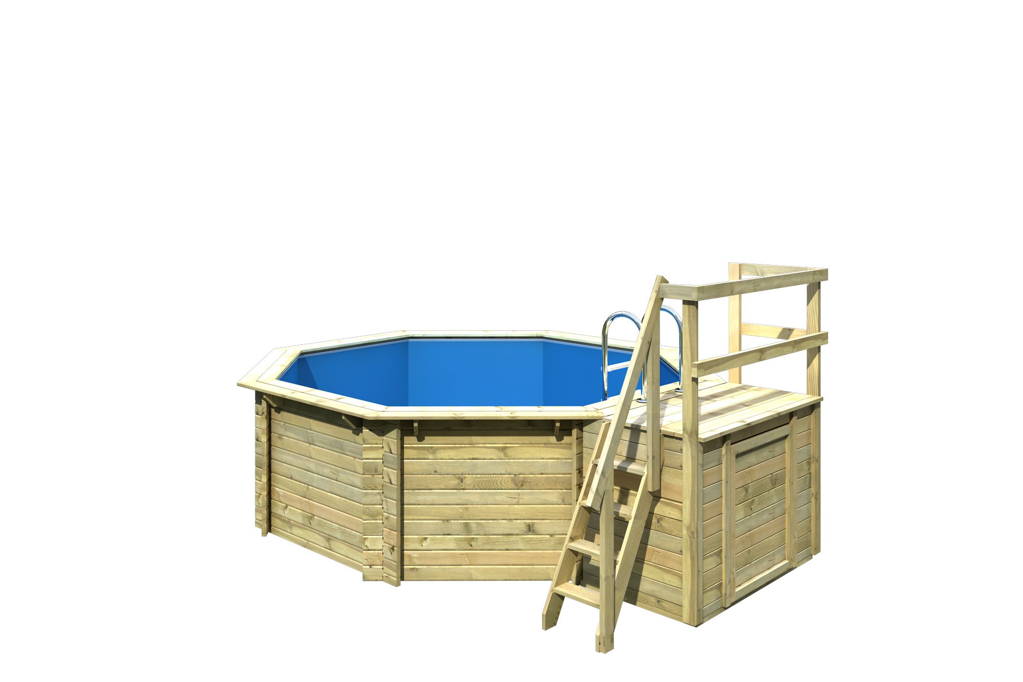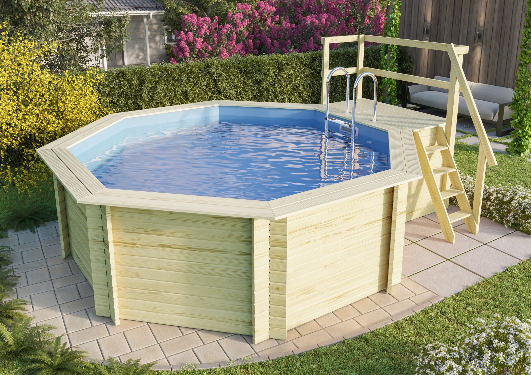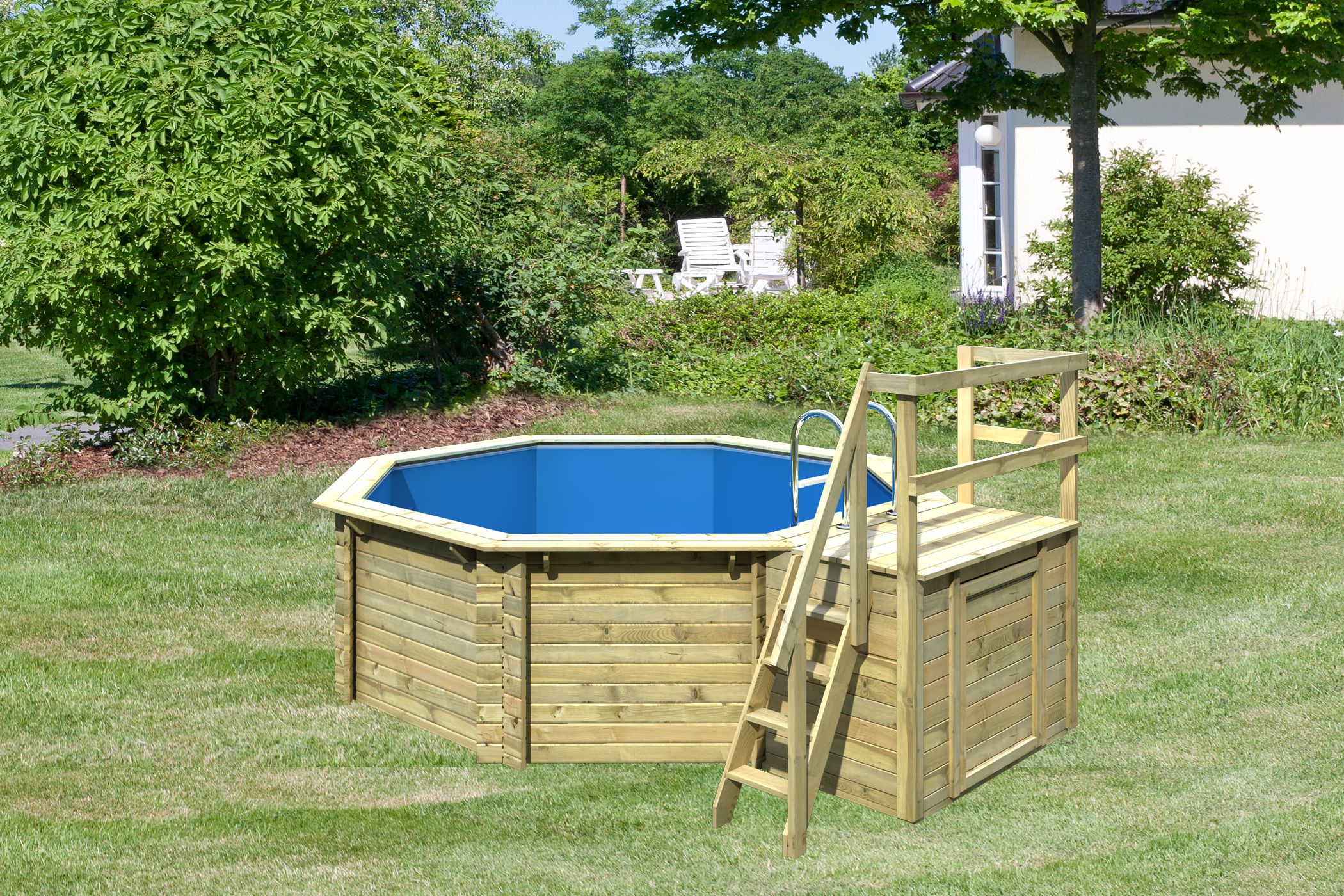 Durch seine großzügigen Maße von 400 x 400 cm bietet der Pool Spiel und Spaß für die ganze Familie. Der Achteckpool fasst ca. 11300 Liter und hat eine Wassertiefe von max. 111 cm. Eine Holzleiter aus nordischer Fichte und eine Edelstahlleiter erleichtern Ihnen den Einstieg in das kühle Nass. Die Konstruktion besteht aus 38 mm kesseldruckimprägnierten Bohlen und wird in klassischer Blockbohlenbauweise montiert. Um sich nach dem Plantschen zu erholen, können Sie Ihren Pool wahlweise durch eine Terrasse erweitern. In den fünf Varianten, die sich in der Größe unterscheiden, ist bestimmt auch die Richtige für Ihren Pool dabei. Ausgestattet mit einem Liegestuhl eignet sich die Terrasse ideal, um die Sommersonne zu genießen. Ein kühler Drink und ein gutes Buch machen die Entspannung perfekt. Die im Lieferumfang enthaltenen 0,6mm starke PVC-Folie in blau schützt das Holz vor dem Wasser und ermöglichen ein angenehmes Gefühl unter Ihren Füßen. Das kesseldruckimprägnierte Holz ist durch die spezielle Behandlung besonders widerstandsfähig gegen die Witterung und verspricht Ihnen somit viel Spaß, Spiel und Entspannung. Verschönern Sie sich den Sommer und gönnen Sie sich eine kühle Auszeit mit dem Achteckpool Modell 1 , der bestimmt auch bald in Ihrem Garten steht.
