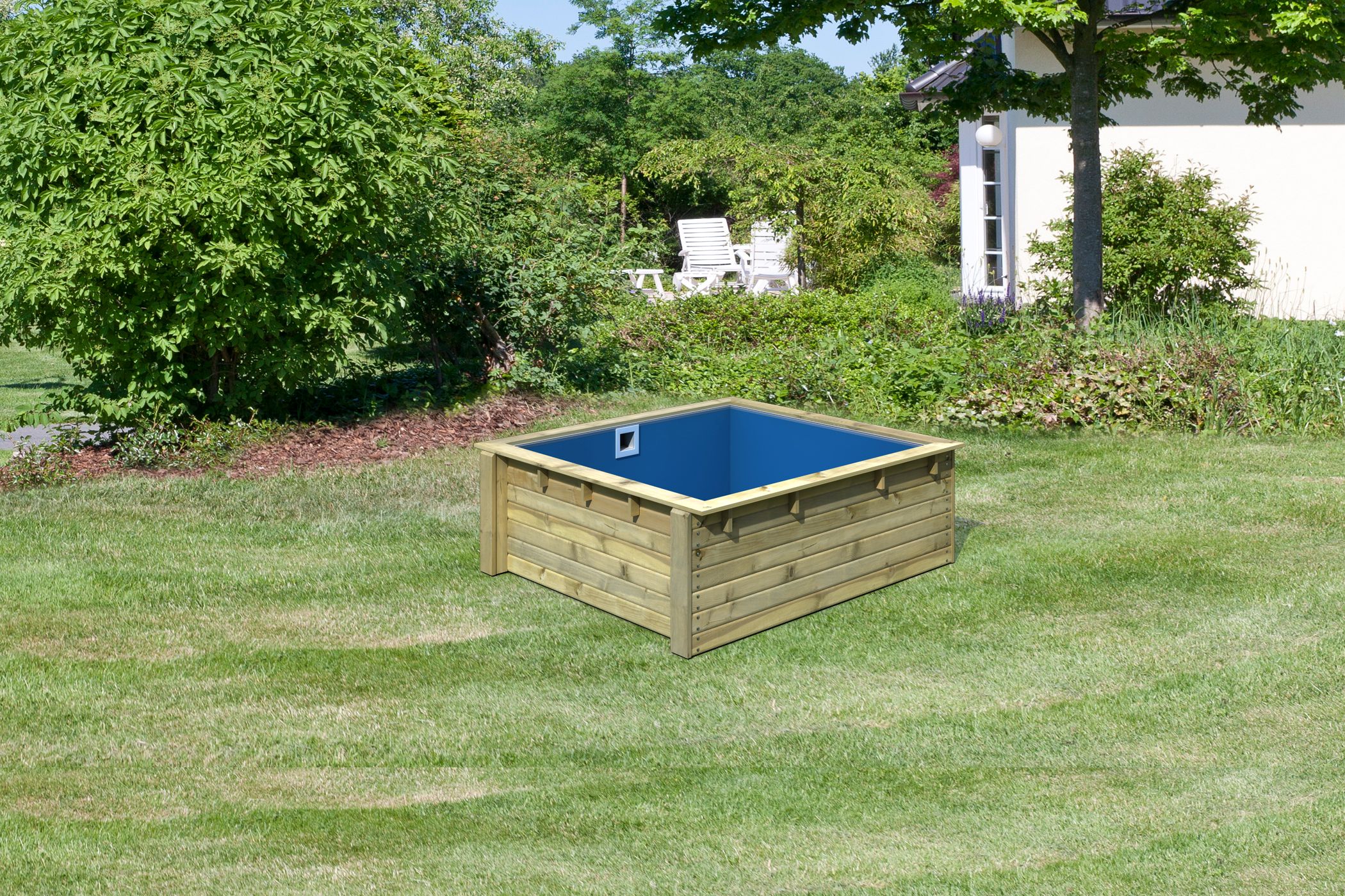 Der Massivholzpool aus 38 mm starken kesseldruckimprägnierten und damit witterungsbeständigen Blockbohlen bietet Ihnen Sommerfrische im eigenen Garten.