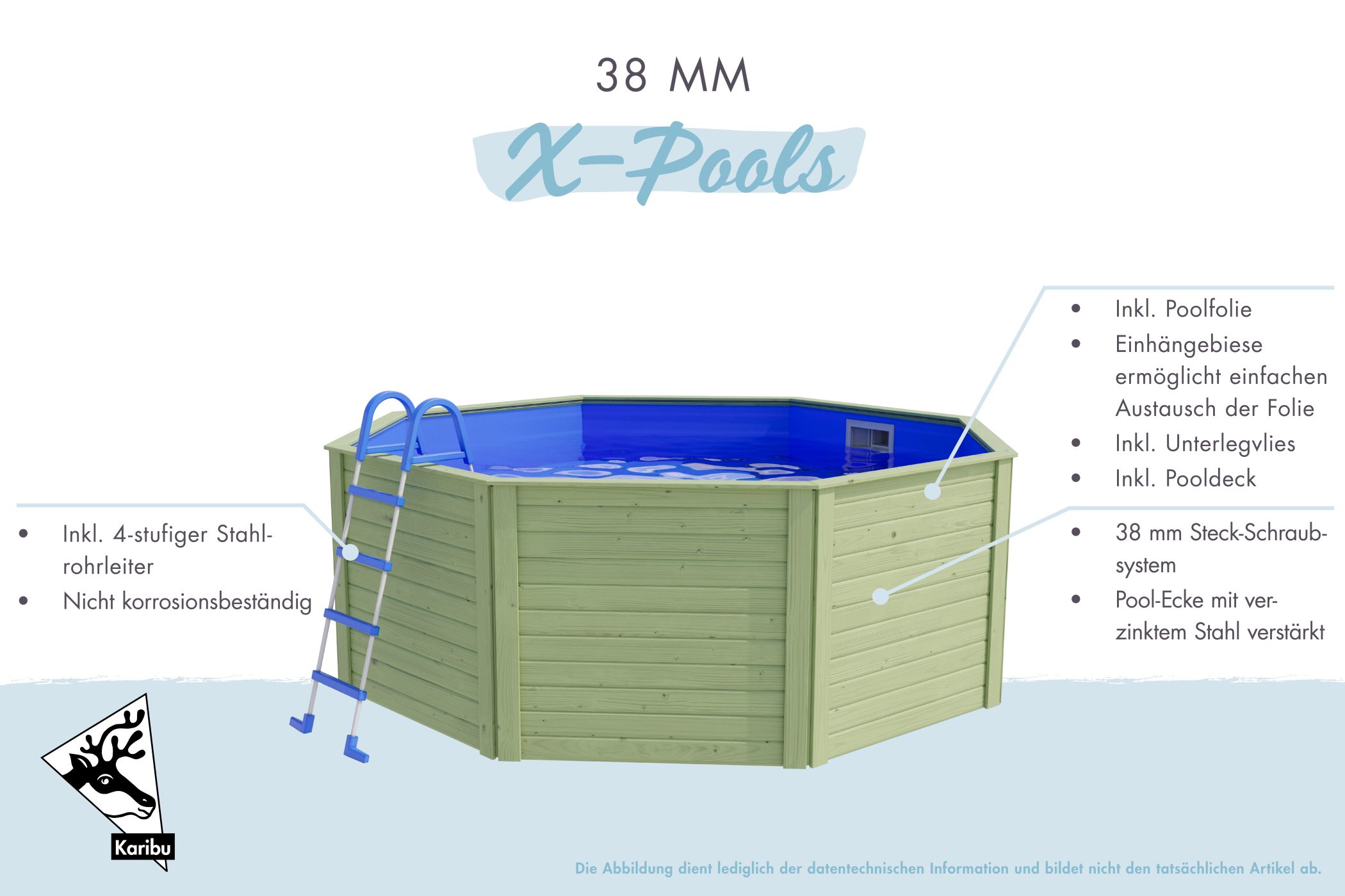 Der Massivholzpool aus 38 mm starken kesseldruckimprägnierten und damit witterungsbeständigen Blockbohlen bietet Ihnen Sommerfrische im eigenen Garten.
