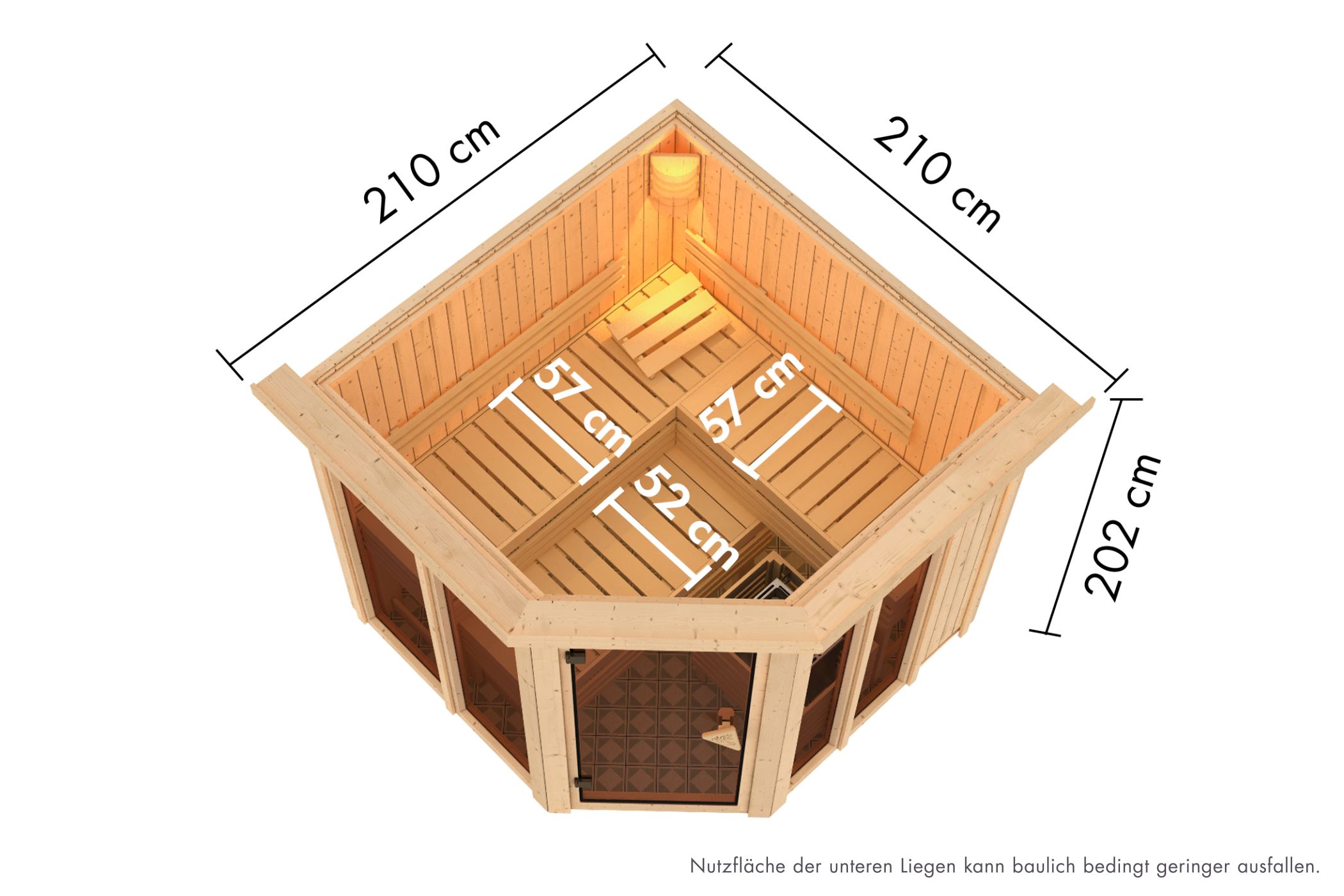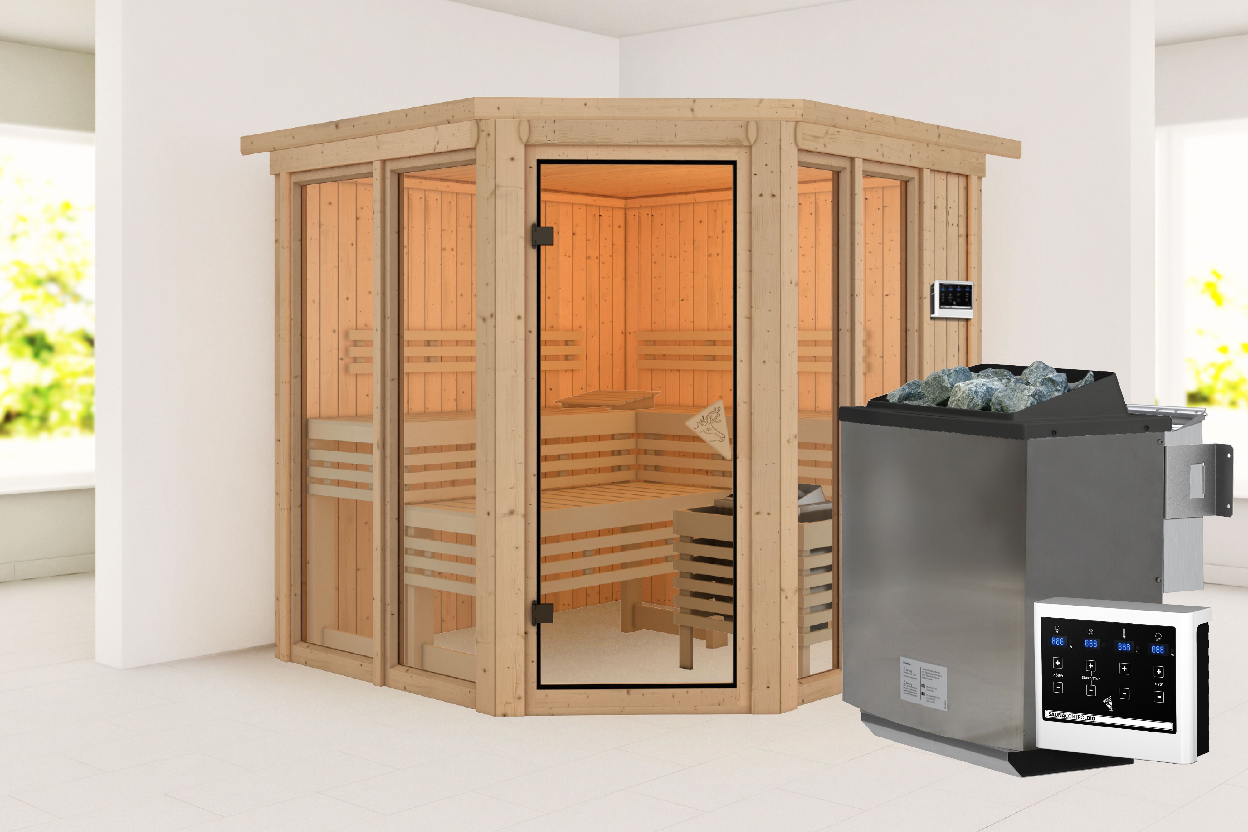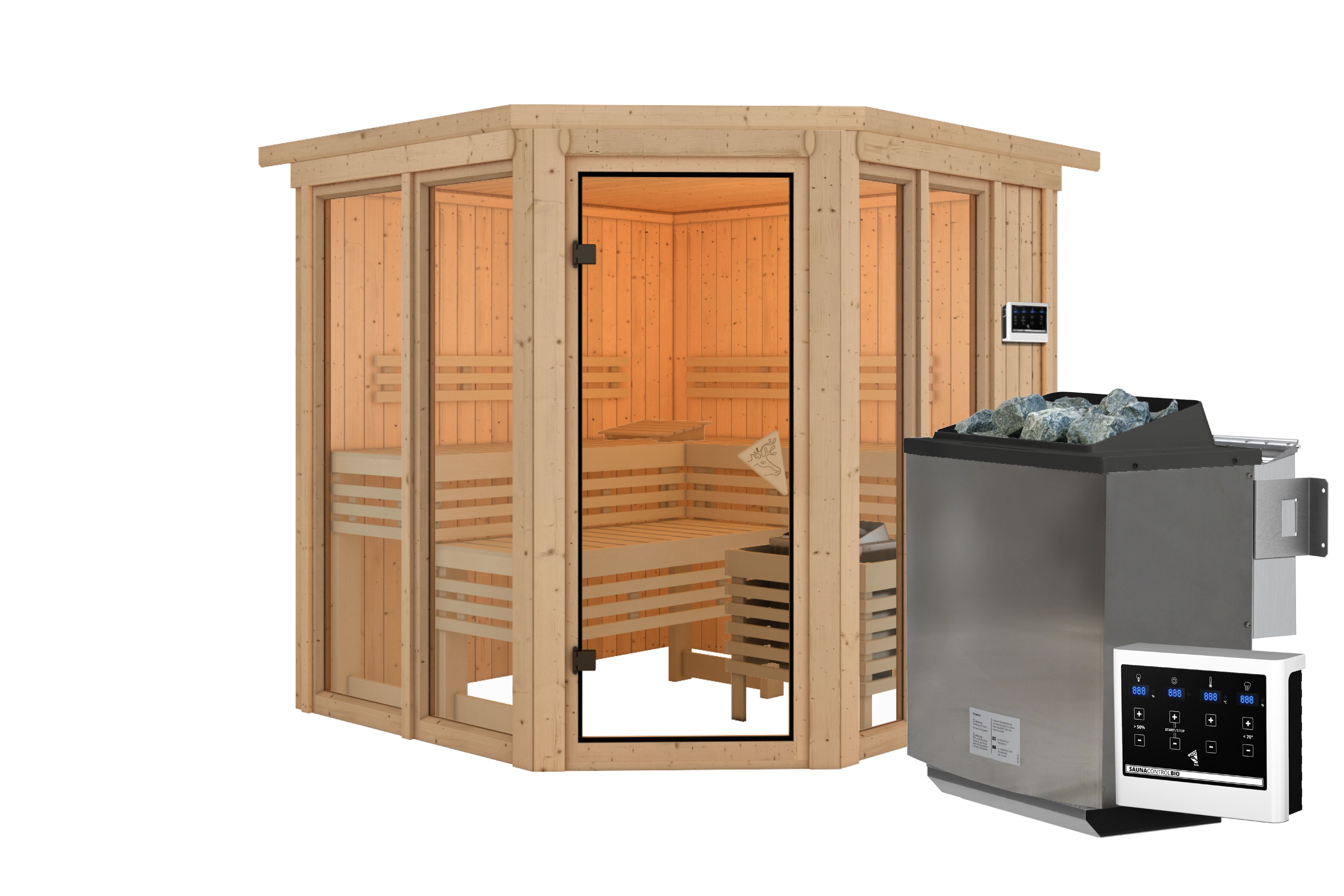 Karibu Design Sauna "Sauna Airi" Bio Sauna 4-5 Personen 9 kW Bio-Kombi Ofen + Steuergerät mit Dachkranz