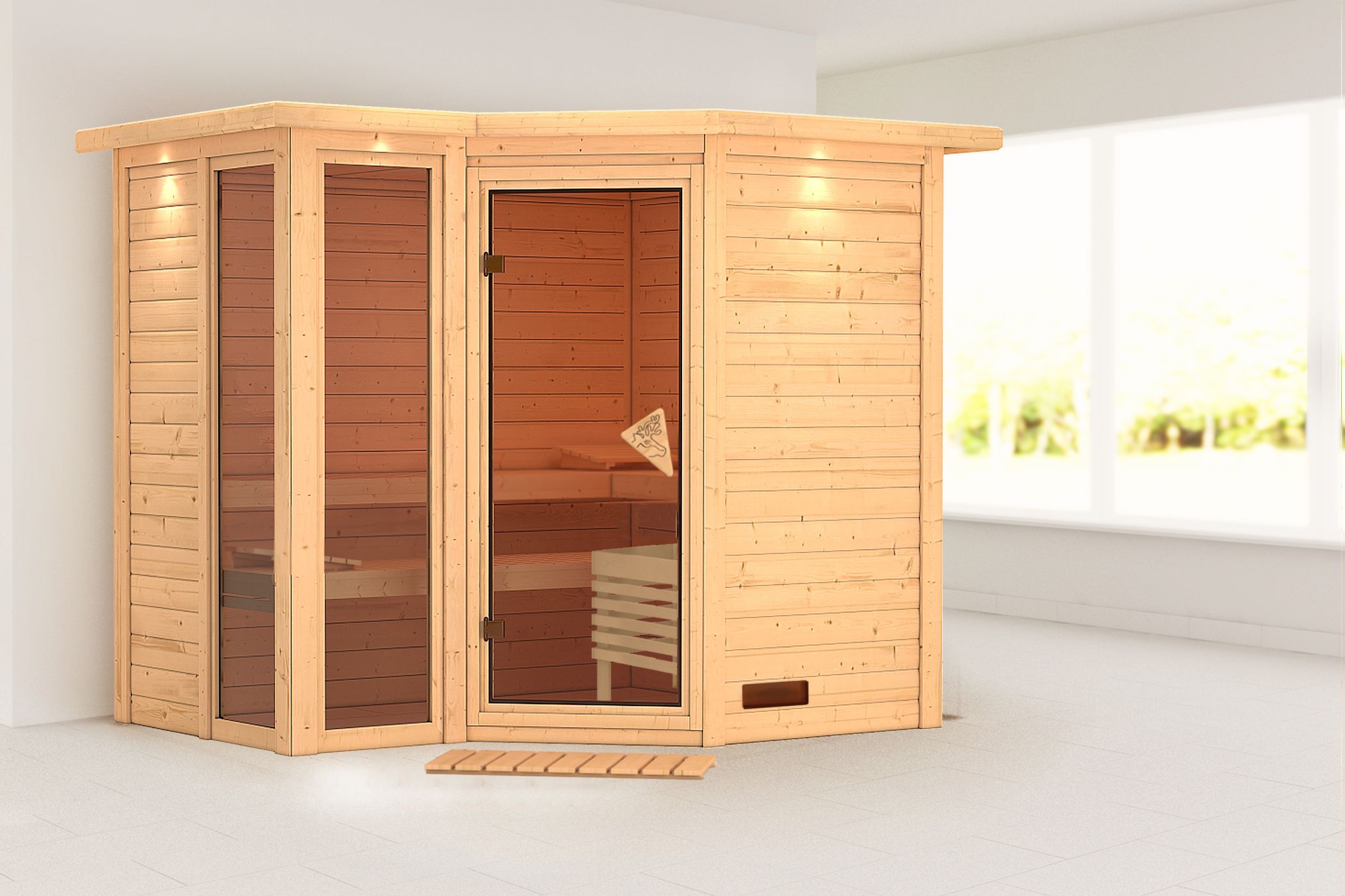 Ein Ort der Ruhe und Entspannung in den eigenen Vier Wänden. Nach einem stressigen Tag die Seele baumeln lassen und sich von der wohligen Wärme in einer Sauna verwöhnen ohne das Haus verlassen zu müssen. Dies ist möglich mit unserer 38 mm Massivholzsauna Amara. Die stabile Konstruktion mit 38 mm Bohlen aus nordischem Fichtenholz wird im einfachen Steck-/ Schraubsystem montiert. Durch die massiven Vollholzwände wird im Saunainneren ein ideales Raumklima nach finnischem Vorbild geschaffen. Ein optional wählbarer Dachkranz inkl. 3 LED-Spots setzt die Sauna gekonnt in Szene. Das Innere der Sauna erreichen Sie durch eine bronzierte Ganzglastür aus Einscheibensicherheitsglas mit Karibu-Türgriff. Durch die Tür und die beiden bronzierten Fenster gelangt Licht in den Innenraum und sorgt durch die bronzierten Gläser für ein warmes Ambiente. Mit einem Außenmaß von 236 x 184 x 209 cm (H/B/T) besitzt die Sauna Amara die ideale Größe zum Entspannen und Wohlfühlen. Erweitern Sie Ihre Möglichkeiten mit dem optional erhältlichen 9kW-Bio-Kombiofen. Neben einer klassischen finnischen Sauna haben Sie hier die Möglichkeit einer Kräuterdampf-Kur, einem Dampfbad und einer Familiensauna. So wird es zu einem Saunaerlebnis für die ganze Familie. Lassen Sie sich von der wohltuenden Wirkung des Saunabadens überzeugen. Bei regelmäßiger Anwendung fühlen Sie sich nicht nur deutlich entspannter. Zusätzlich wirkt es sich positiv auf den Stoffwechsel aus, verfeinert das Hautbild und unterstützt den Stressabbau. Um ein besonderes Sauna-Gefühl zu schaffen, wird die Sauna mit 3 Saunaliegen und einer Kopfstütze ausgestattet. Durch eine extra breite Saunaliege von 62cm Breite wird Ihnen ein besonders angenehmer Liegekomfort geboten. Ein Ofenschutzgitter schützt Sie vor Verbrennungen durch den Saunaofen. Mit einer optional erhältlichen Salzkristall Vital Sole oder der Salzkristall-Leuchte können Sie Ihre Atemwege befreien und wieder tief ein- und ausatmen. Genießen Sie die zahlreichen Vorteile des Saunieren und schaffe Sie einen Ort der Ruhe mit der Massivholzsauna Amara.