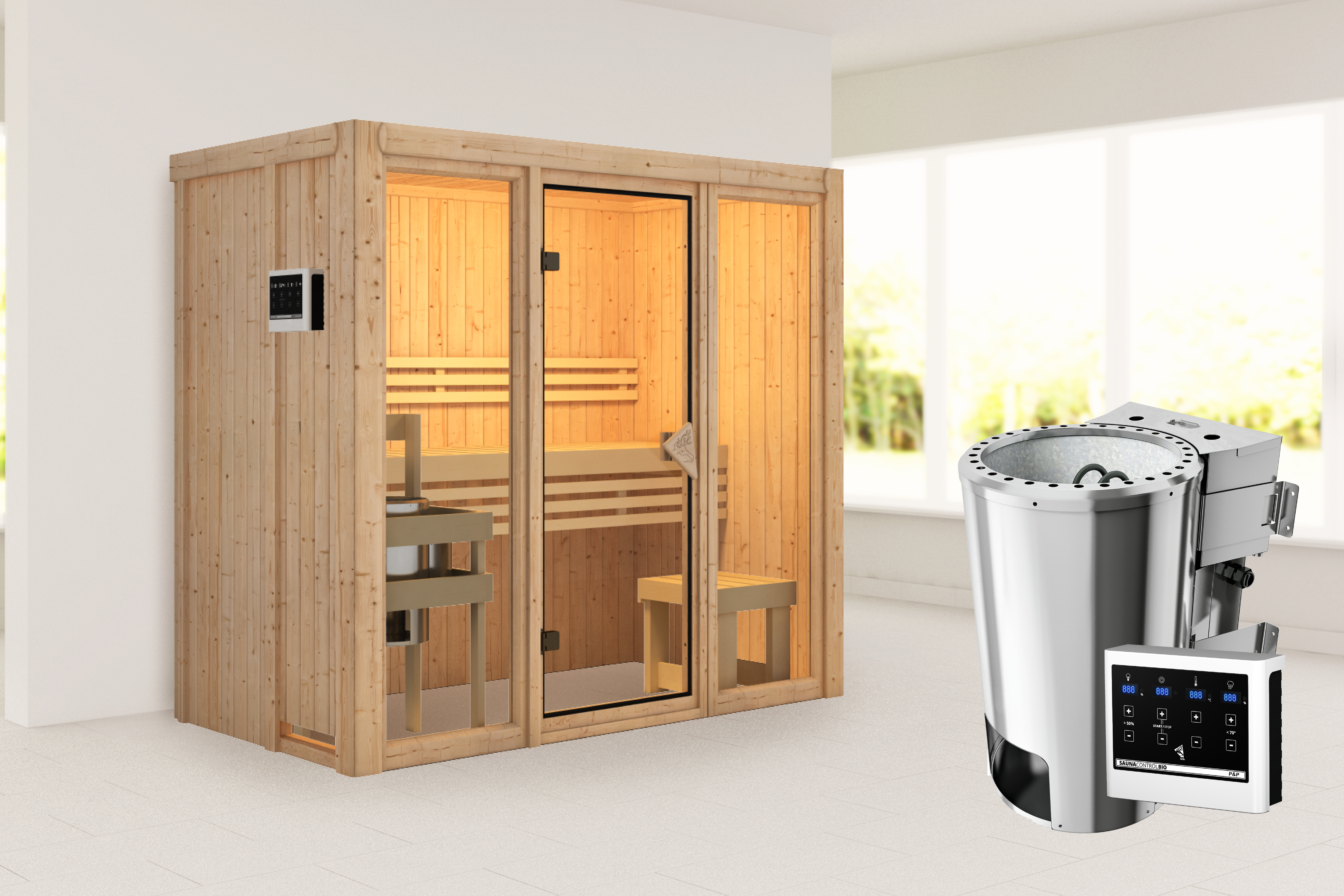 Karibu Design Sauna "Sauna Avari 2" 3 Personen 3,6 kW Ofen + Steuergerät (Easy Bio)
