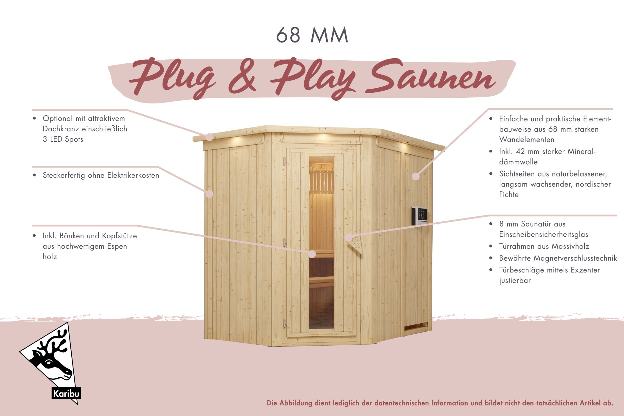 Das volle Saunaerlebnis genießen und dennoch Energie sparen. Dies ist möglich mit unserenr 68mm Systemsauna Fanja und dem steckerfertigen 3,6kW-Saunaofen. Durch die vormontierten Wandelemente kann die Sauna schnell und einfach montiert werden. Die 68mm starken Elemente bestehen aus einer Rahmenkonstruktion, welche an der Sichtseite mit 12,5mm starkem Spezial-Softline-Profilholz verstärkt sind. Diese Konstruktion bietet eine ideale Isolierung und hält die Wärme perfekt im Innenraum. Optional ist die Sauna Fanja mit einem Dachkranz inkl. drei LED-Spots erhältlich. Diese sorgen nicht nur für ein schönes Ambiente im Außenbereich der Sauna, sondern setzen diese auch noch gekonnt in Szene. Die Außenmaße betragen 196 x 151 x 198cm (B/T/H). In den großen Innenraum der Sauna gelangen Sie durch eine Saunatür. Hier haben Sie die Wahl aus vier Varianten und das ganz ohne Mehrkosten. Egal ob in der wärmegedämmten, energiesparenden Version, der klaren Ganzglastür, der Version mit bronzierte Ganzglastür oder der modernen graphitfarbenen Türversion. Hier ist garantiert für jeden Geschmack das Richtige dabei. Um sich im Saunainneren perfekt erholen zu können, wird hier1 Saunaliege aus massivem Espenholz montiert. Das Holz ist besonders weich und nimmt die Wärme nicht so stark an. Dies ermöglicht ein angenehmes Sitz- und Liegegefühl. Bei dem steckerfertigen Saunaofen können Sie zwischen drei Varianten wählen. Einer mit integrierter Steuerung, einer mit externem Steuergerät Easy und einem 3,6kW Bio-Kombi-Ofen. Das Besondere an diesem Saunaofen ist aber nicht seine Variantenvielfallt, sondern der Anschluss. Der Ofen wird mithilfe eines Steckers zur Inbetriebnahme an eine hausübliche 230Volt-Steckdose angeschlossen. Da hierfür kein Fachmann erforderlich ist, entfallen die Kosten für einen Elektriker und einen Umbau auf einen 400 Volt-Anschluss. Genießen Sie das volle Saunaerlebnis und sparen zusätzlich Energie mit der 68mm Plug & Play Sauna Fanja.