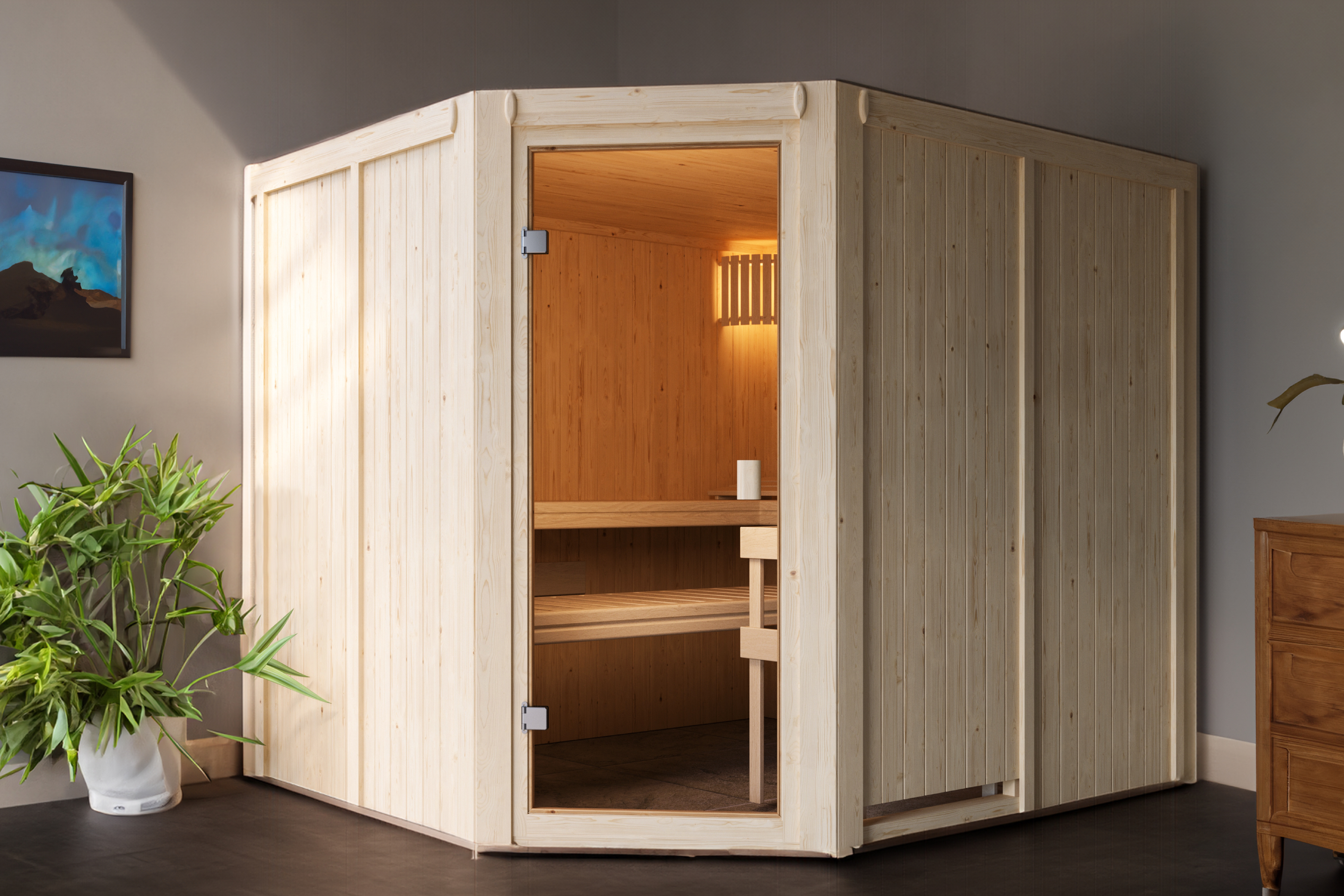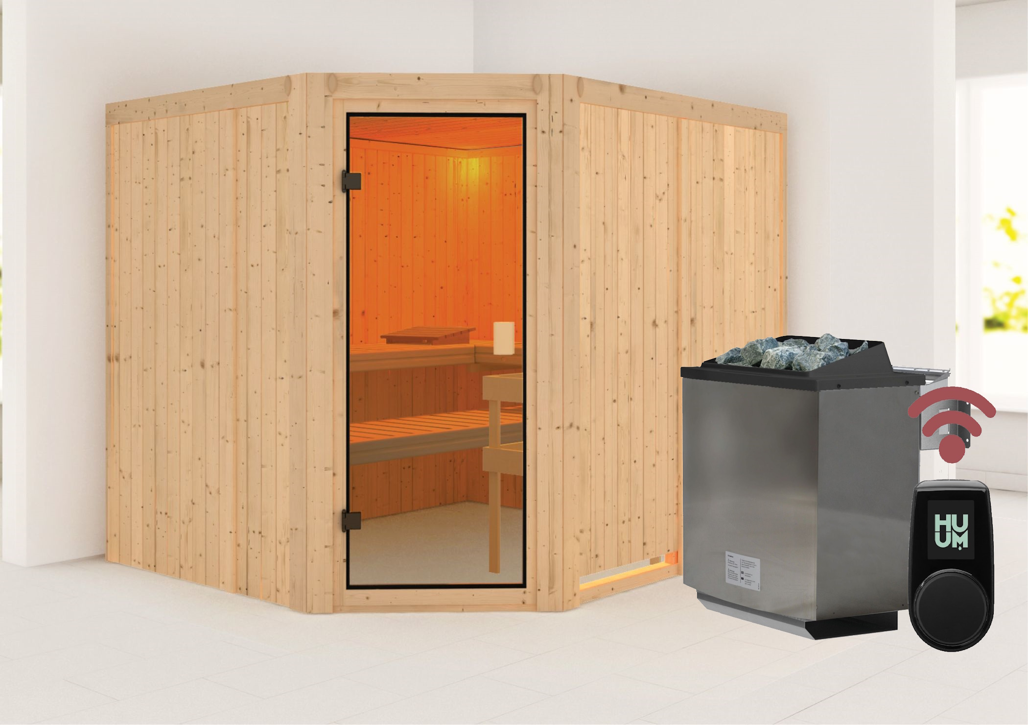 Karibu Innensauna "Sauna Hannah 4" 5 Personen 9 kW Bio-Kombi Ofen + Steuergerät HUUM WIFI