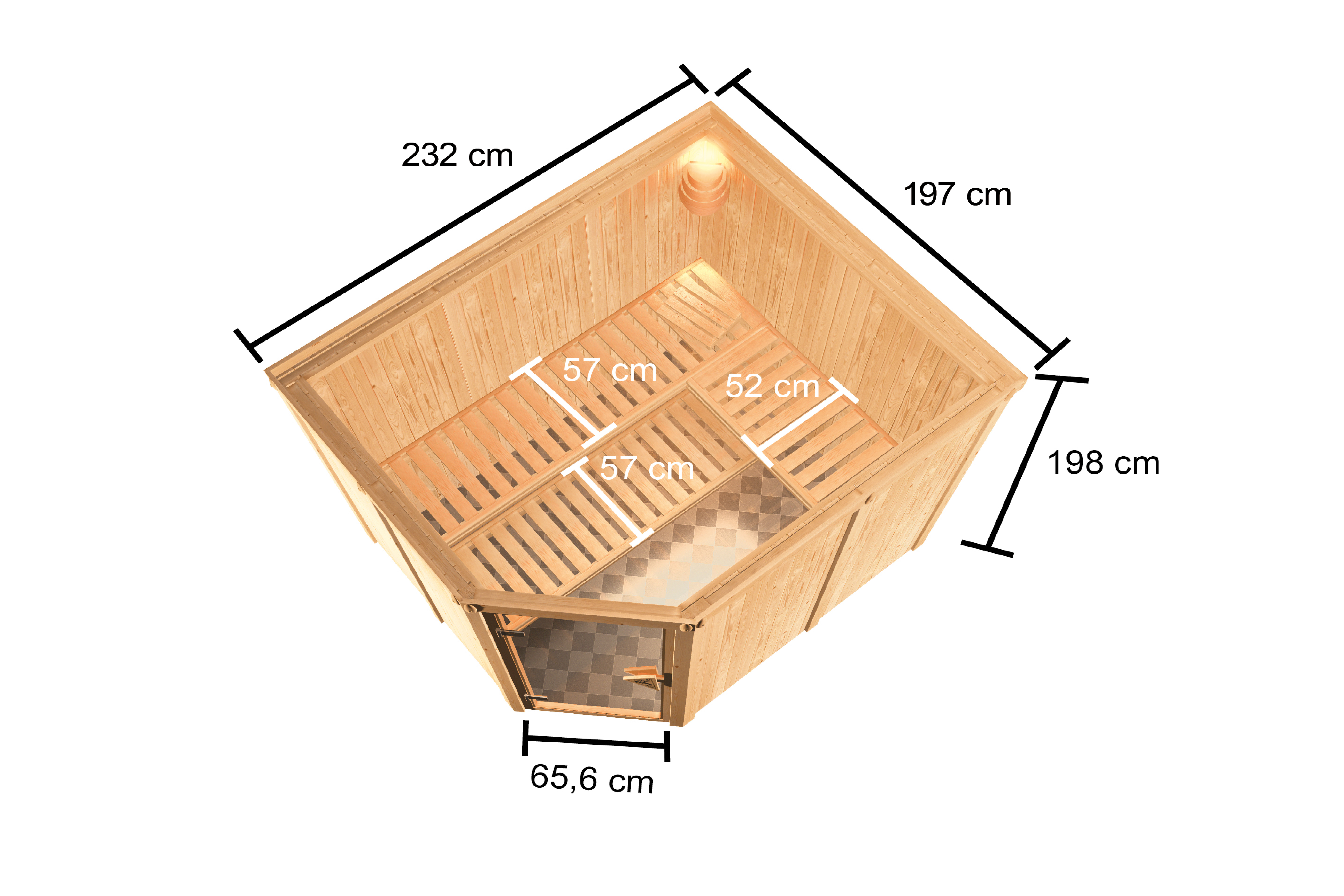 Sparen ohne Qualitätsverlust mit der System-Sauna Hannah 4 aus 68mm nordischem Fichtenholz.Die Sauna wird mit der einfachen Elementbauweise montiert und ermöglicht so eine schnelle Montage. Mit einem Außenmaß von 232 x 197 x 198 cm (B/T/H) bietet dieses Saunamodell ausreichend Platz zum gemeinsamen Entspannen und Wohlfühlen. Für Sitz oder Liegemöglichkeiten in der Sauna sorgen die 3 Saunabänke aus nordischem Fichtenholz. Erweitern können Sie die Innenausstattung mit unserem optional erhältlichen Zubehör. Mit dem 3er-SET der Kopfstütze-Premium können Sie nicht nur Ihren Kopf optimal stützen. Durch zusammenschieben zweier Kopfstützen schaffen Sie sich eine Venenstütze für die Beine. Bei Problemen der Atemwege können Ihnen unsere Salzkristalle helfen. Durch anbringen einer Salzkristall-Leuchte oder einer Salzkristall Vital Sole schaffen Sie eine wertvolle, salzhaltige Luft während des Saunierens. Diese ermöglicht eine schonende und wirkungsvolle Behandlung der Atemwege und kann Entzündungen vorbeugen. Erwärmen können Sie die Luft im Saunainneren durch den 9kW-Bio Saunaofen. Mit diesem ist neben dem normalen finnischen Saunieren auch eine Dampfsauna möglich. So können Sie die Sauna ganz leicht auf Ihre Wünsche und Bedürfnisse ausstatten. Vor Verbrennungen am heißen Saunaofen schützt Sie das, im Lieferumfang enthaltene, Ofenschutzgitter. Durch eine bronzierte Ganzglastür aus Einscheibensicherheitsglas mit Magnetverschlusstechnik wird die Saunakabine verschlossen und das Entweichen der Wärme wird verhindert. Richten Sie sich Ihre Saunalandschaft ein, mit der Massivholz-Sauna Hannah 4 und das zu einem fairen Preis ohne Qualitätsverlust.