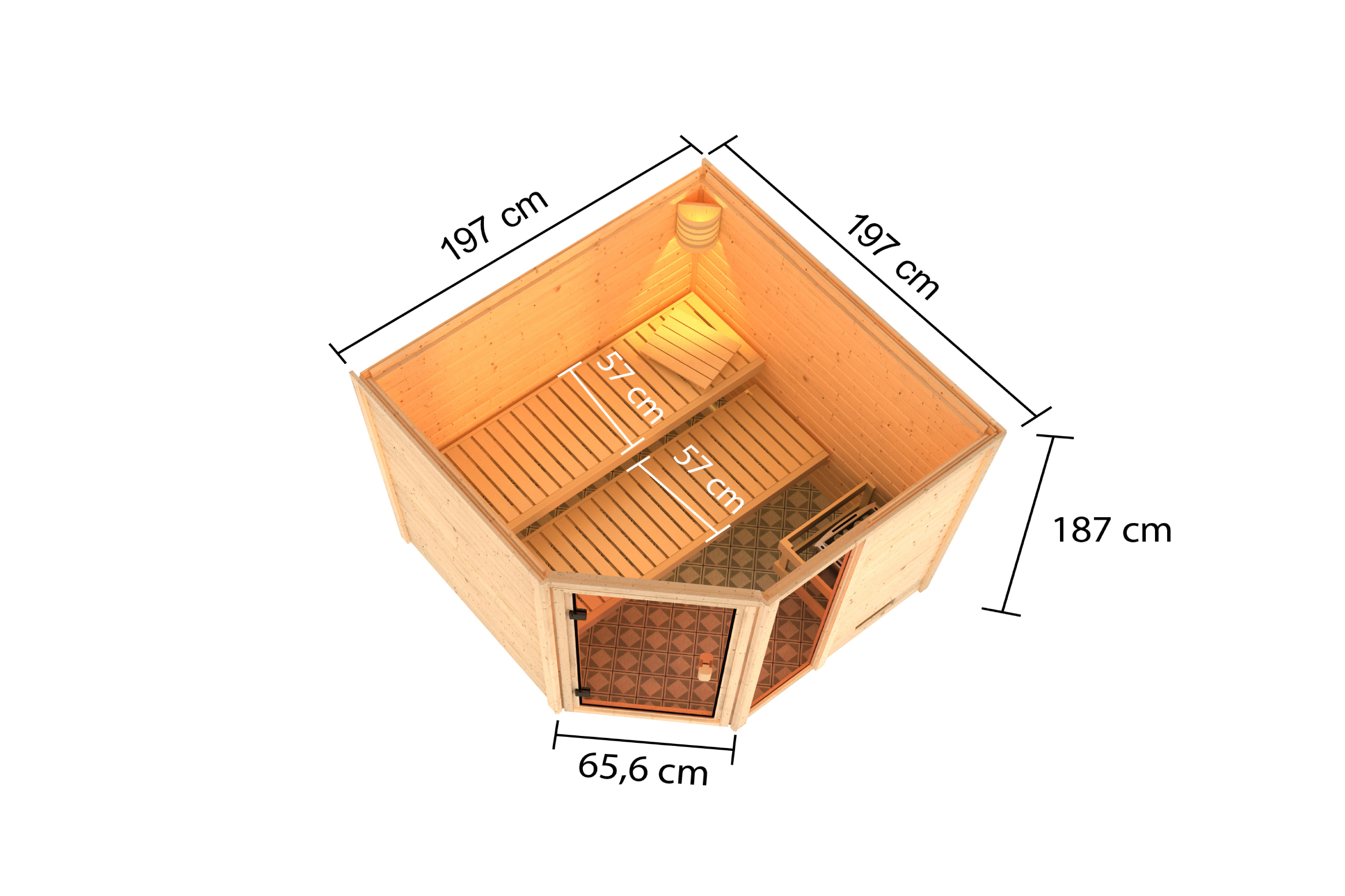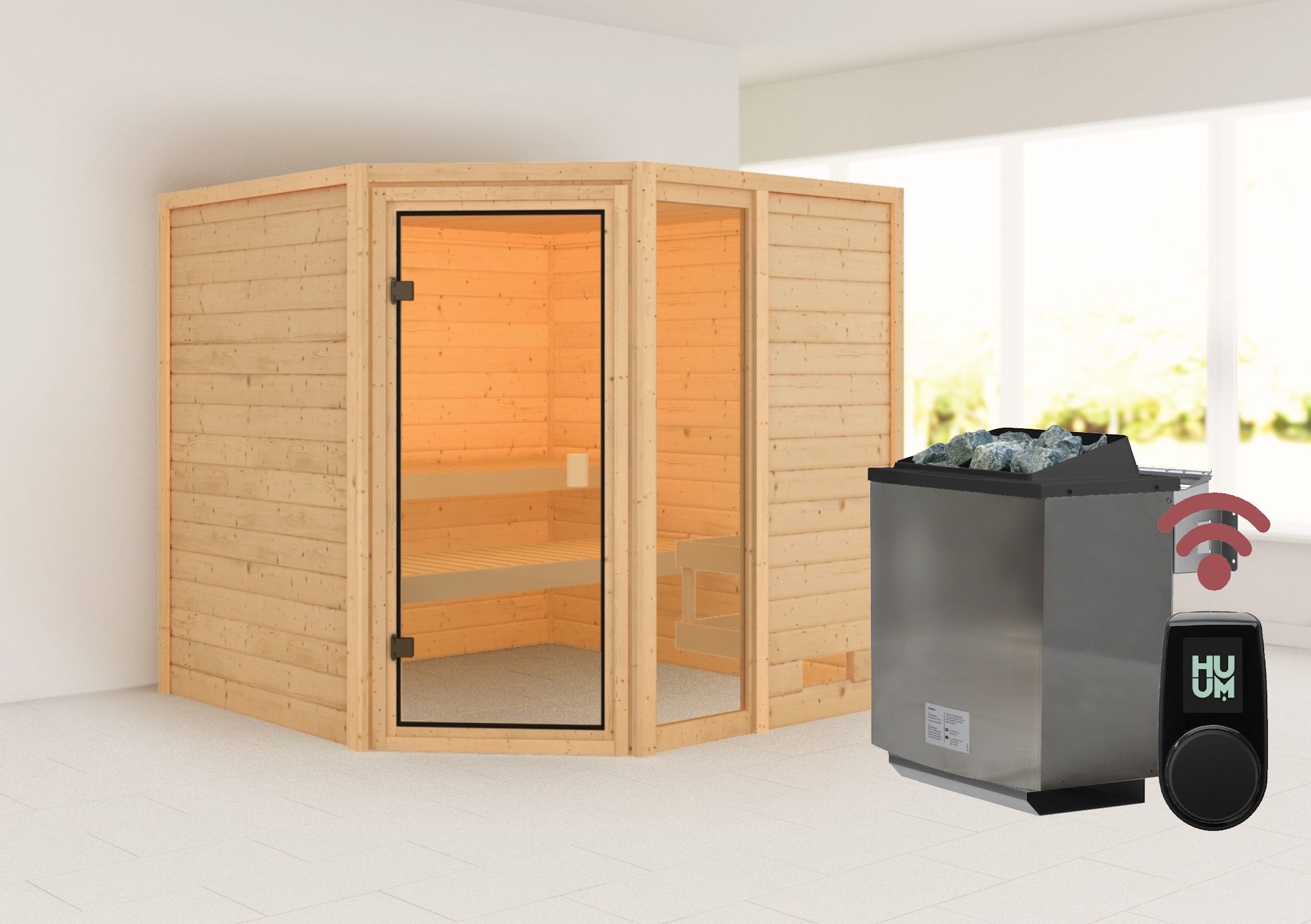 Karibu Massivholzsauna "Sauna Mila 7" 4 Personen 9 kW Bio-Kombi Ofen + Steuergerät HUUM WIFI