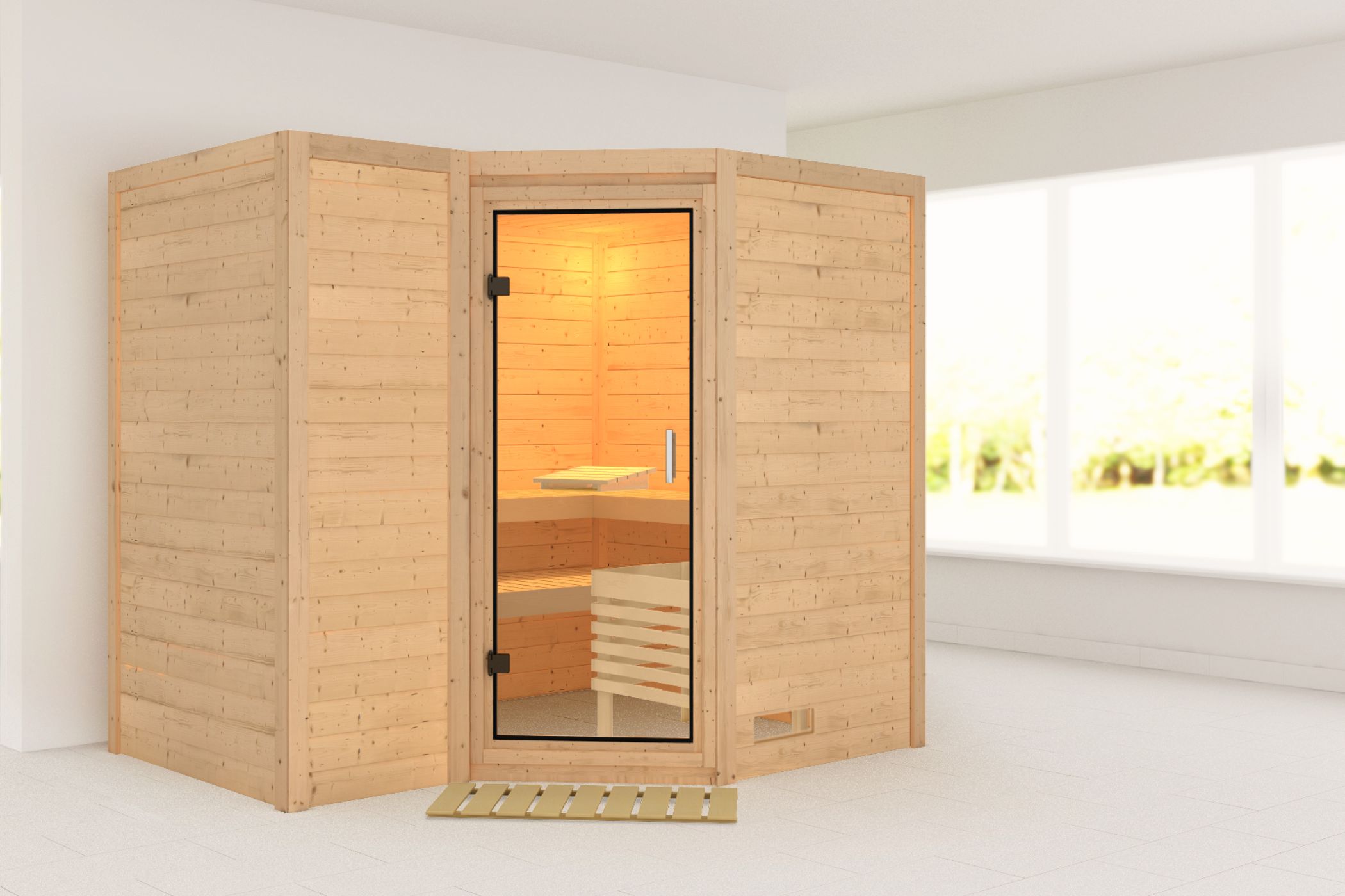 Karibu Massivholzsauna "Sauna Sahib 2" 4 Personen ohne Ofen Glastür (klar)