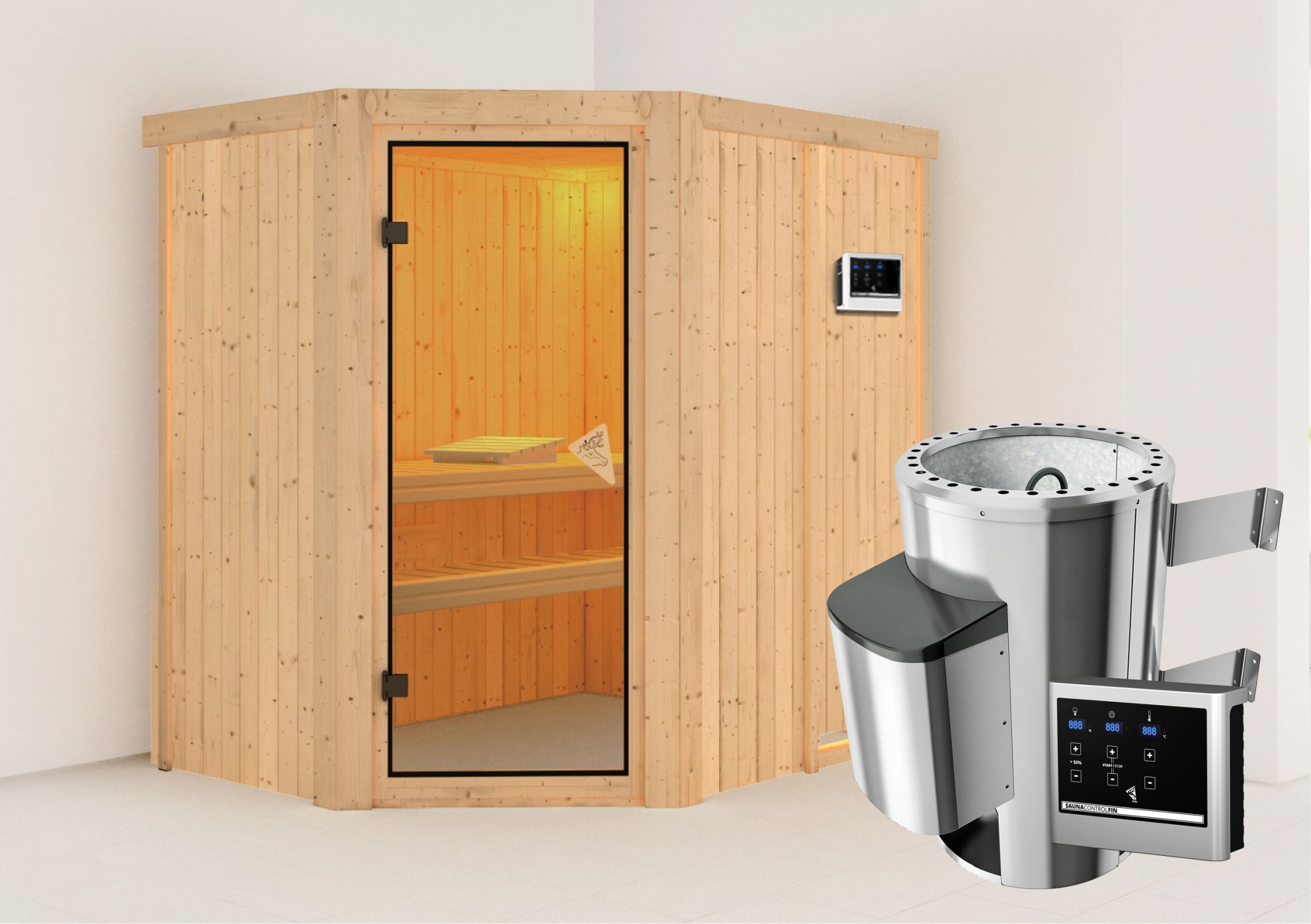 Karibu Innensauna "Sauna Saja" 3 Personen 230 V 3,6 kW Ofen (finnisch) + Steuergerät Glastür (braun getönt)