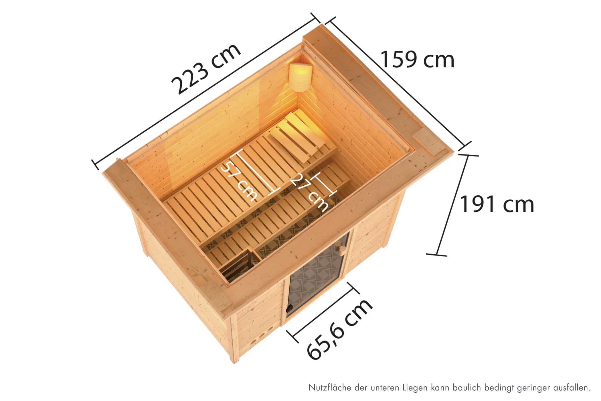 Karibu Massivholzsauna "Sauna Selena" 2 Personen 9 kW Ofen (finnisch) + Steuergerät mit Dachkranz
