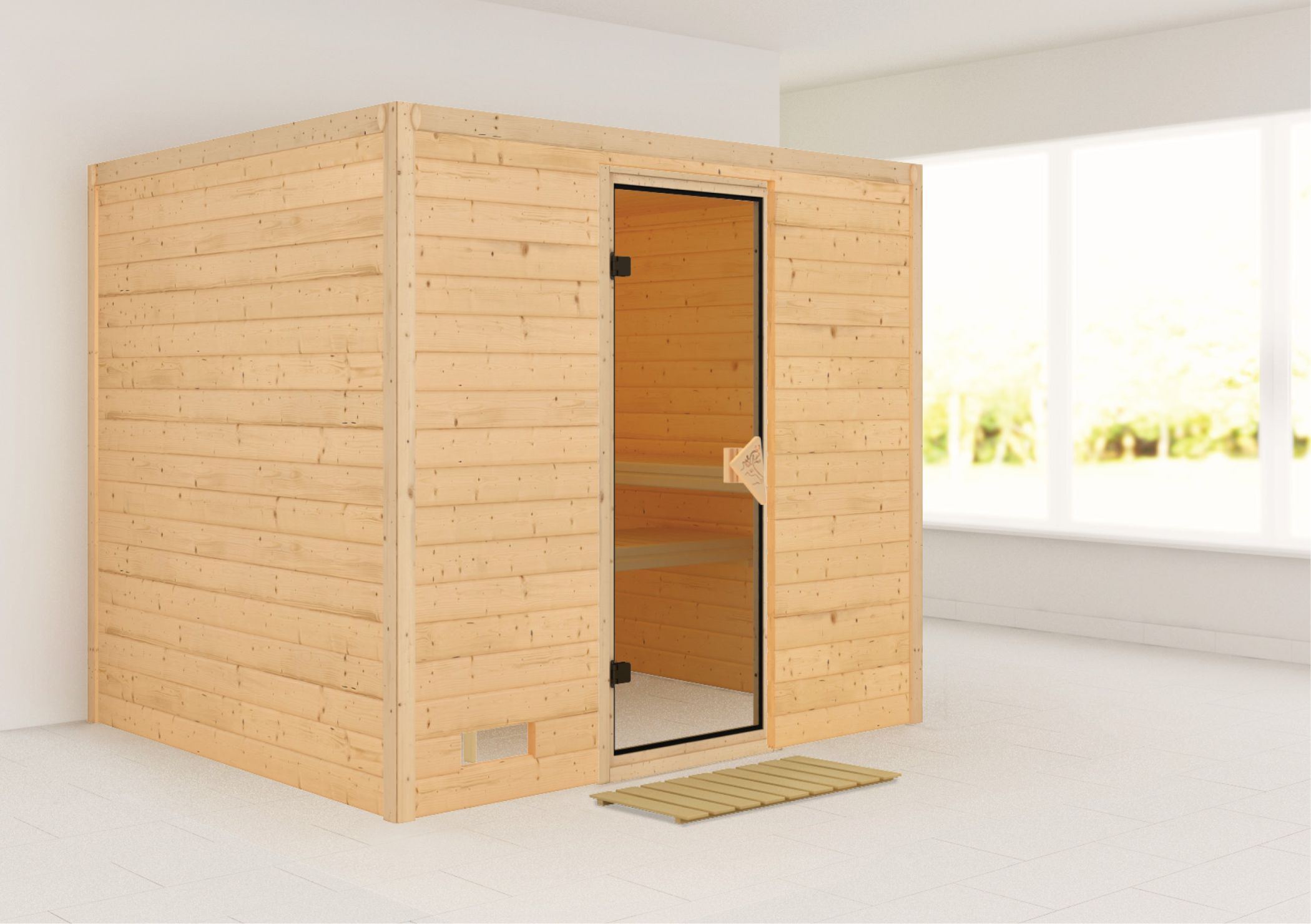Karibu Massivholzsauna "Sauna Sonara" 5 Personen ohne Ofen Glastür (braun getönt)