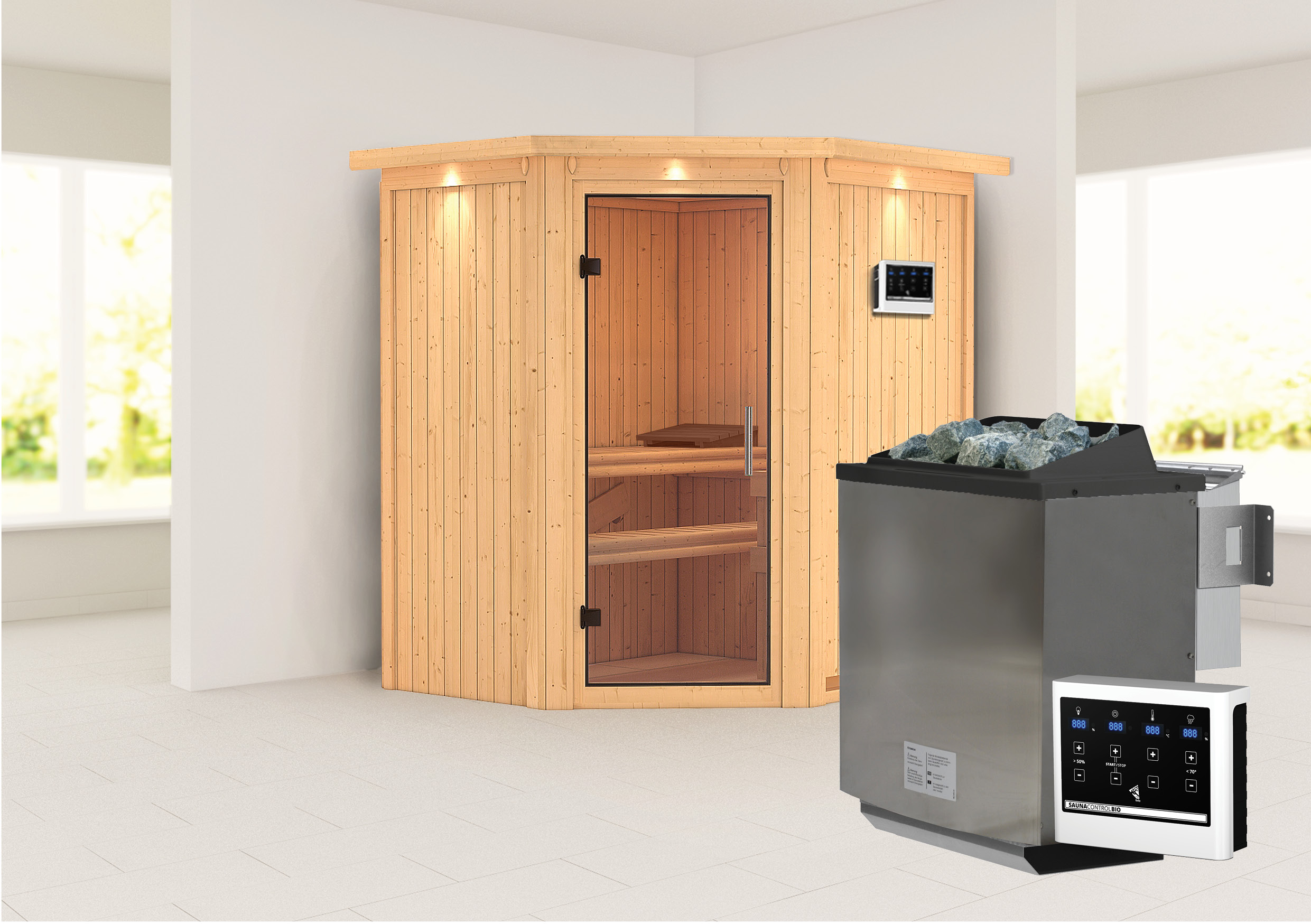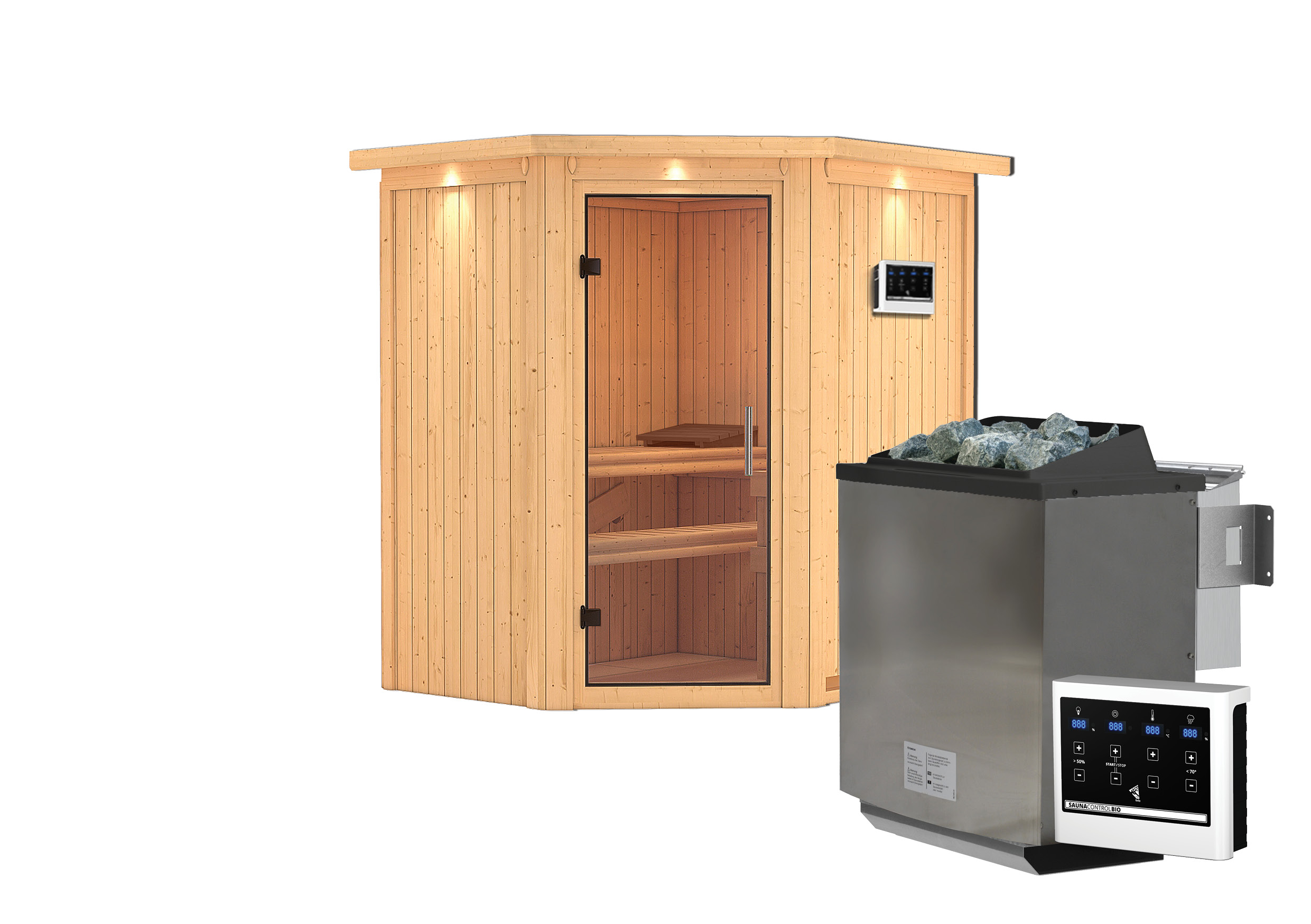 Karibu Innensauna "Sauna Taurin" Bio Sauna 2 Personen 9 kW Bio-Kombi Ofen + Steuergerät Glastür (klar) mit Dachkranz