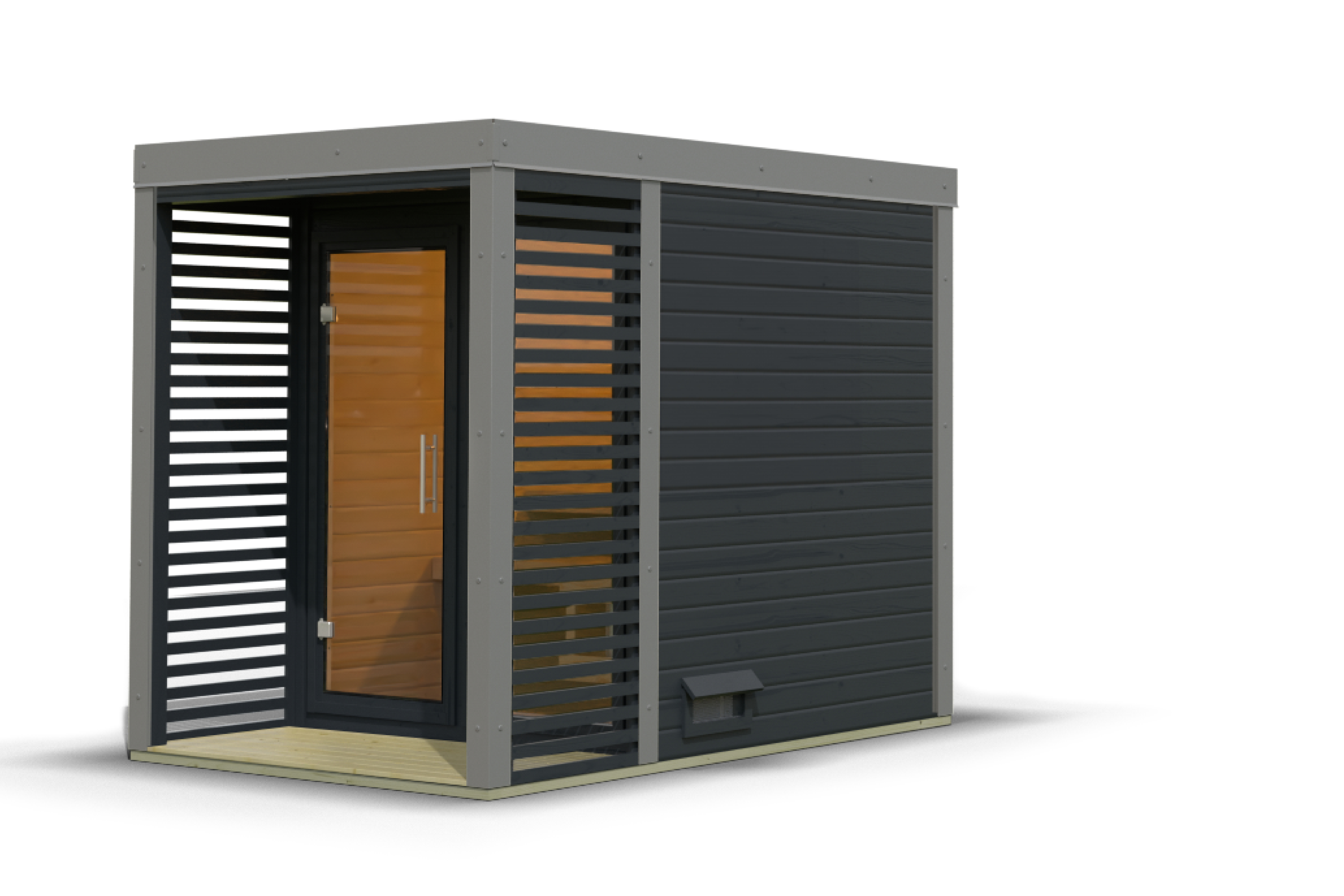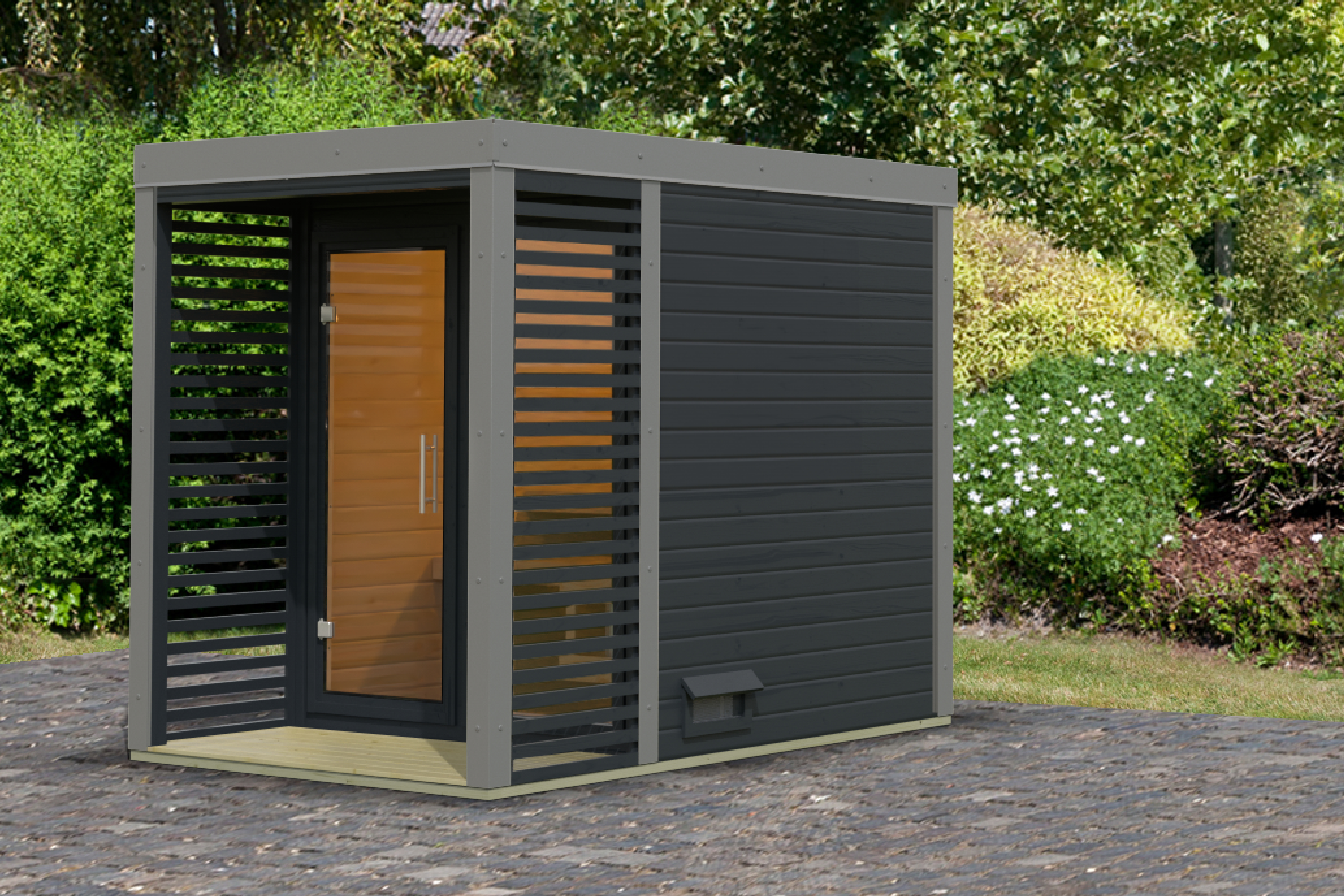 Die Wände bestehen aus nordischer Fichte, bekannt für ihre natürliche Schönheit und Robustheit. Stahlecken verleihen dem Design einen modernen Touch. Ein großer Vorteil ist die geringe Wartung, dank der Stahlelemente im Vergleich zu reinen Holzgartenhäusern. So haben Sie mehr Zeit zum Saunieren statt zur Instandhaltung.