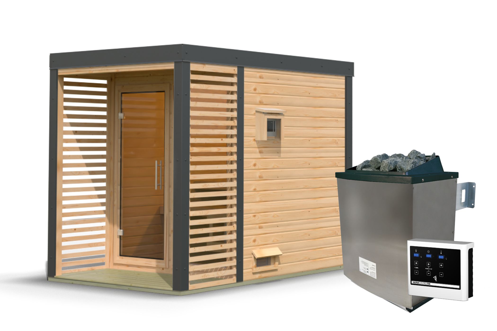 Karibu Gartensauna "Saunahaus Ares 1" 4 Personen Natur 9 kW Ofen (finnisch) + Steuergerät