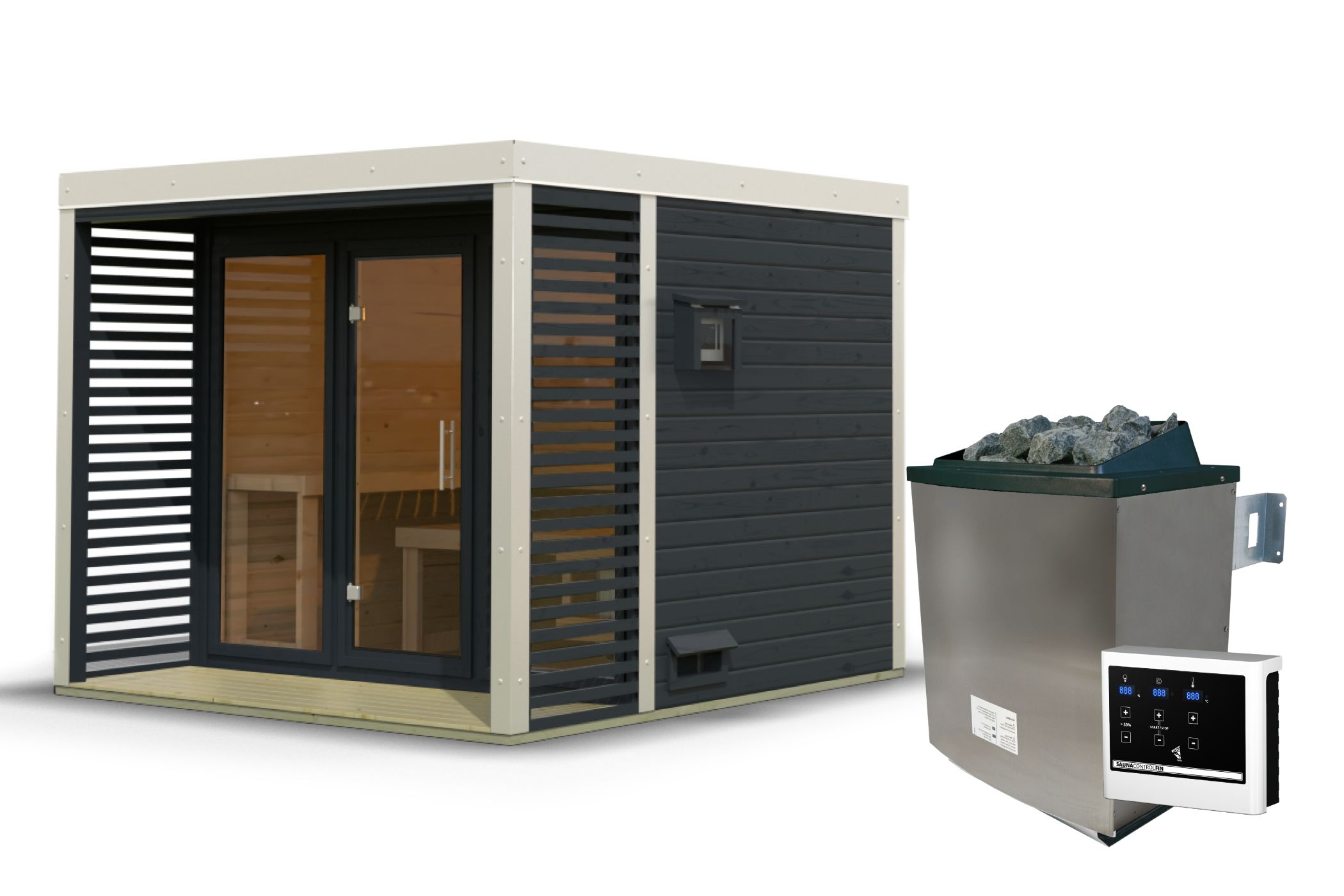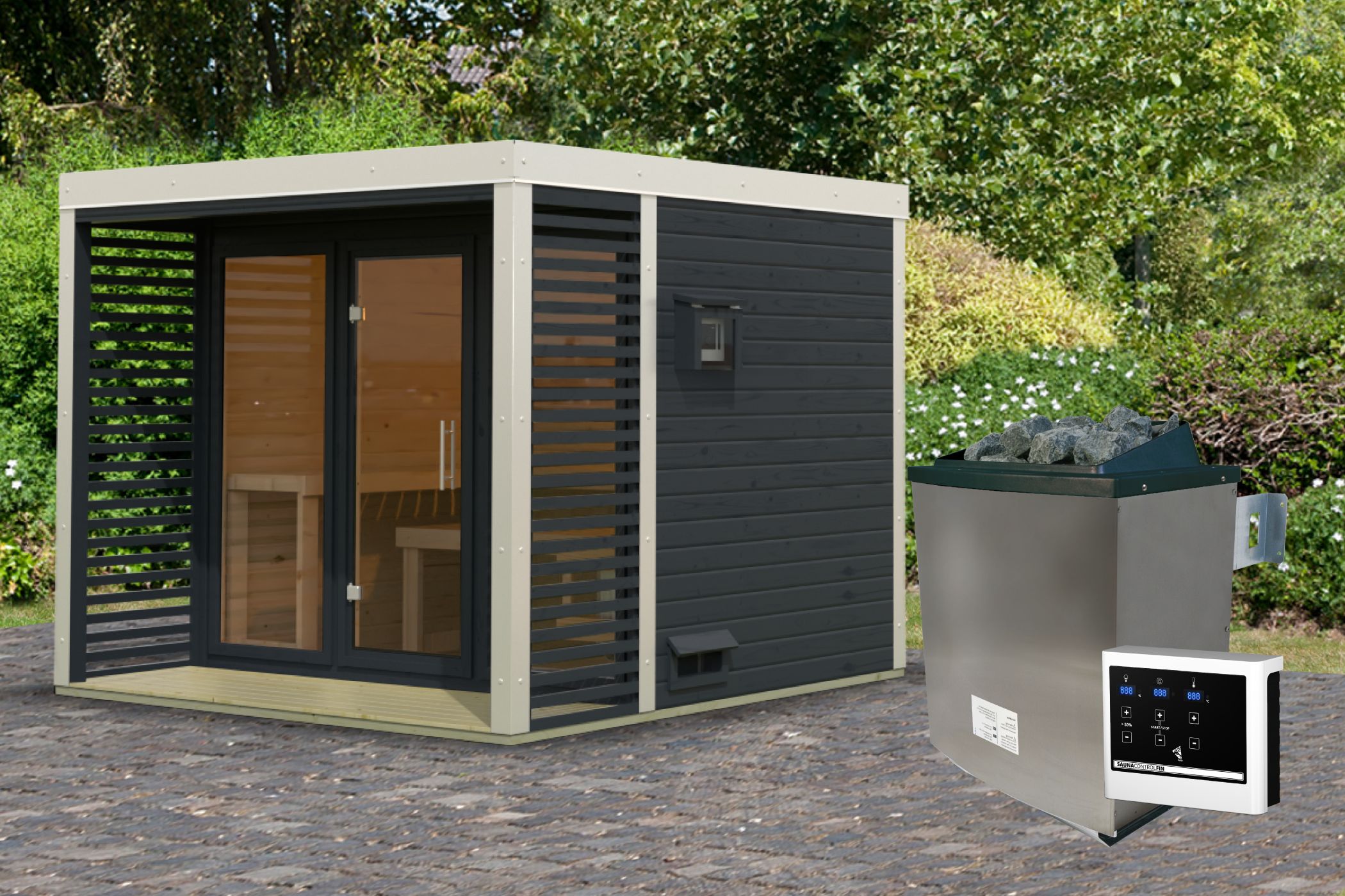 Karibu Gartensauna "Saunahaus Ares 3" 5 Personen Anthrazit 9 kW Ofen (finnisch) + Steuergerät