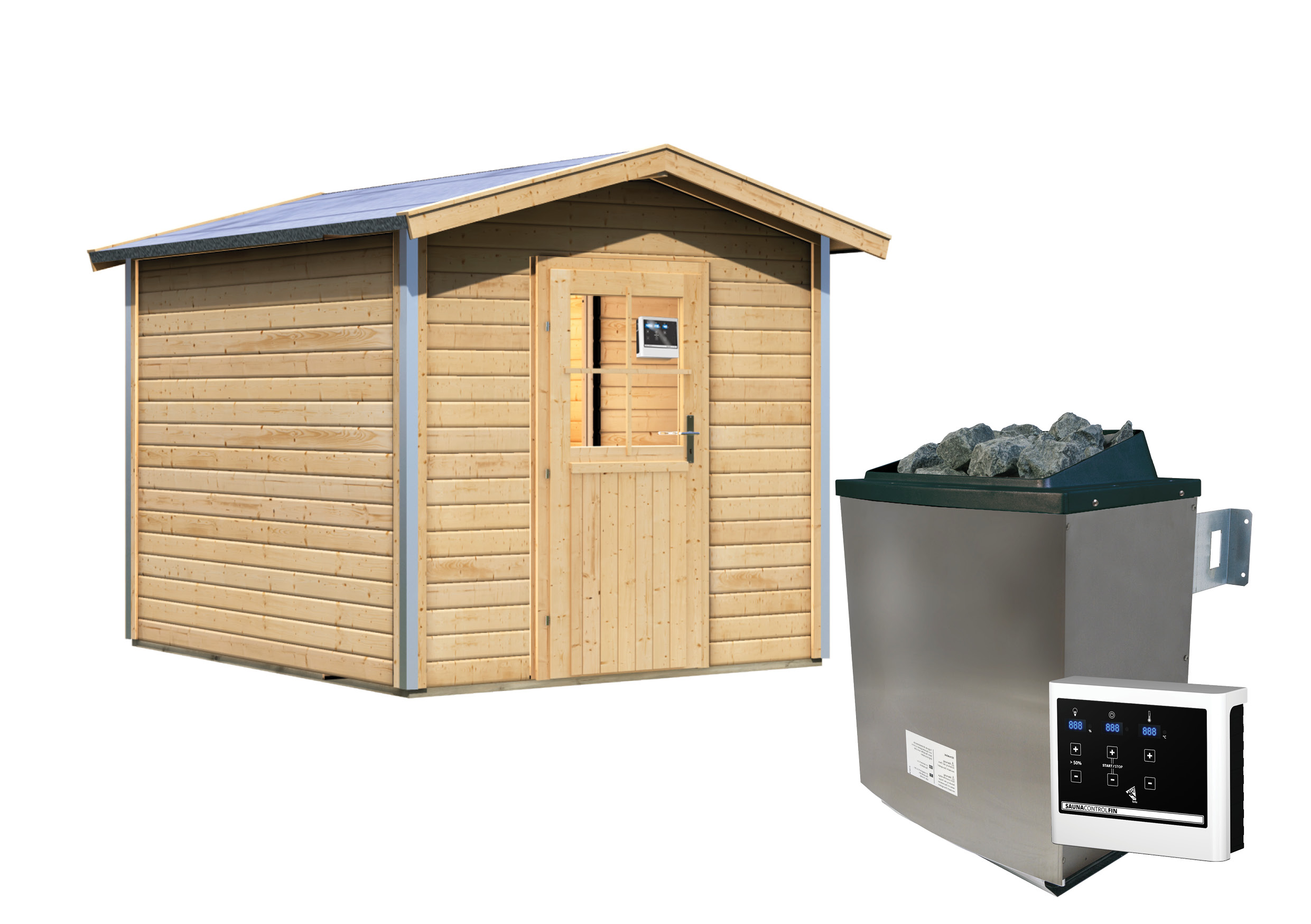 Das Saunahaus besteht aus 38mm starken Massivholzbohlen aus nordischer Fichte und wird im einfachen Steck- und Schraubsystem montiert, welches eine schnelle Montage des Saunahauses ermöglicht. Der Saunainnenraum verfügt über 3 Saunaliegen aus Espenholz, welche für ein besonders angenehmes Sitz- und Liegegefühl sorgen. Durch unser optional erhältliches Zubehör, wie die Kopfstütze-Premium, eine ergonomische Rückenlehne oder ein LED-Farblicht, können Sie Ihre Sauna nach Belieben ausstatten. Schaffen Sie sich ganz einfach Ihre persönlich perfekte Wellness-Oase. Abgetrennt werden die Räume durch eine bronzierte Ganzglastür mit Einscheibensicherheitsglas. Das Dach besteht aus Massivholz und wird im Saunabereich durch eine Rahmenkonstruktion mit Mineralwolldämmung verstärkt. So kann keine Wärme aus der Saunakabine entweichen.