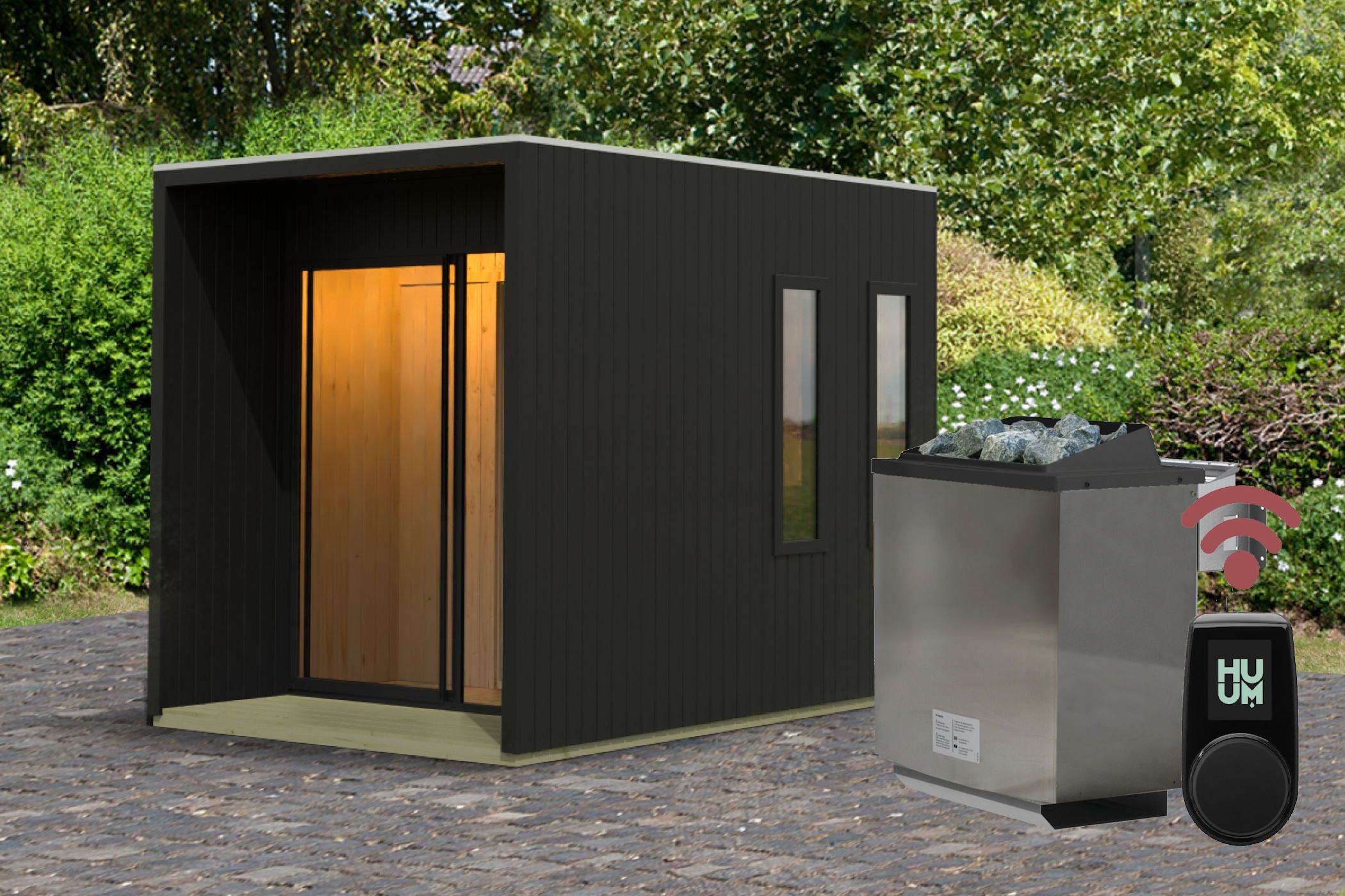 - Im Set inkl. Ofen (nach Wahl)/ HUUM WiFi Steuergerät (App Steuerung möglich) und Saunasteine
