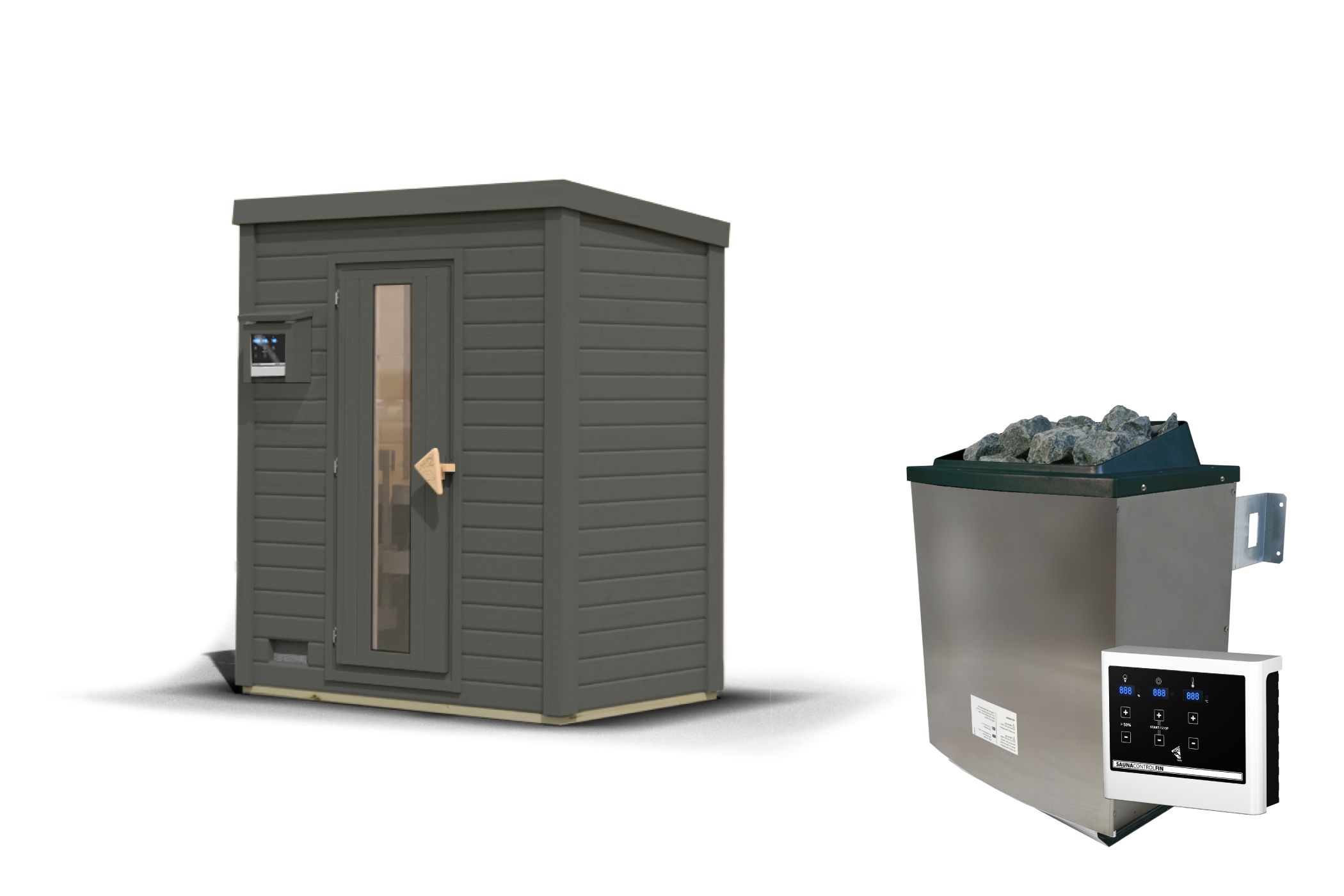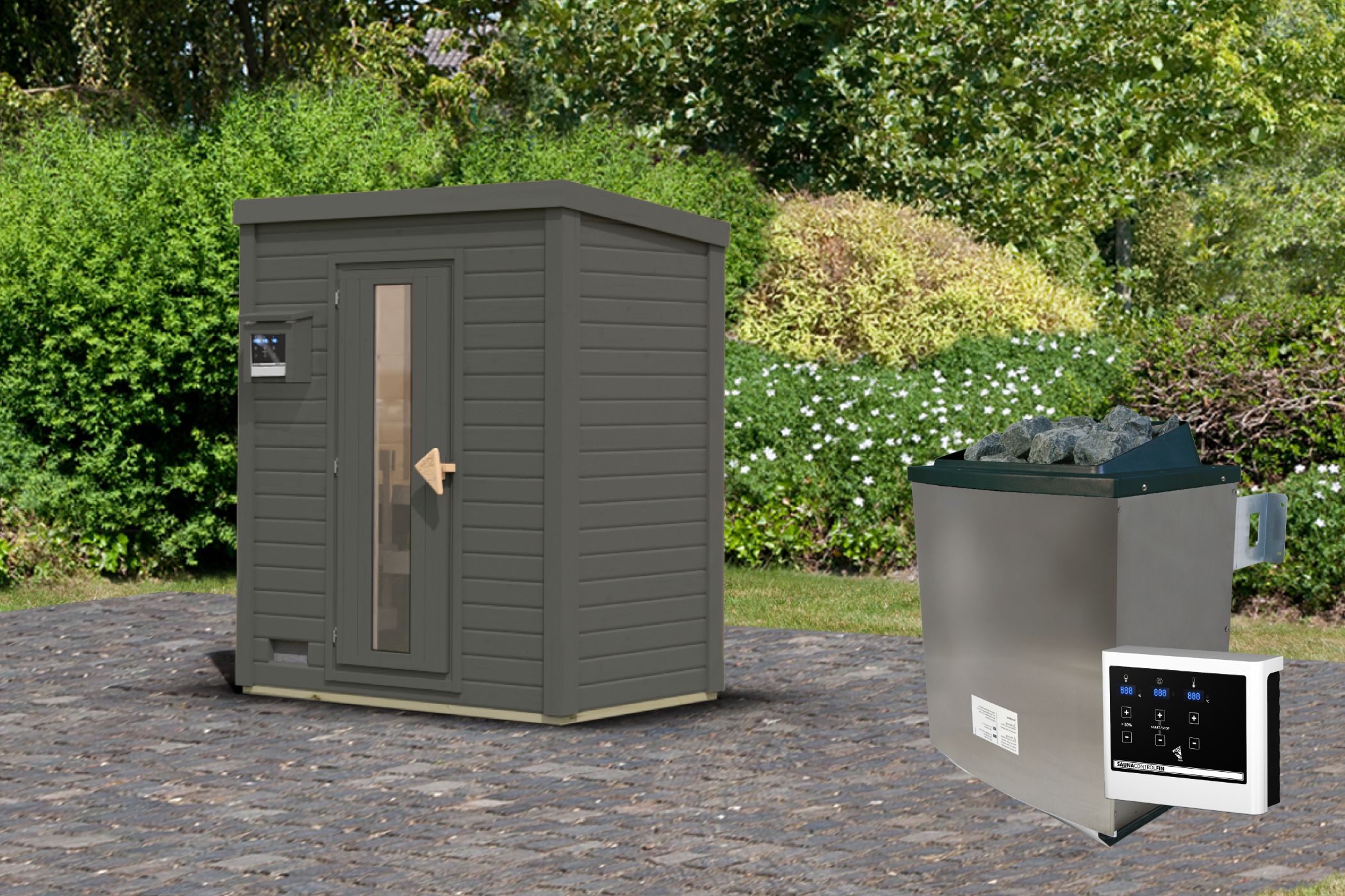 Karibu Mini Gartensauna "Saunahaus Hytti 0" 2 Personen Terragrau 9 kW Ofen (finnisch) + Steuergerät