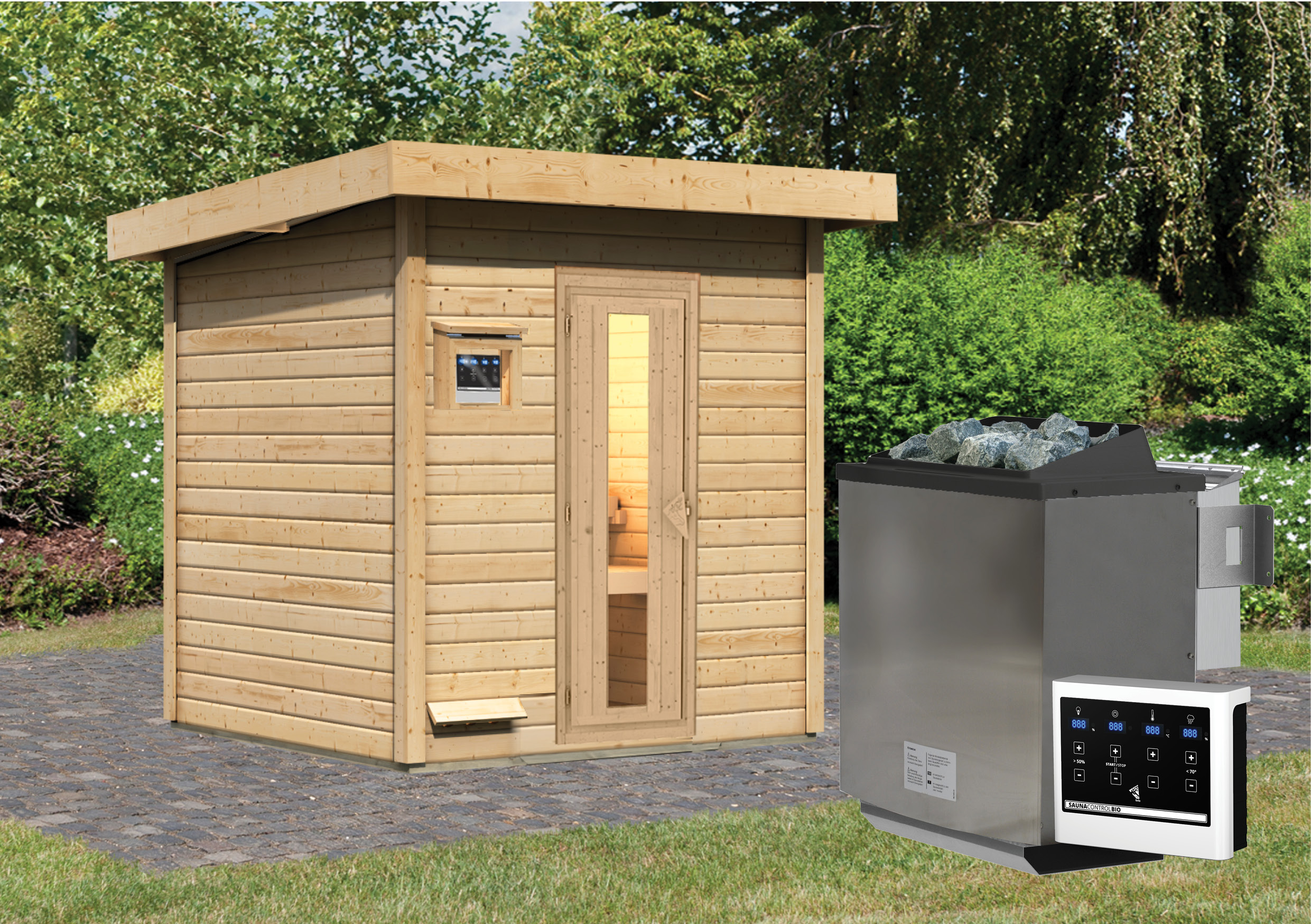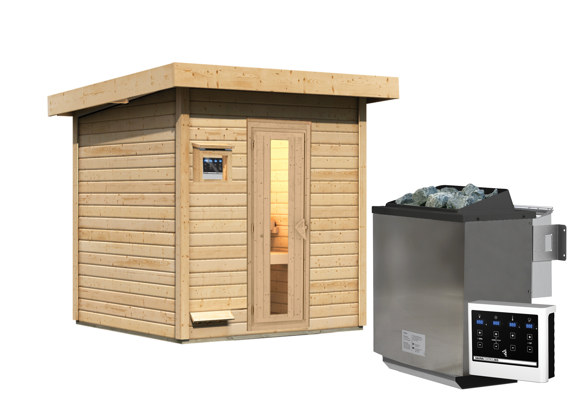 Karibu Mini Gartensauna "Saunahaus Hytti 2" 4 Personen Natur 9 kW Bio-Kombi Ofen + Steuergerät