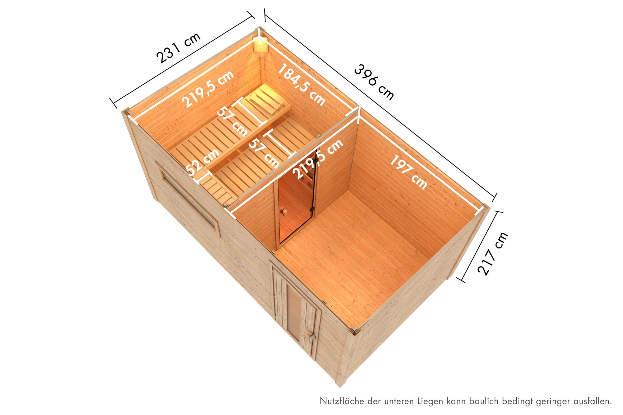 Das Außenmaß von 396 cm x 231 cm sorgt für ausreichende Platzverhältnisse bei Ihrem Saunagang. Unterstrichen wird dieses Maß von den Abmessungen des Saunaraums mit 219,5 cm x 184,5 cm. Für die nötige Entspannung sorgen 3 Saunabänke. Von wegen innere Werte: auch von außen punktet unser Saunahaus mit Qualität und durchdachten Lösungen. Das hochwertige Pultdach aus Massivholz sorgt dafür, dass Sie in der Sauna auch langfristig einen kühlen Kopf bewahren können. Das Thema konstruktiver Holzschutz wird mit einem Dachüberstand von 75 / 105 / 55 ausreichend berücksichtigt. So bleiben Türen und Wandbretter optimal geschützt. Unterhalb des Hauses sorgen unsere kesseldruckimprägnierten Bodenbalken in Verbindung mit dem mitgelieferten Massivholzboden für ausreichenden Schutz vor Staunässe oder aufsteigender Feuchtigkeit.