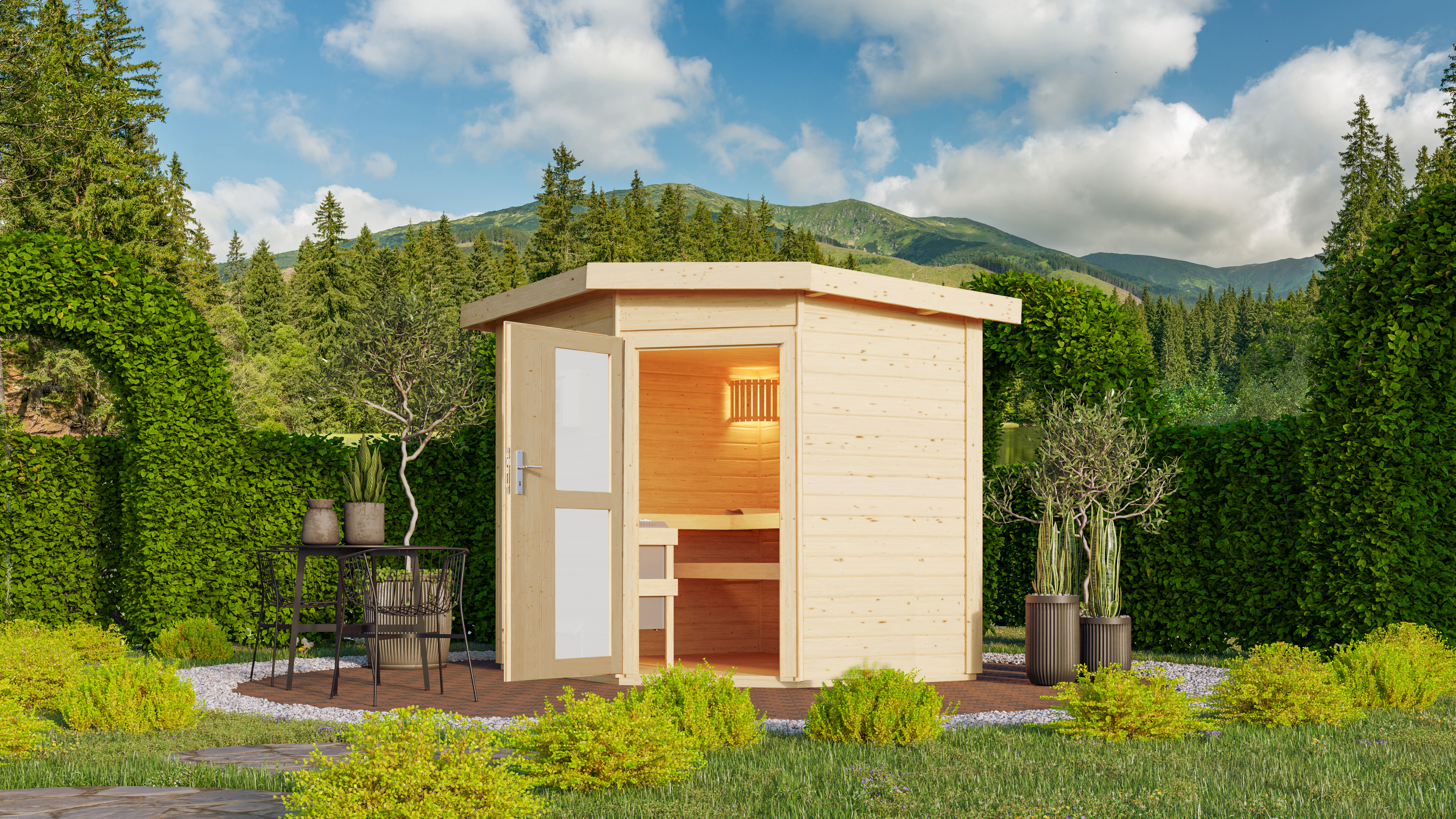 - 5-Eck-Saunahaus perfekt für die Grundstücksgrenze
