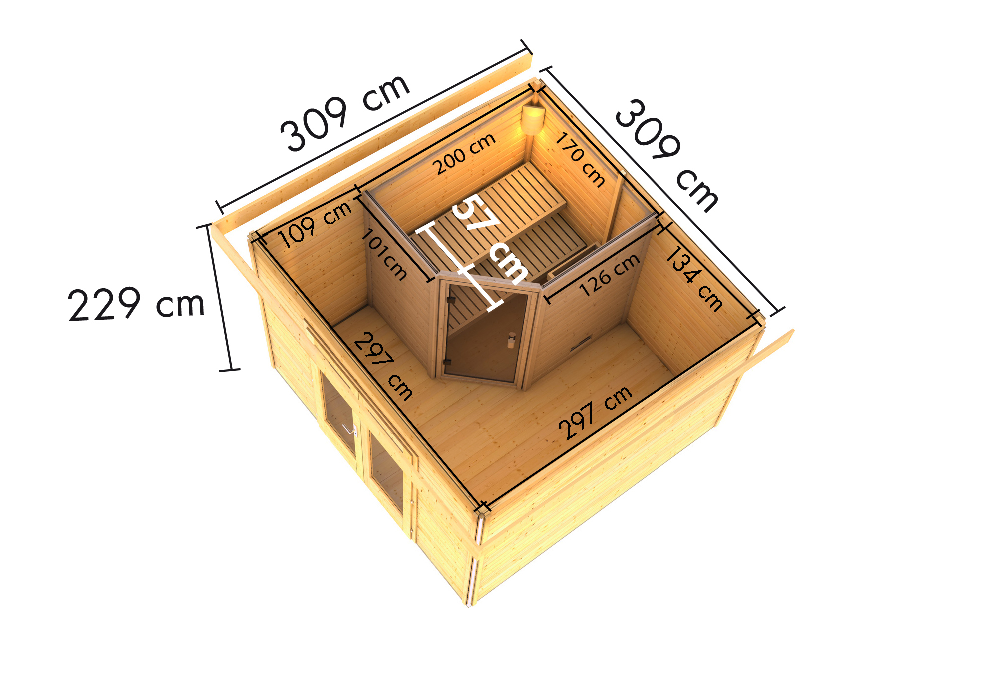 Das Saunahaus hat eine Wandstärke von 38 mm und wird mittels Steck- und Schraubsystem miteinander verschraubt. Es hat ein Außenmaß von 309 x 309 cm und eine Höhe von 229 cm. Es wird durch eine extra hohe Glas-Doppelflügeltür mit Zylinderschloss betreten. Für eine moderne Optik hat das Saunahaus an den Kanten eine Chromeline-Eckverbindung, so werden Kanten optimal verdeckt.