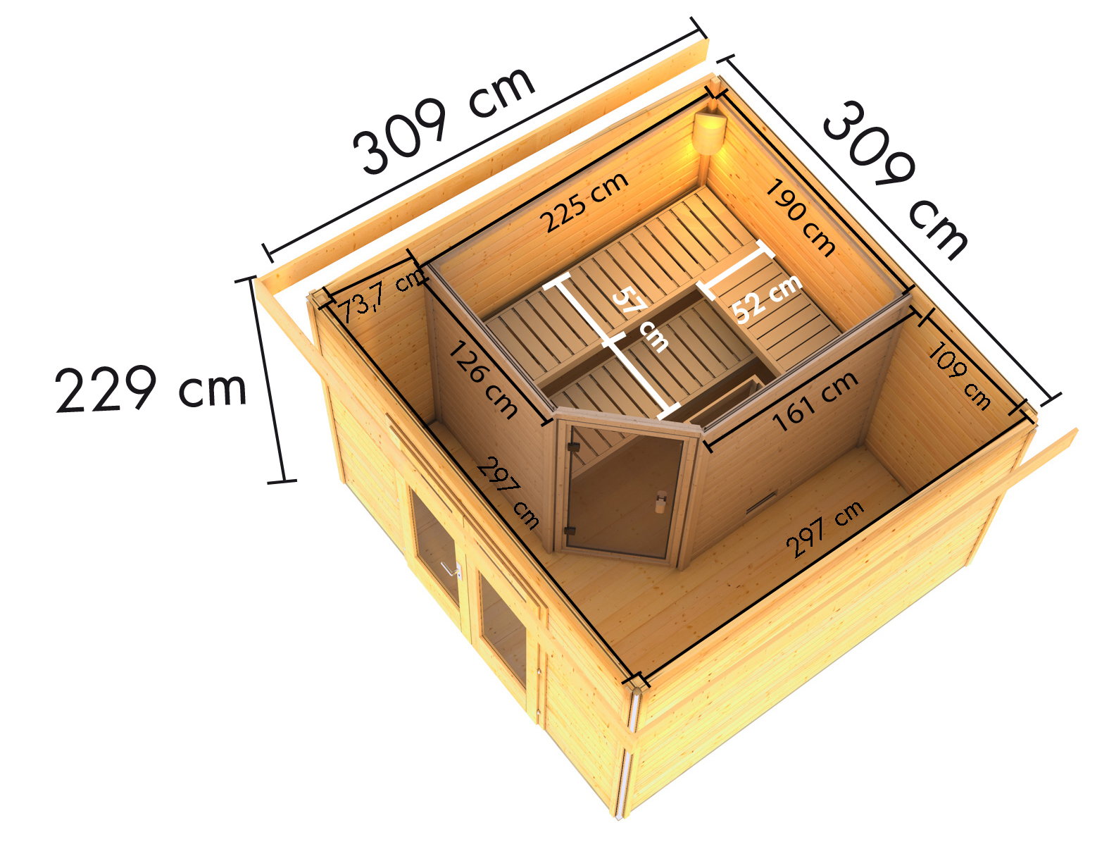 Das Saunahaus hat eine Wandstärke von 38 mm und wird mittels Steck- und Schraubsystem miteinander verschraubt. Es hat ein Außenmaß von 309 x 309 cm und eine Höhe von 229 cm. Es wird durch eine extra hohe Glas-Doppelflügeltür mit Zylinderschloss betreten. Für eine moderne Optik hat das Saunahaus an den Kanten eine Chromeline-Eckverbindung, so werden Kanten optimal verdeckt.