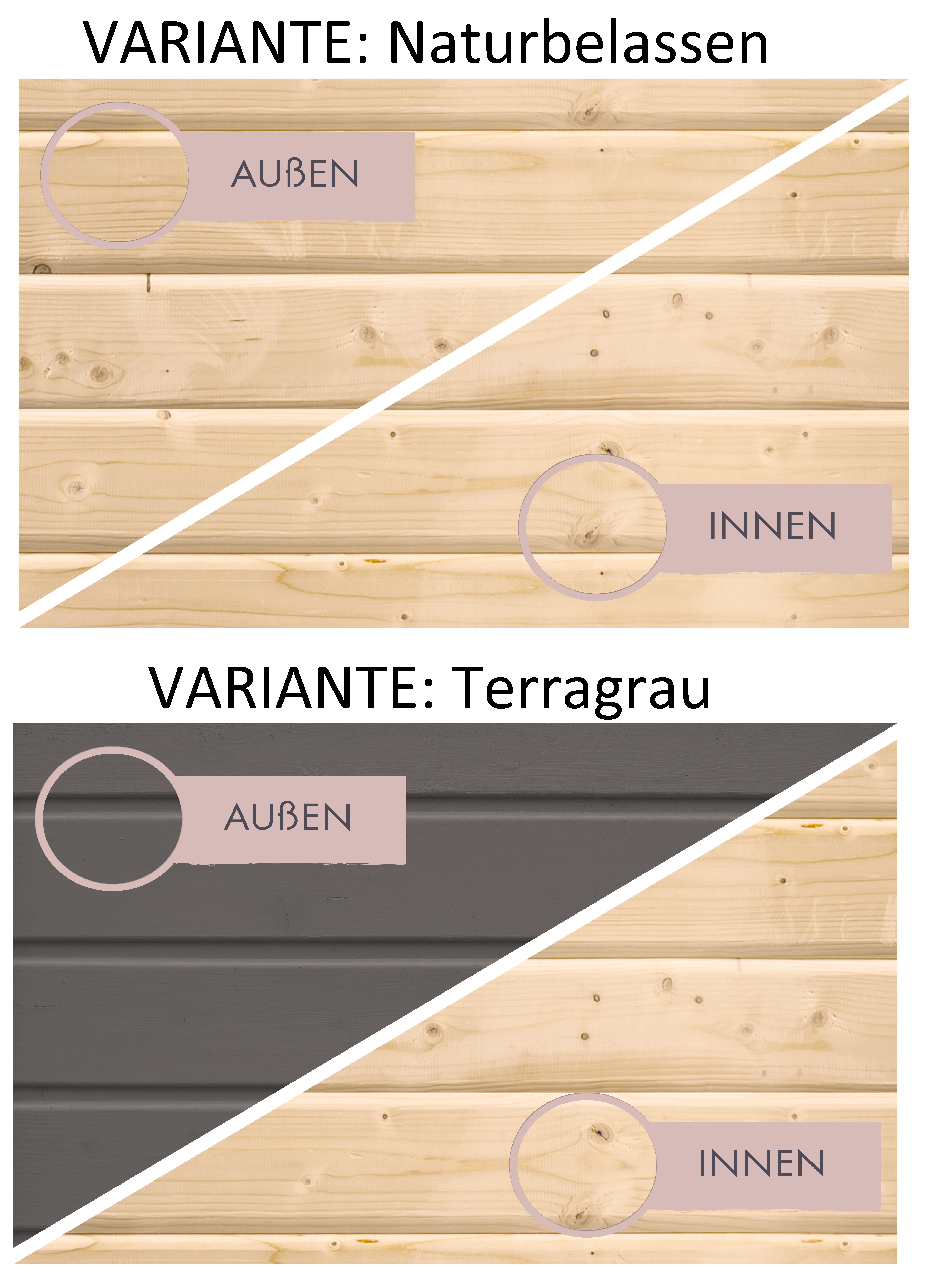 Unsere Saunahaus-Reihe Mainburg überzeugt mit großem Vorraum, welcher individuell genutzt werden kann. Zudem kann man die Sauna im Inneren aus zwei verschiedenen Größen wählen. Die Innensauna hat ein Maß von 200 x 170 cm mit 2 Liegen (SET A) oder 225 x 190 cm mit 3 Liegen (SET B). Im Lieferumfang sind ebenfalls 2 Fenster für größeren Lichteinfall enthalten.