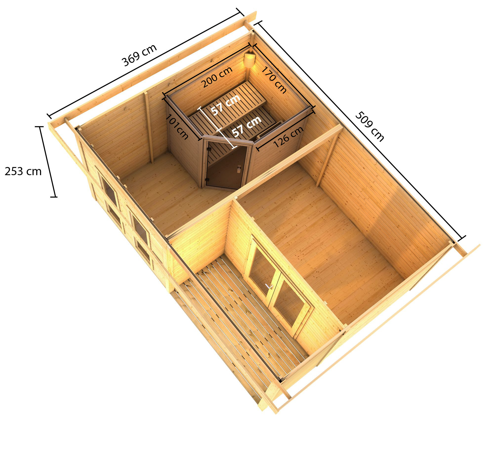 Das Saunahaus hat eine Wandstärke von 38 mm und wird mittels Steck- und Schraubsystem miteinander verschraubt. Es hat ein Außenmaß von 509 x 369 cm und eine Höhe von 253 cm. Es wird durch eine extra hohe Glas-Doppelflügeltür mit Zylinderschloss betreten.