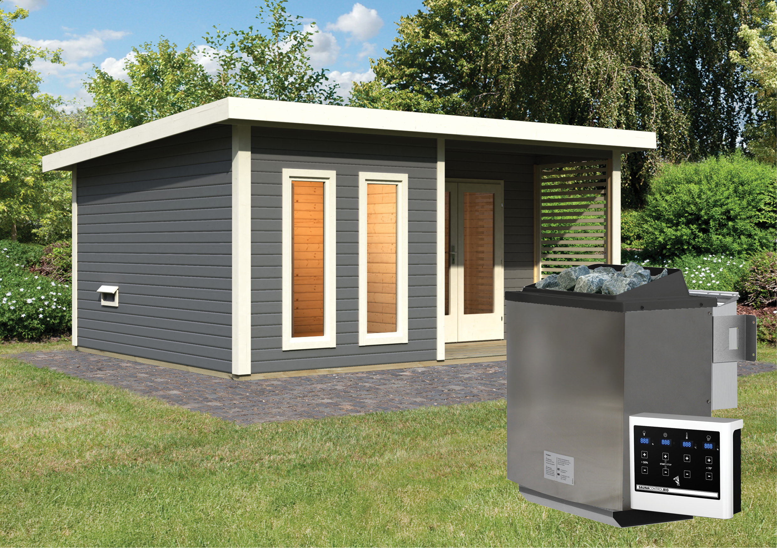 Karibu Gartensauna "Saunahaus Mainburg 5" mit Vorraum 4 Personen Terragrau 9 kW Bio-Kombi Ofen + Steuergerät