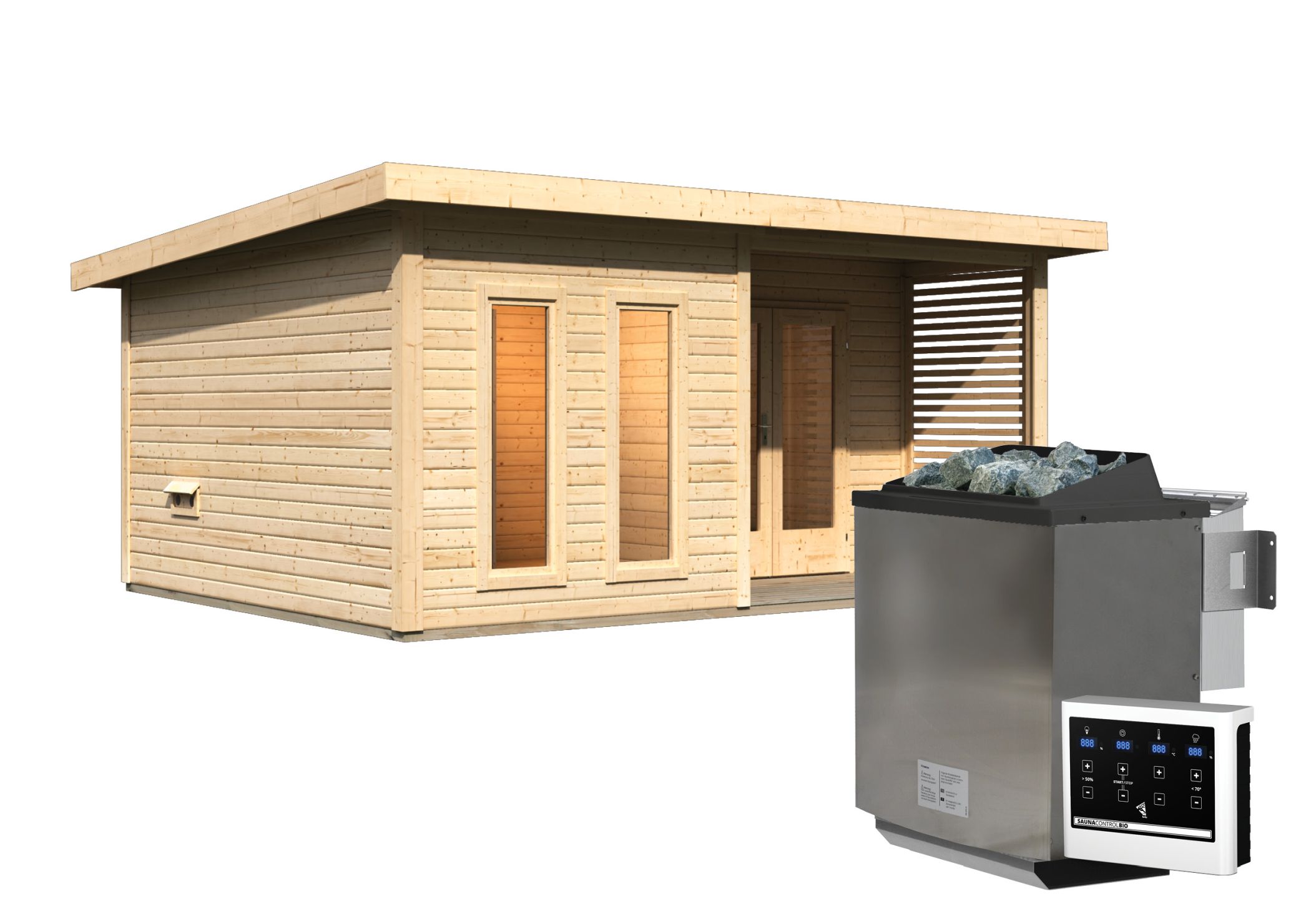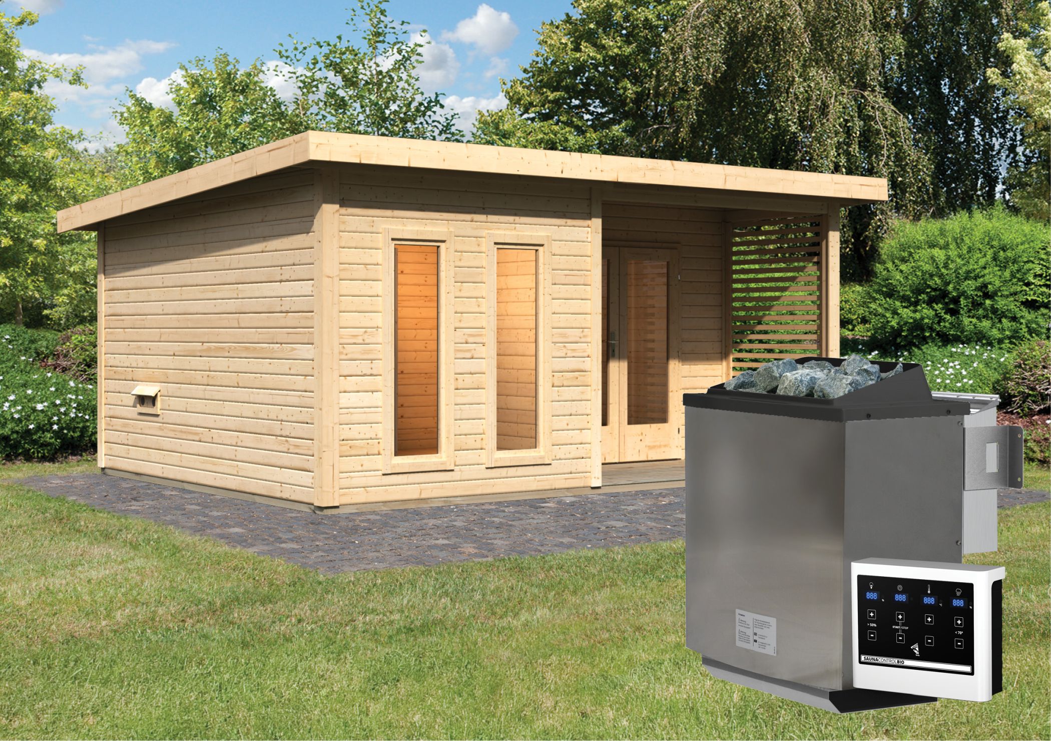 Karibu Gartensauna "Saunahaus Mainburg 5" mit Vorraum 5 Personen Natur 9 kW Bio-Kombi Ofen + Steuergerät