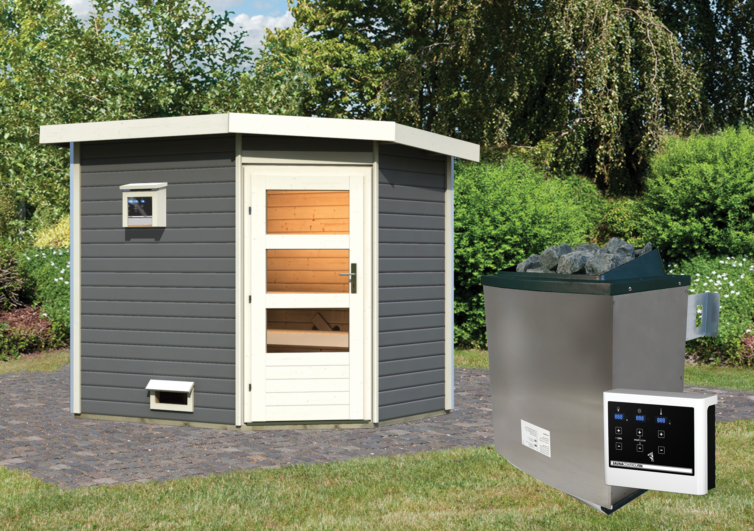 Karibu Mini Gartensauna "Saunahaus Mikka" 5 Personen Terragrau 9 kW Ofen (finnisch) moderne Tür