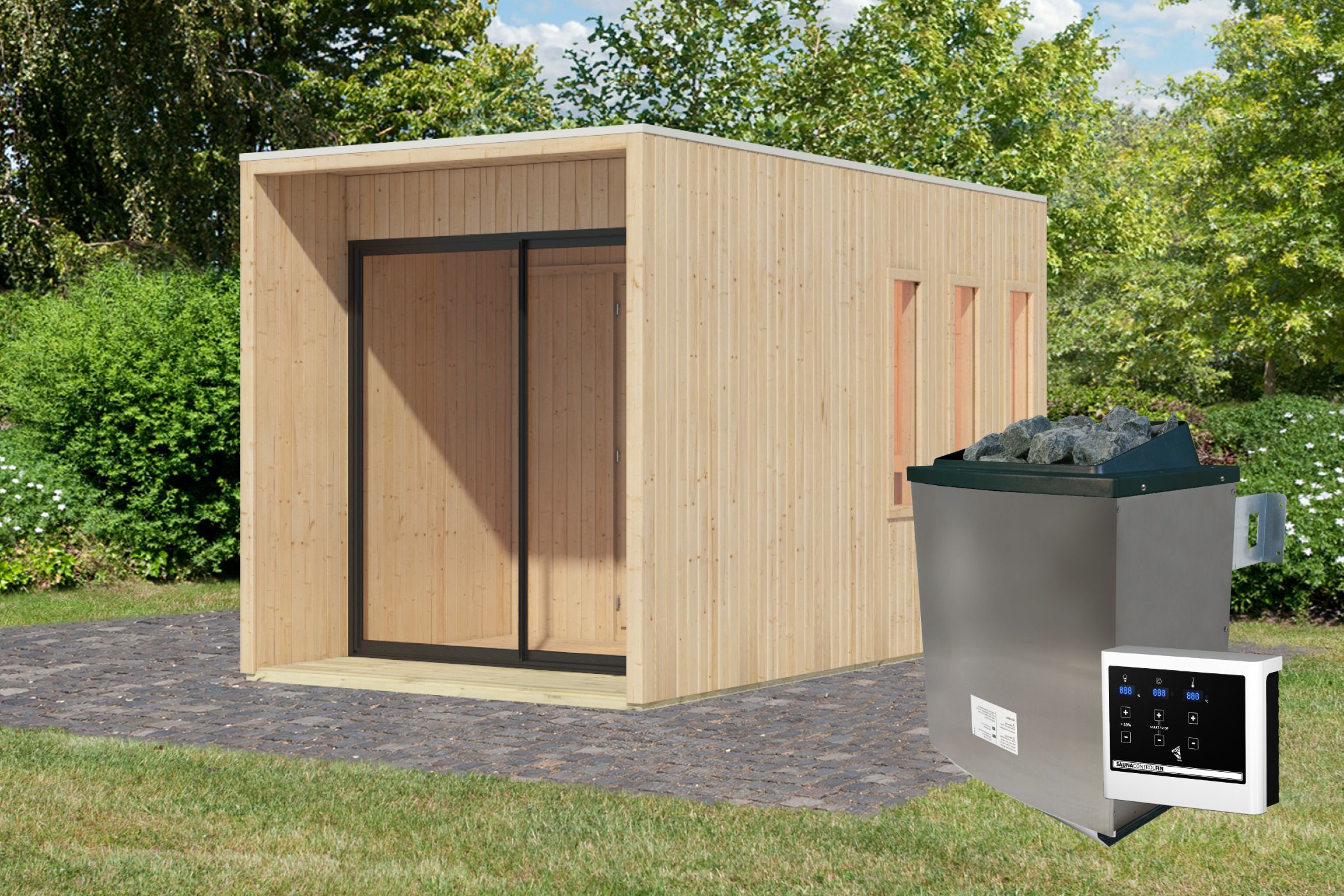 Karibu Gartensauna "Saunahaus Miramar" mit Vorraum 5 Personen Natur 9 kW Ofen (finnisch) + Steuergerät