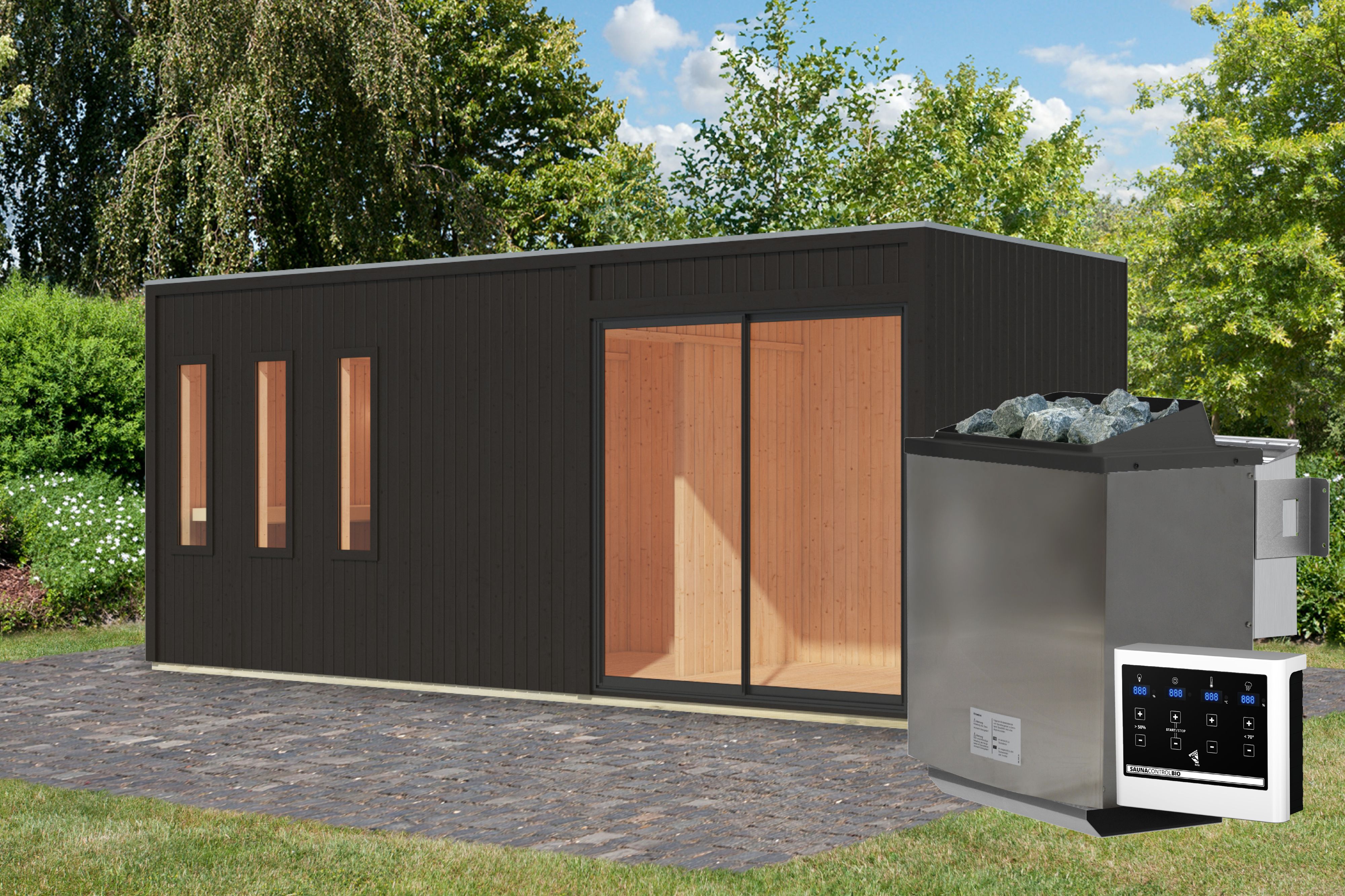 Auf einer Fläche von 574 x 216,5 cm verbindet dieses Saunahaus hochwertige Materialien, zeitgemäße Funktionalität und ein modernes Design zu einem stimmigen Gesamterlebnis. Es ist die perfekte Lösung für alle, die sich nicht nur Entspannung, sondern auch Komfort, Privatsphäre und Vielseitigkeit wünschen.