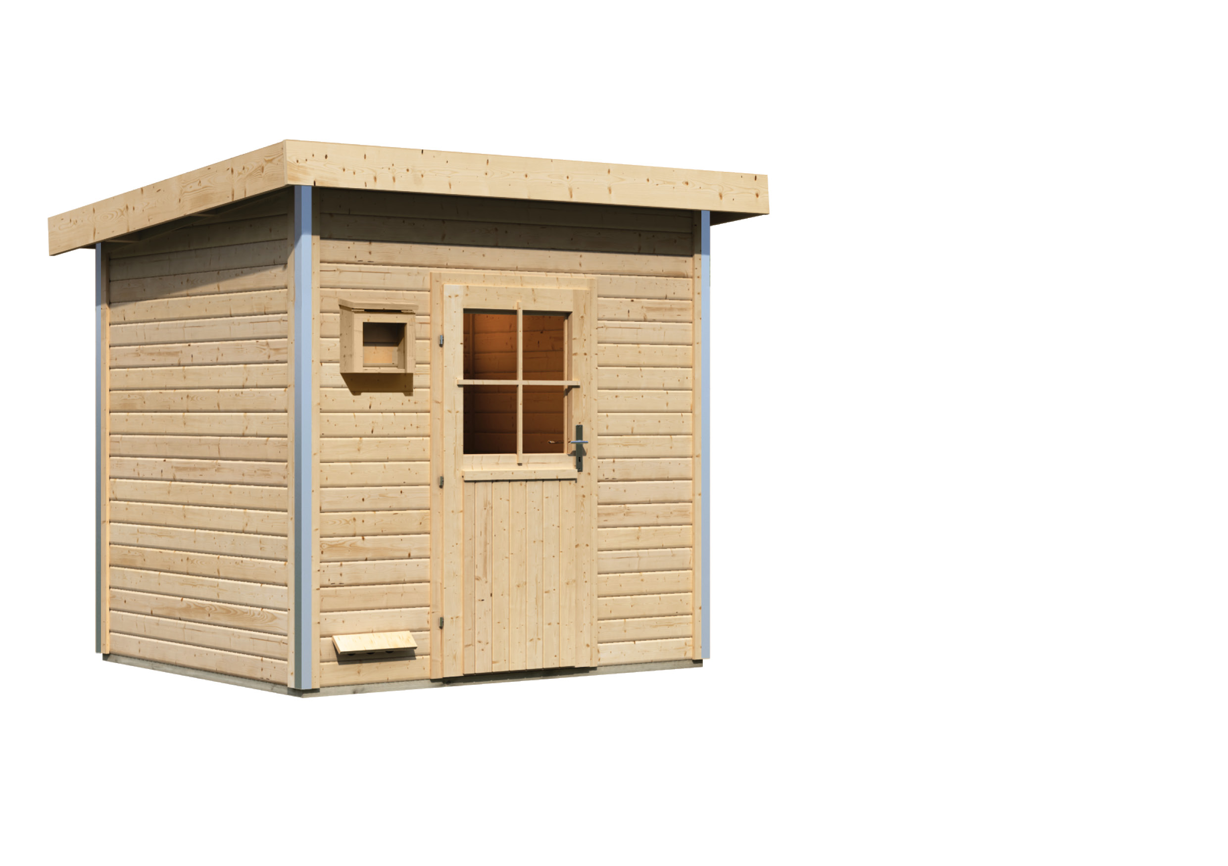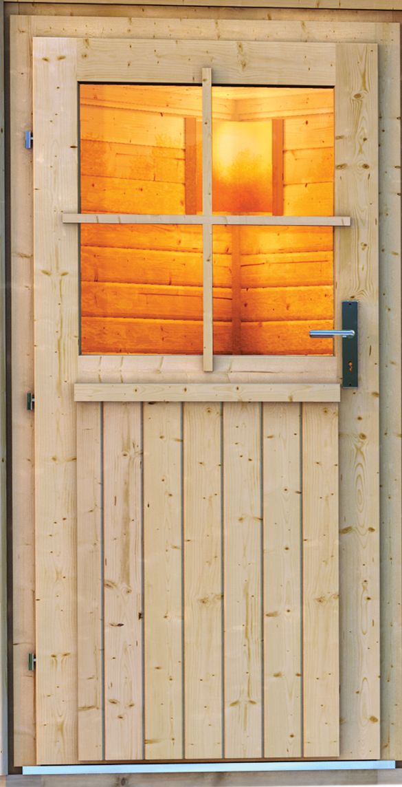 Damit die Wärme im Inneren nicht entweichen kann, wird eine zweite Decke aus einer 42mm starken Rahmenkonstruktion mit Mineraldämmwolle eingezogen. Verschlossen wird die Sauna mithilfe einer Einflügeltür mit Zylinderschloss inkl. drei Schlüsseln. Passen Sie das Saunahaus Ihrem Gartenambiente an und wählen Sie zwischen zwei Türvarianten. Die moderne Einflügeltür besitzt drei Lichtausschnitte aus Isolierglas. Diese lassen Licht in das Innere und sorgen so für eine natürliche Lichtquelle am Tag. Oder vielleicht doch lieber eine Einflügeltür mit zwei länglichen Lichtausschnitten und einem Isolierglas in Milchglasoptik für einen optisch geschlossenen Raum? Hier können Sie ganz nach Ihren Vorlieben entscheiden.
