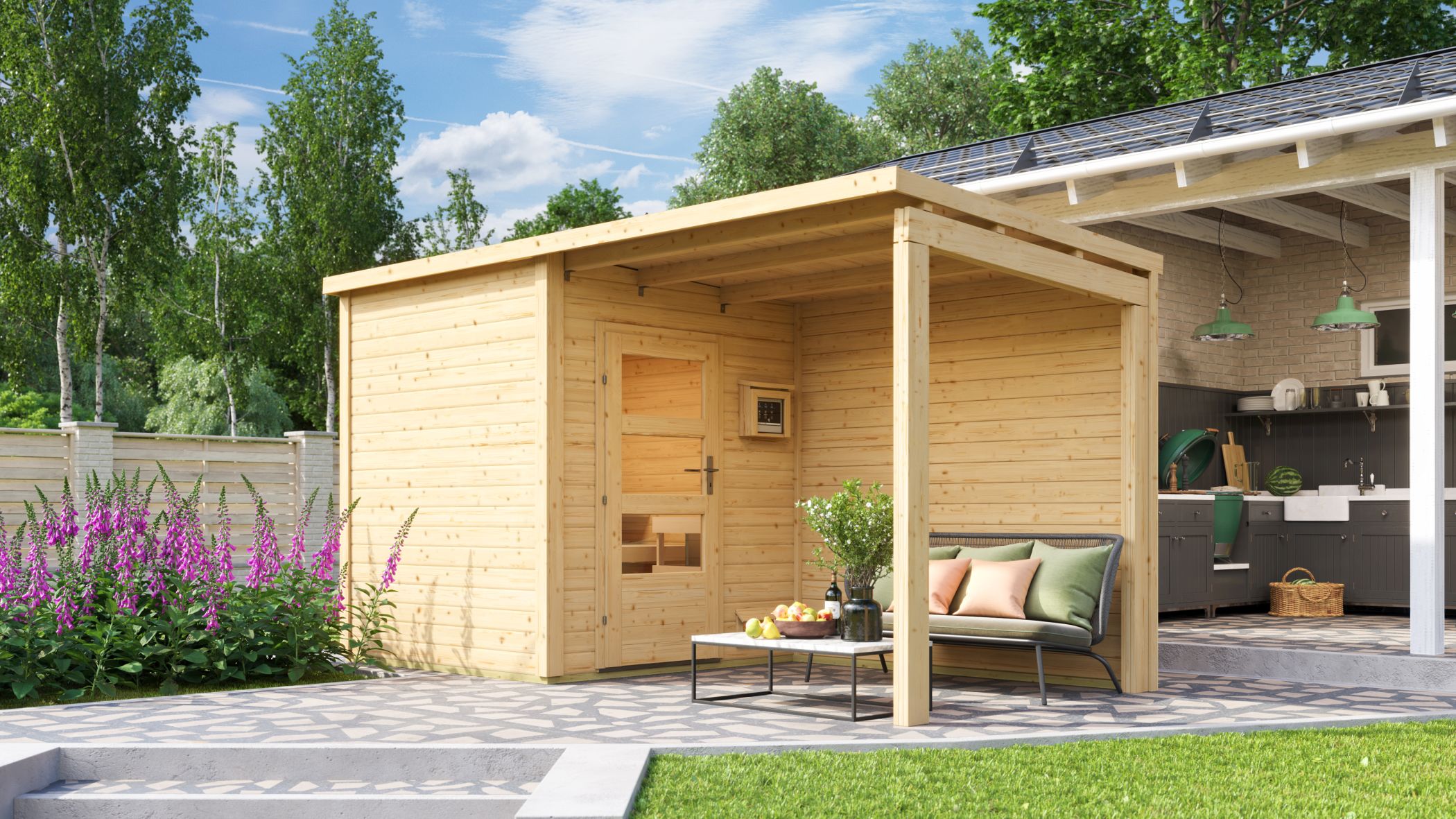 Das Anbaudach mit Rückwand bietet Wind- und Sichtschutz für den Bereich vor Ihrer Sauna. Ein bequemer Liegestuhl für die Entspannung nach dem Saunieren ist hier kaum wegzudenken.