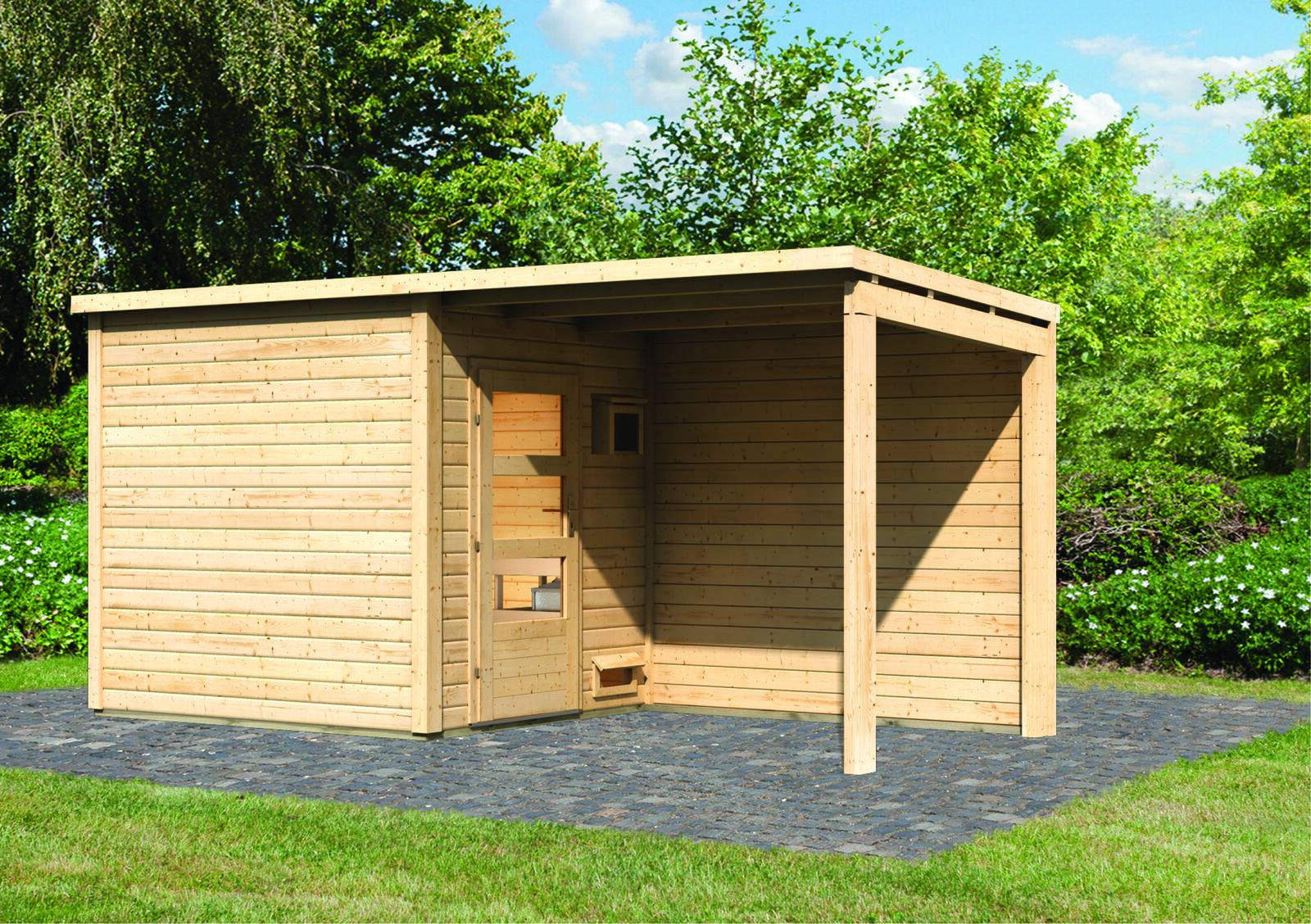 Hinweis: Dacheindeckung und Saunatechnik optional erhältlich (Nicht im Lieferumfang)
