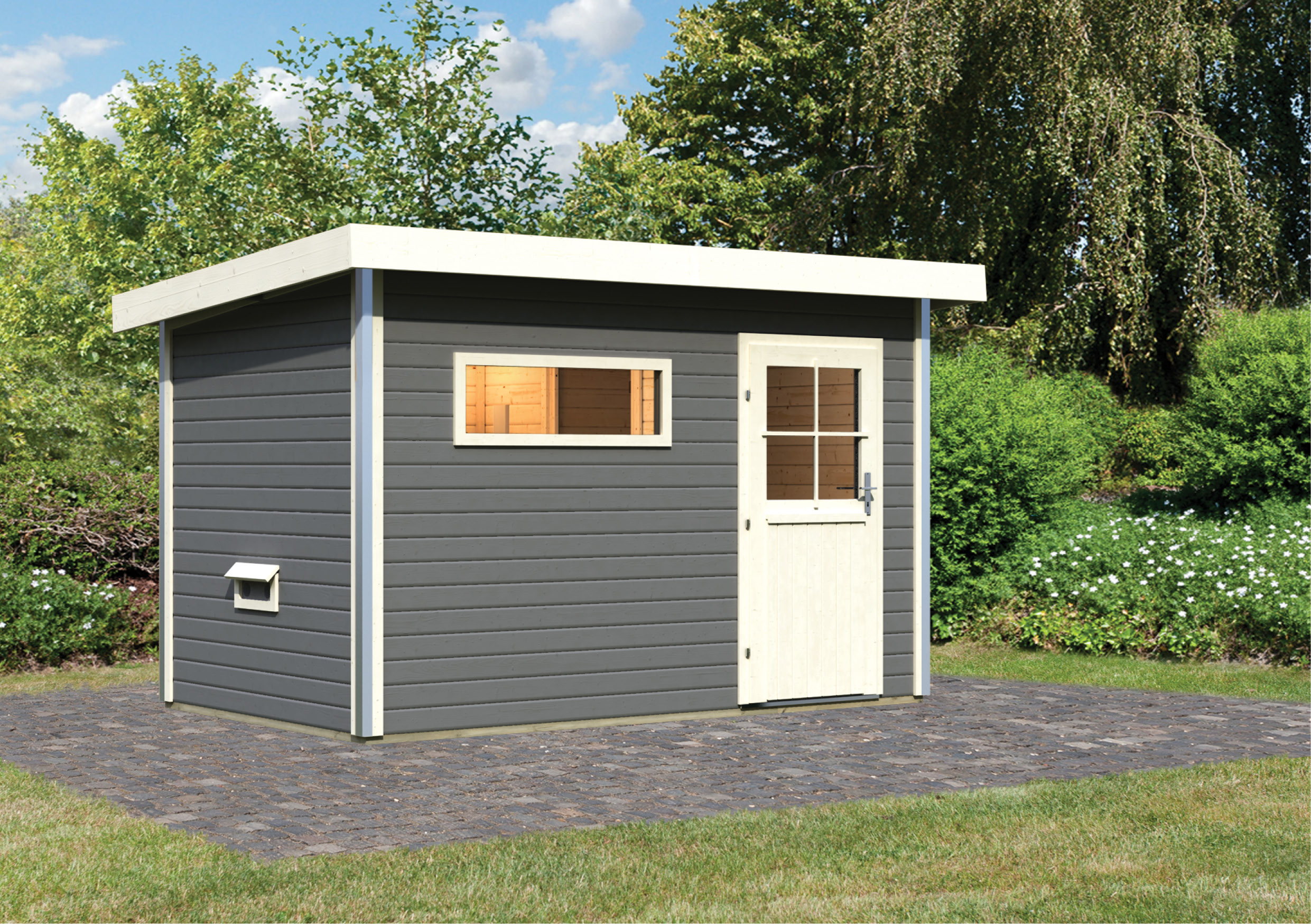 Karibu Gartensauna "Saunahaus Skrollan 1 mit Vorraum" 4 Personen Terragrau ohne Ofen