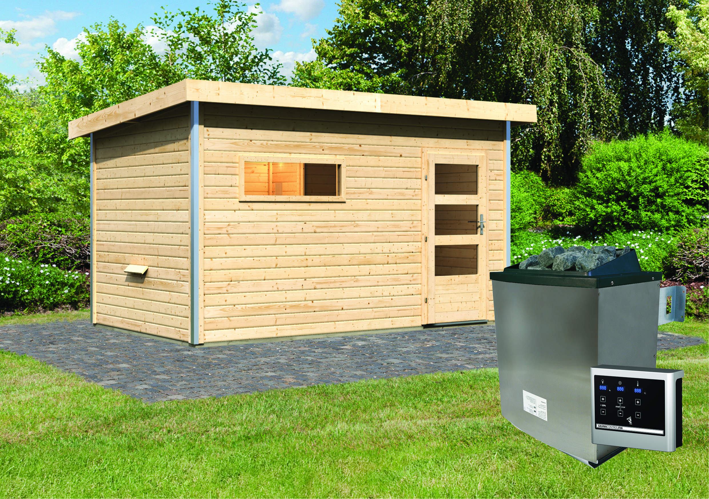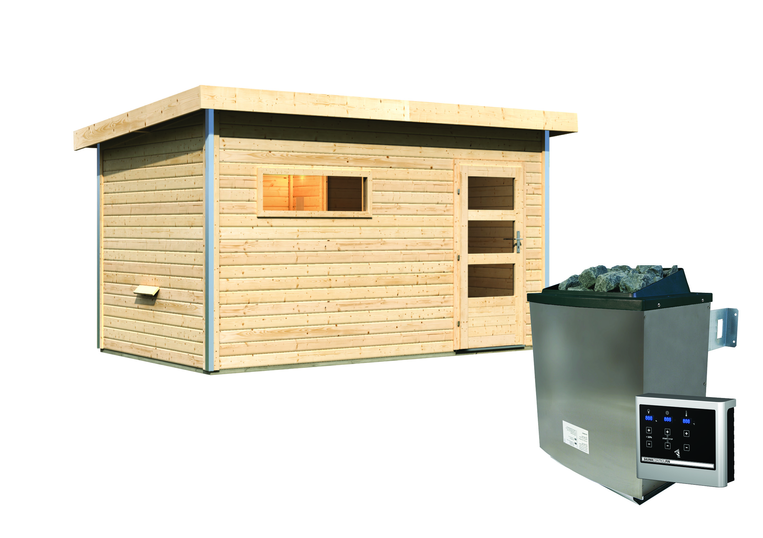 Karibu Gartensauna "Saunahaus Skrollan 3 mit Vorraum" 5 Personen Natur 9 kW Ofen (finnisch) + Steuergerät moderne Tür