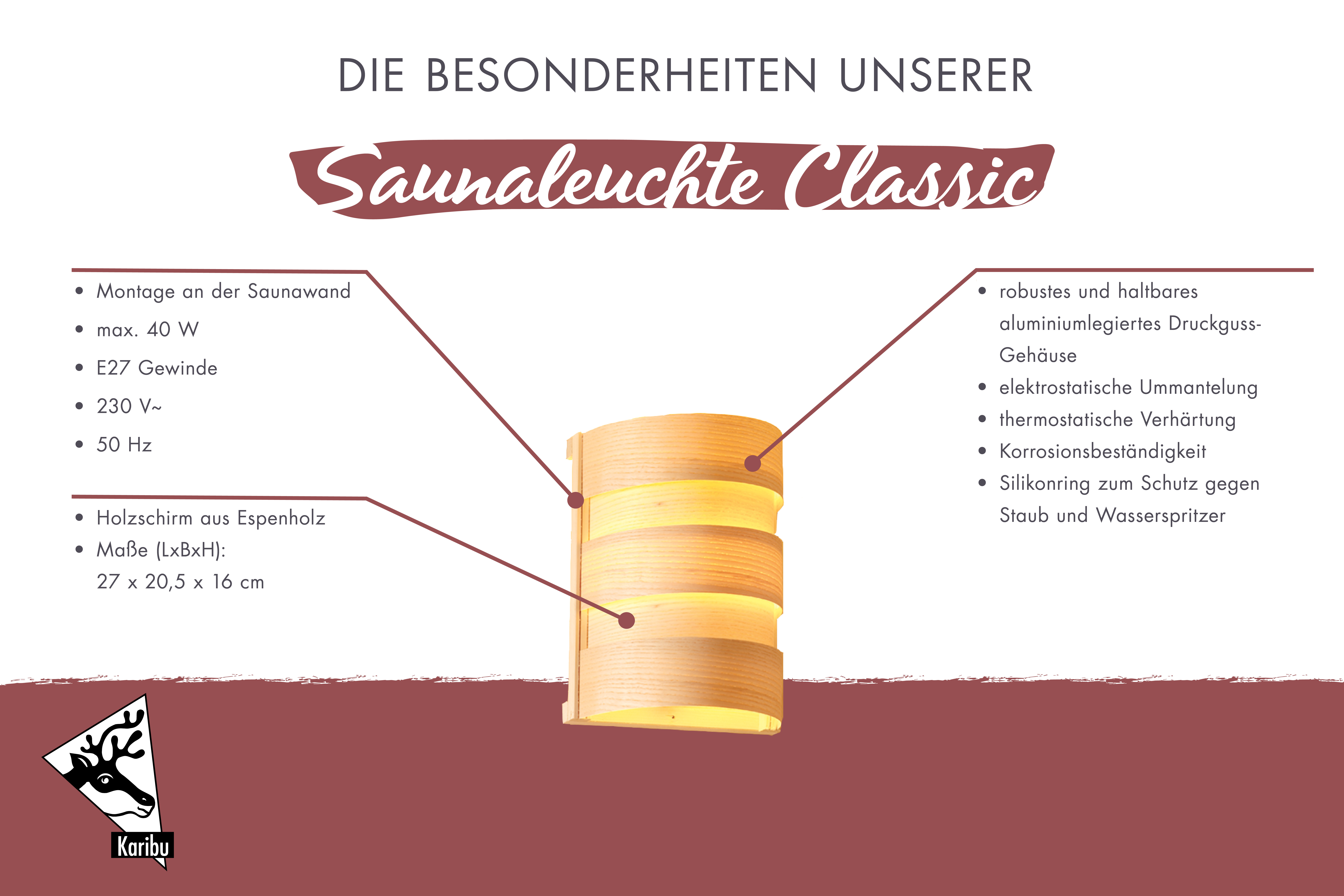 Schaffen Sie sich eine Atmosphäre zum Wohlfühlen und Entspannen Sie in Ihrer Sauna mit der Saunaleuchte Classic. Nicht nur eine schöne Ausstattung oder die Wärme in einer Sauna sorgen dafür, dass wir uns Entspannen können. Auch eine angenehme Lichtquelle trägt zu einem guten Wohlbefinden bei. Hierbei sollte das Licht nicht zu hell sein, damit ein gemütliches, ruhiges Ambiente entstehen kann. Andererseits sollte das Licht aber auch nicht zu Dunkel sein, um die Stimmung nicht zu trüben. Genau den Mittelweg schaffen Sie mit der Saunaleuchte Classic. Merkmale der Saunaleuchte Classic Die Saunaleuchte besteht aus einem Holzschirm aus Espenholz, der sich perfekt an die Inneneinrichtung der Sauna anpasst. Durch das dünne Holz wird das Licht in der gesamten Saunakabine verteilt und schafft zusätzlich ein warmes Ambiente. Die Leuchte besitzt eine Größe von (LxBxH) 27x20,5x16 cm und passt so in jede Karibu-Sauna. Die Saunaleuchte wird an der Saunawand montiert. Hierbei bleibt die Entscheidung der Platzwahl bei Ihnen. Entspannen Sie sich bei einem perfekten Lichtverhältnis mit der Saunaleuchte Classic.